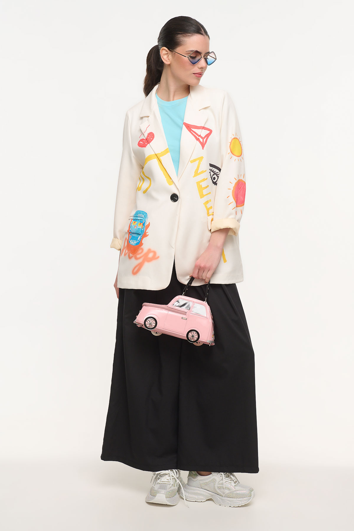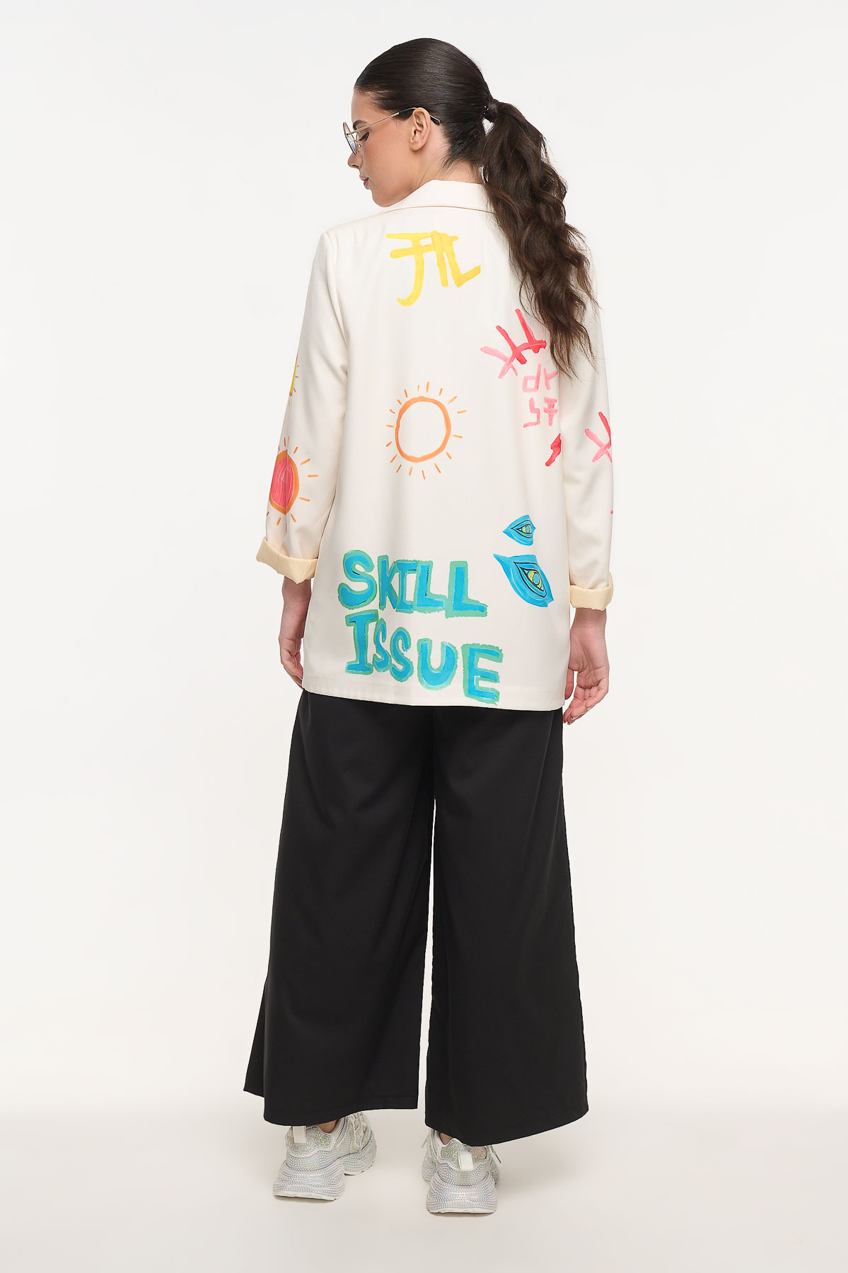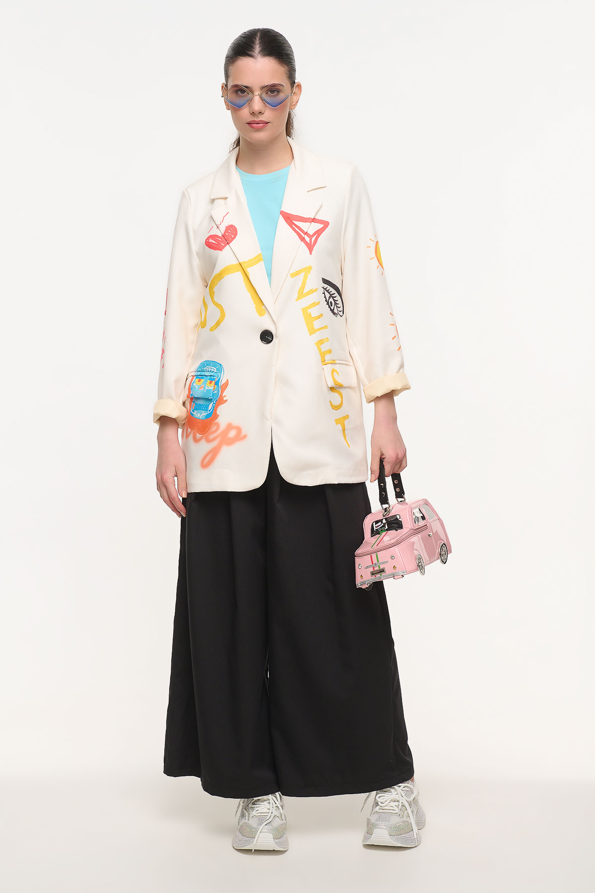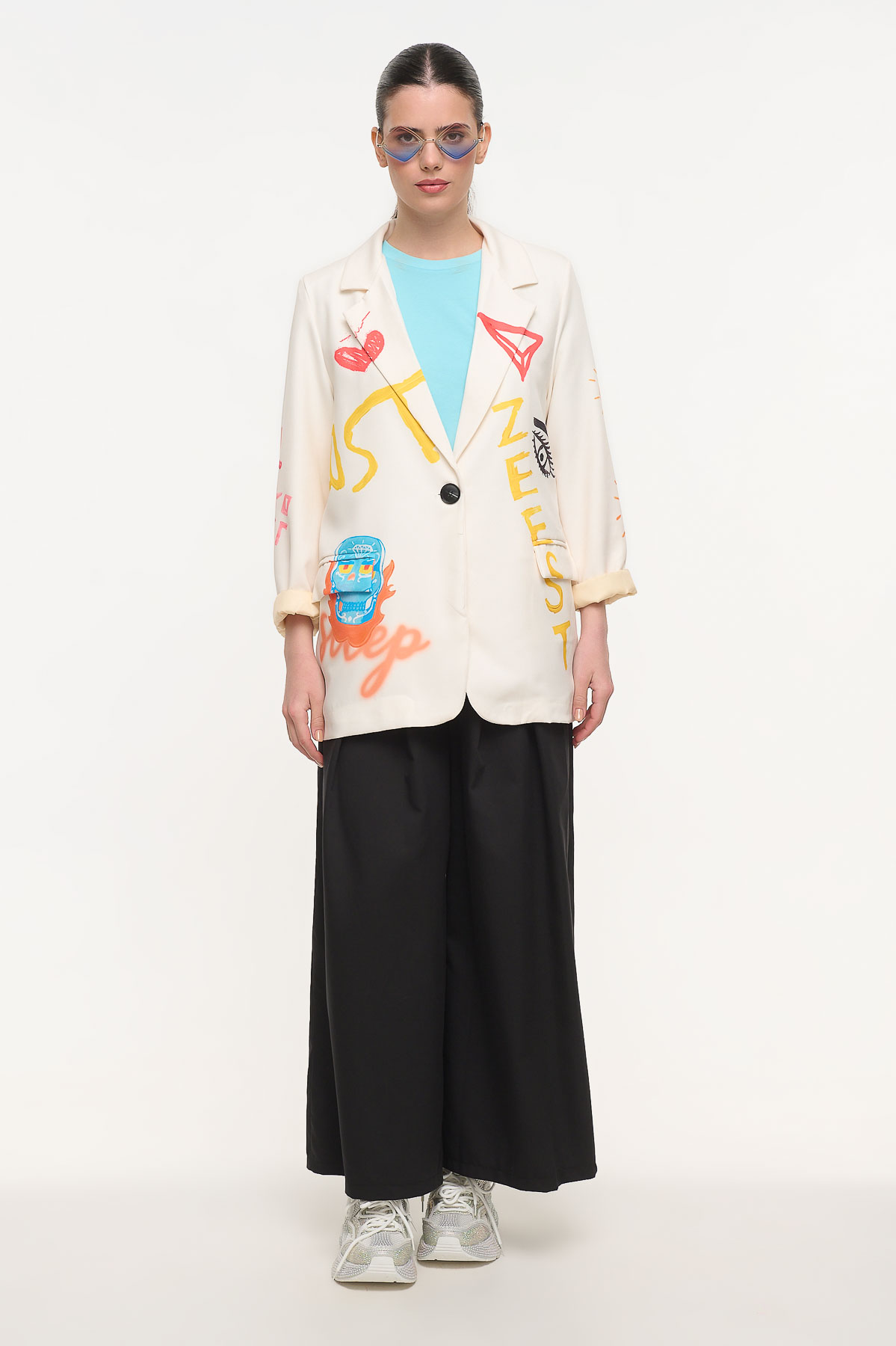 Oversized σακάκι με ιδιαίτερο artistic print που συνδυάζει μοντέρνα αισθητική και statement χαρακτήρα. Τα ζωγραφικά μοτίβα, τα χρώματα και τα γραφιστικά στοιχεία δημιουργούν ένα ξεχωριστό κομμάτι που αναβαθμίζει κάθε εμφάνιση. Η χαλαρή γραμμή χαρίζει άνεση και σύγχρονο στυλ, ενώ οι βάτες στους ώμους προσθέτουν δομή και κομψότητα στη σιλουέτα. Διαθέτει εσωτερική φόδρα για καλύτερη εφαρμογή και πρακτικές μπροστινές τσέπες. Φοριέται εύκολα από το πρωί έως το βράδυ, πάνω από t-shirts, tops ή φορέματα, δημιουργώντας fashion-forward looks. Είναι one size και έχει μήκος 83 cm, ιδανικό για άνετη και μοντέρνα εφαρμογή.