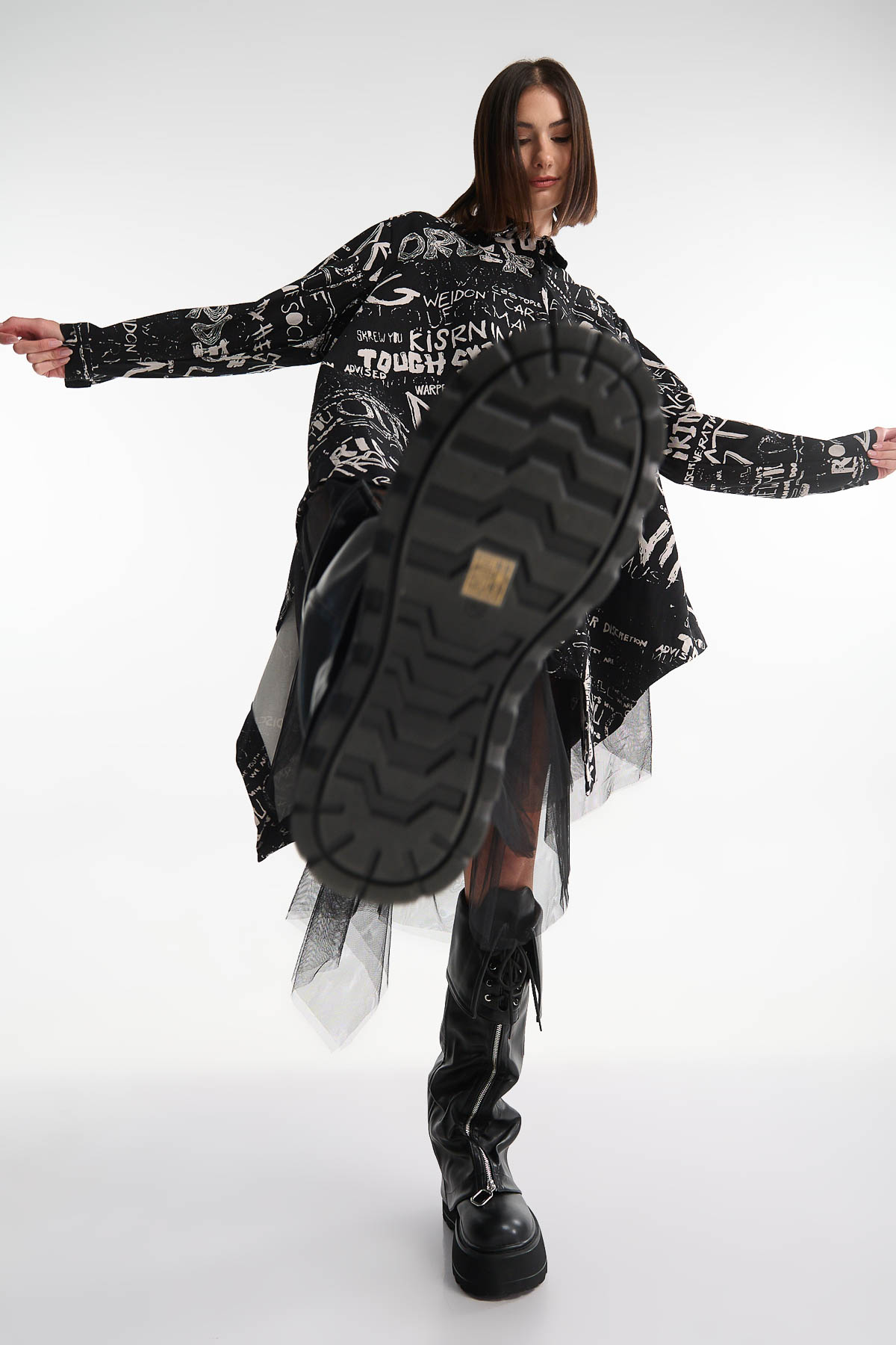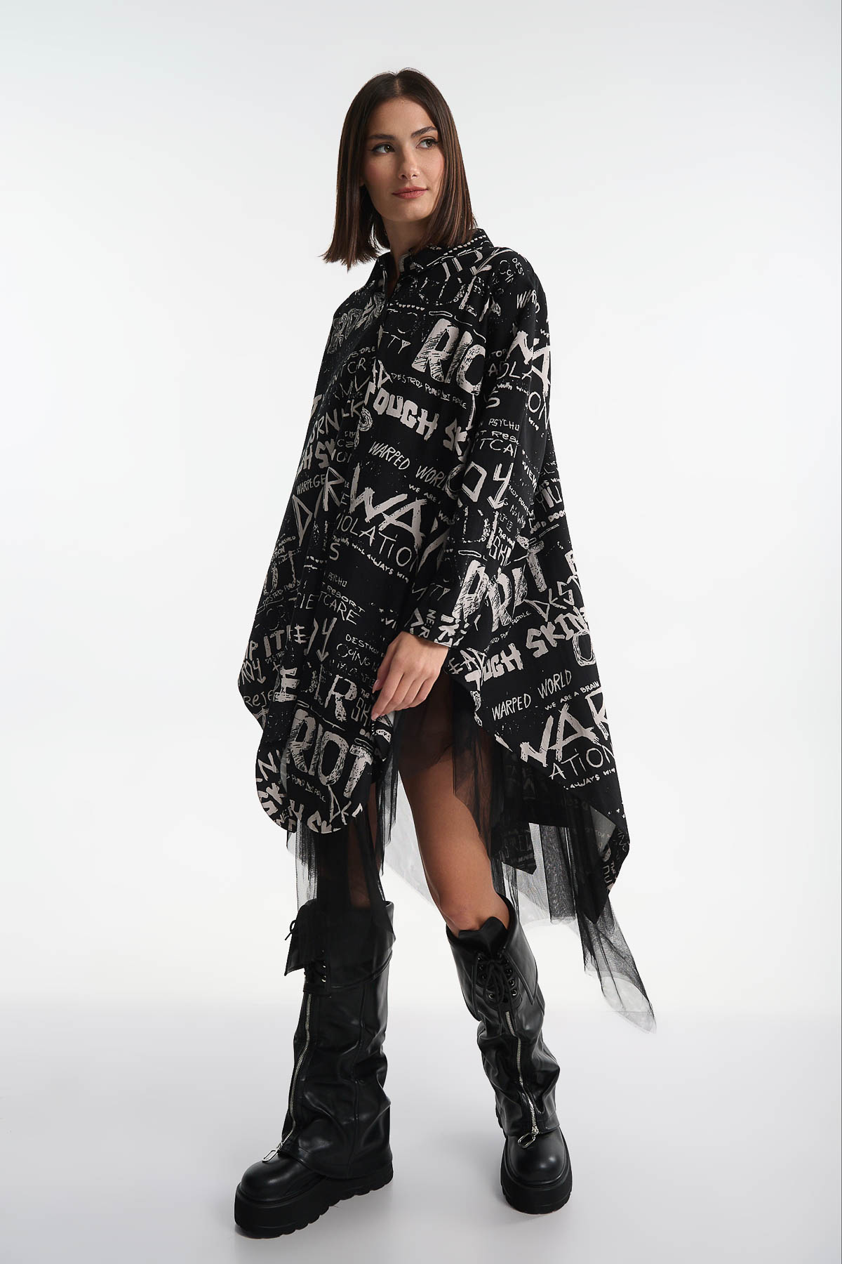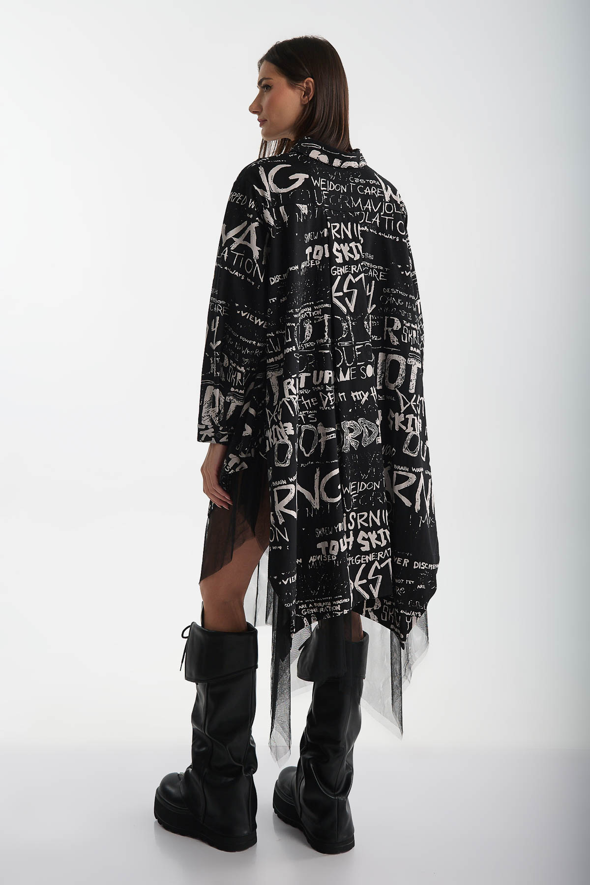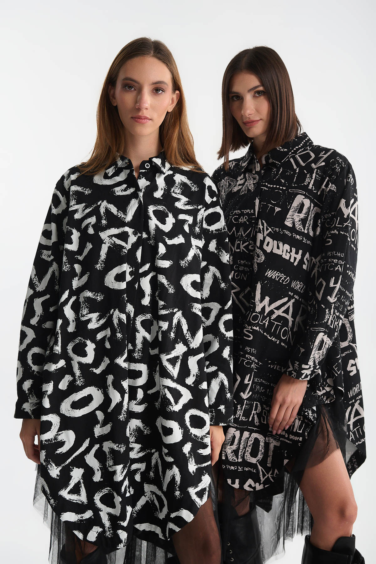 Πρόκειται για ένα ασύμμετρο πουκαμισοφόρεμα με δυναμικό graffiti print σε λευκό και μαύρο, που του χαρίζει μία edgy, street-style ενέργεια. Η υφή του denim σε συνδυασμό με το τούλι που ξεπροβάλλει διακριτικά στο τελείωμα, δημιουργούν ένα εντυπωσιακό layering effect που προσθέτει βάθος και κίνηση στο look.Η loose, oversized γραμμή του το καθιστά άνετο αλλά και εξαιρετικά statement, ενώ τα έντονα τυπωμένα γράμματα φέρνουν μία αίσθηση rebellion και δυναμισμού. Ιδανικό για γυναίκες που αγαπούν τη μόδα με χαρακτήρα και δεν φοβούνται να ξεχωρίσουν. Καλύπτει στήθος έως 132 cm . Σύνθεση : 100% Cotton .
