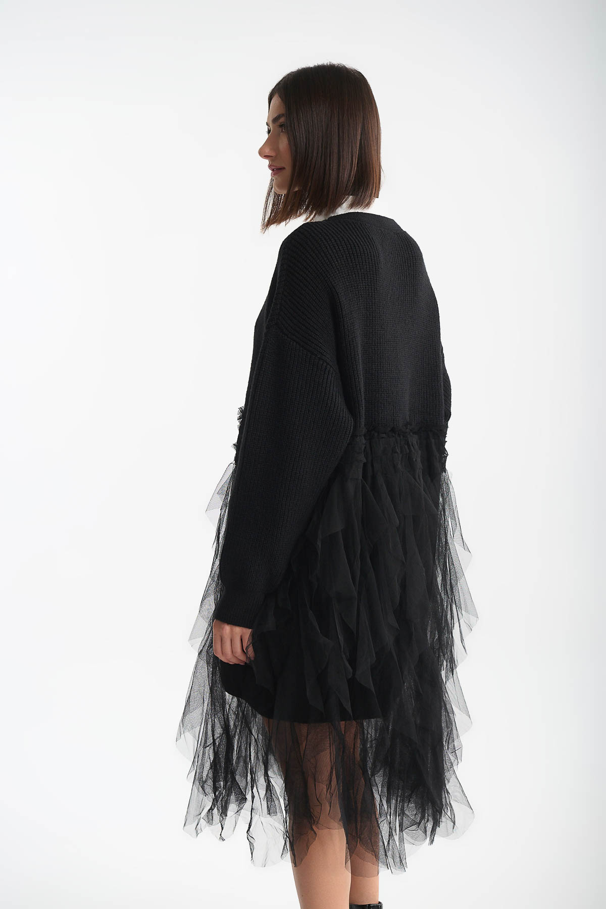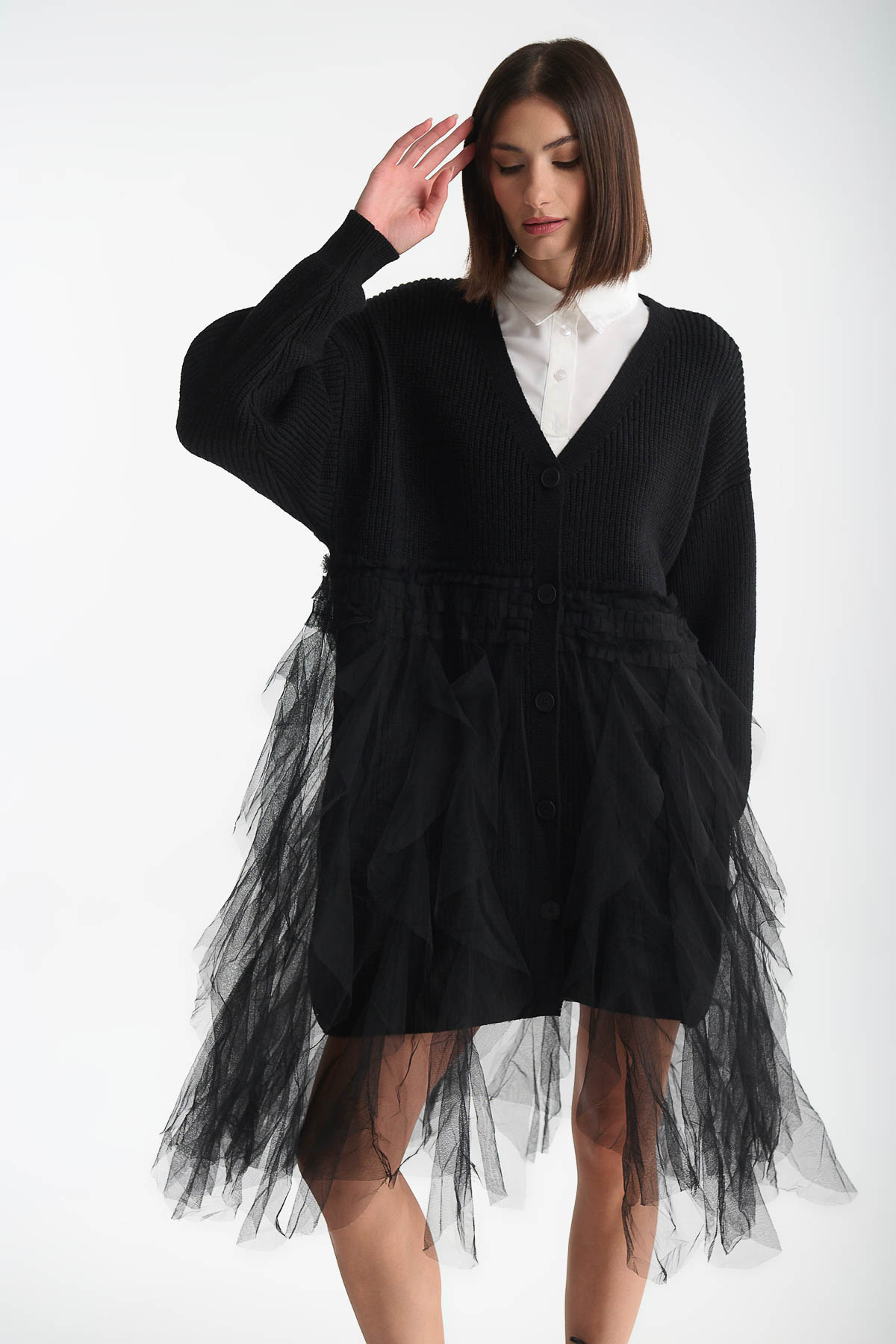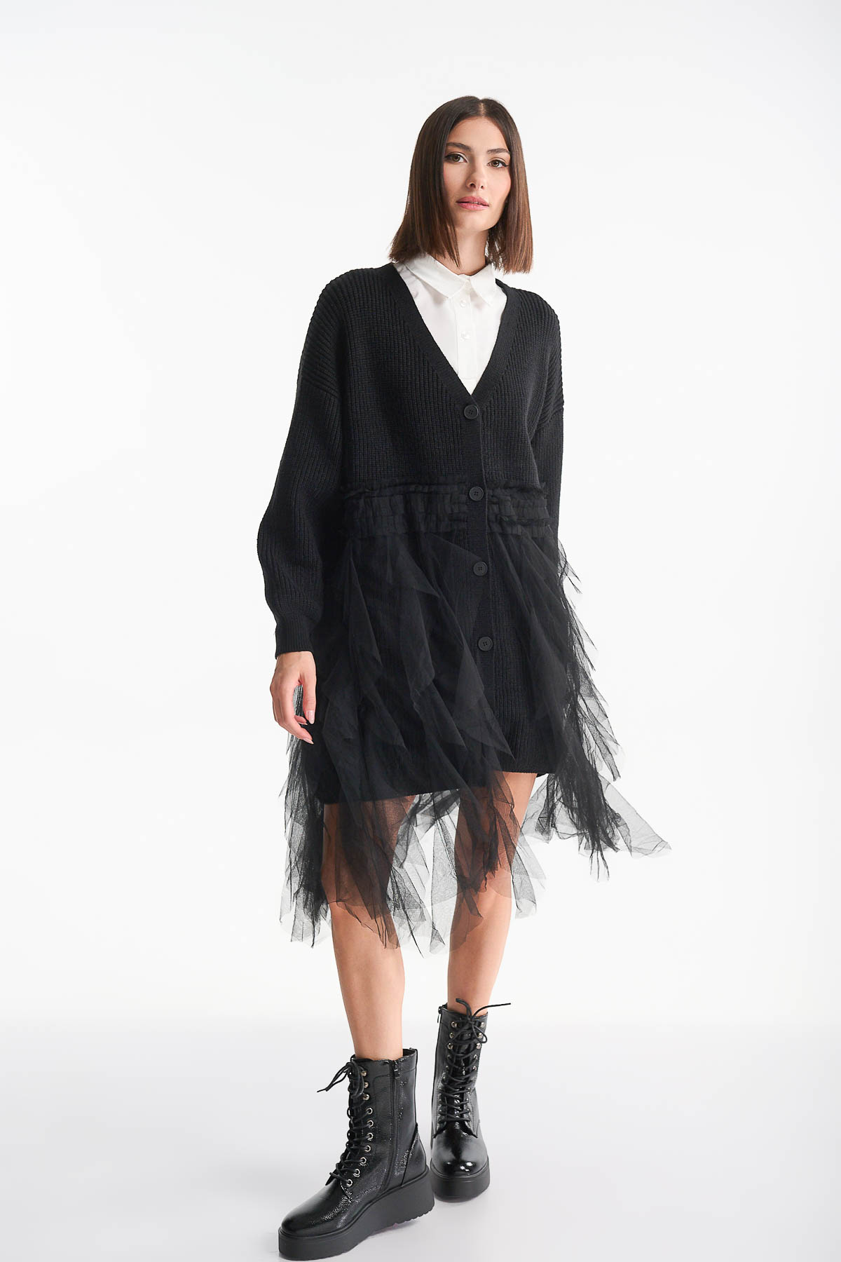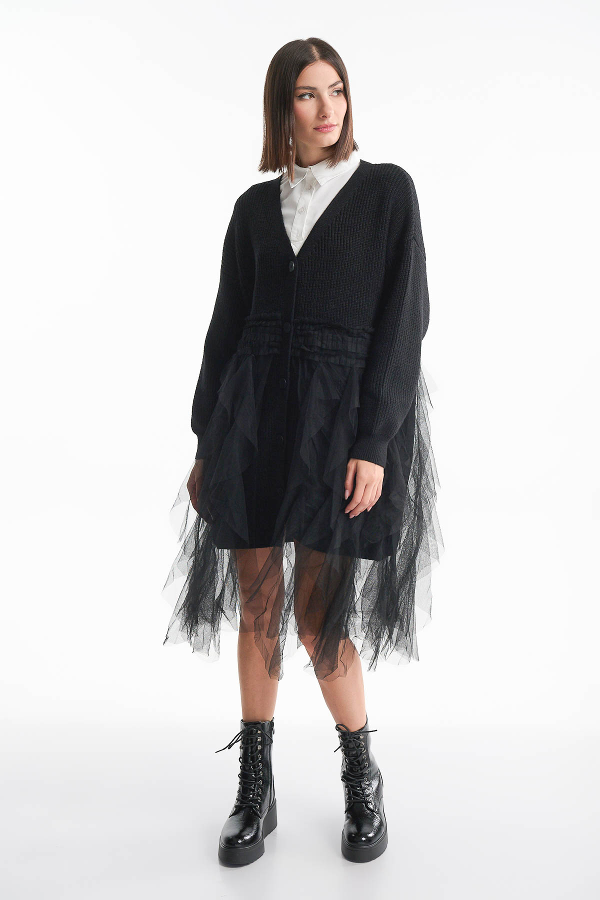 Το μαύρο knitwear φόρεμα με τούλι συνδυάζει το cozy στοιχείο του πλεκτού με την αέρινη, ρομαντική διάθεση του τούλι. Το επάνω μέρος είναι ζεστό και minimal, με κλασικό V κόψιμο και κουμπιά, ενώ το κάτω μέρος κλέβει την παράσταση με layers από ημιδιάφανο τούλι που προσθέτουν κίνηση και αίσθηση πολυτέλειας.Ένα fashion statement κομμάτι που ισορροπεί ανάμεσα στο street style και την υψηλή αισθητική, κάνοντάς το ιδανικό για τις μέρες που θέλετε να ξεχωρίσετε. Μήκος : 90 cm . Καλύπτει στήθος έως 140 cm . Σύνθεση : 42% Acrylic – 30% Polyester – 28% Nylon.