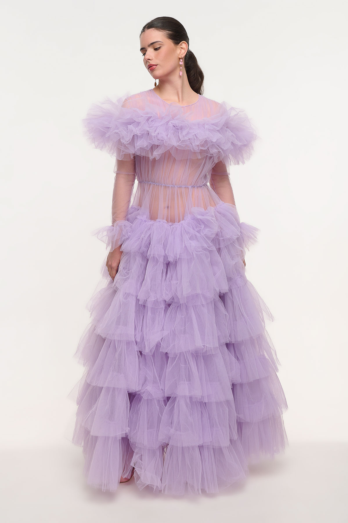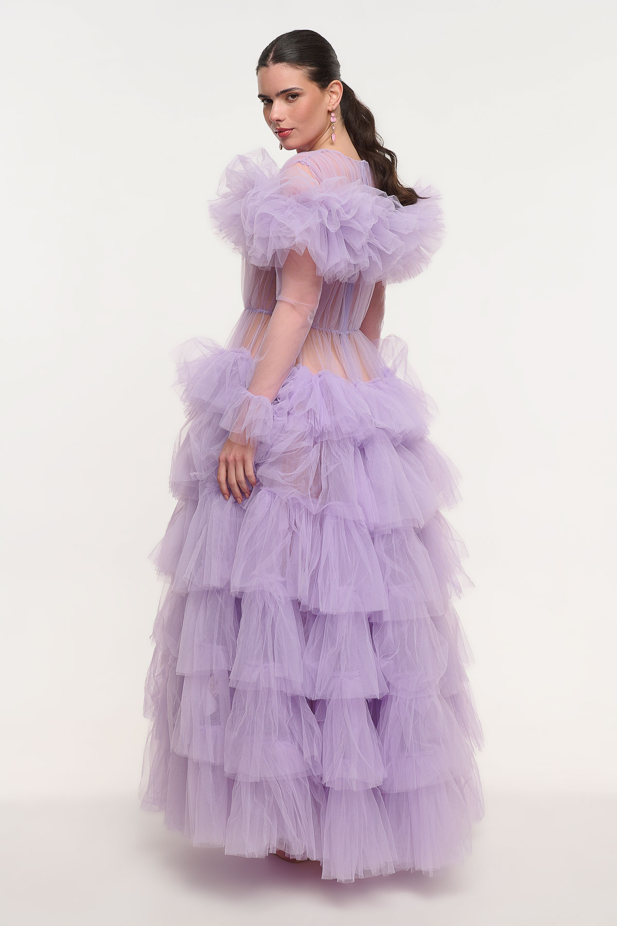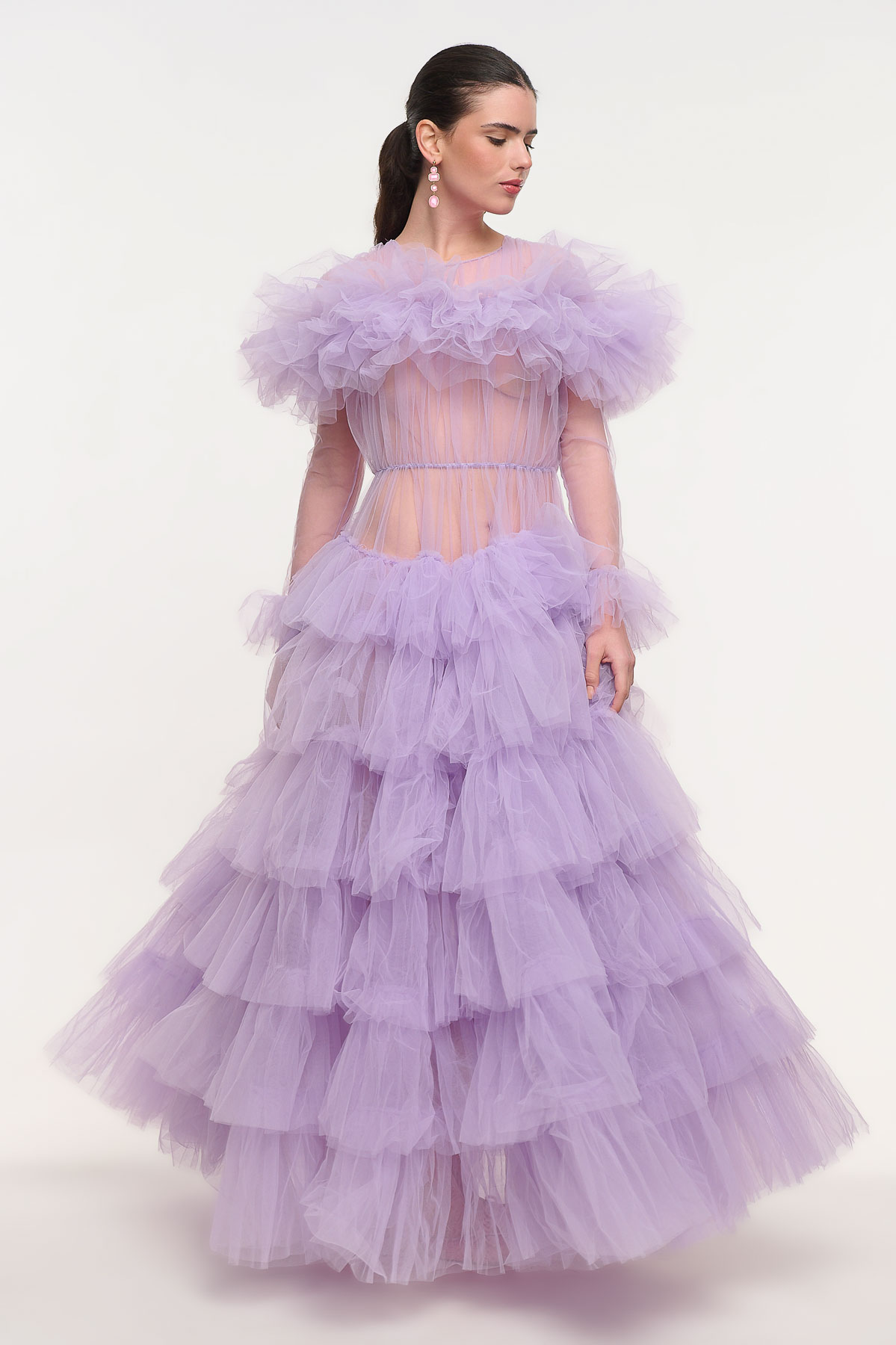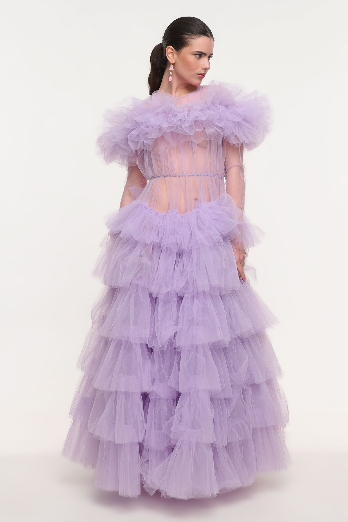 Εντυπωσιακό maxi φόρεμα από τούλι που αποπνέει ρομαντισμό και υψηλή αισθητική. Το επάνω μέρος διαθέτει διαφάνεια στο μπούστο και στα μανίκια, δημιουργώντας ένα κομψό και αέρινο αποτέλεσμα, ενώ το πλούσιο ντεκολτέ από τούλι χαρίζει ιδιαίτερο όγκο και θεατρικό χαρακτήρα.