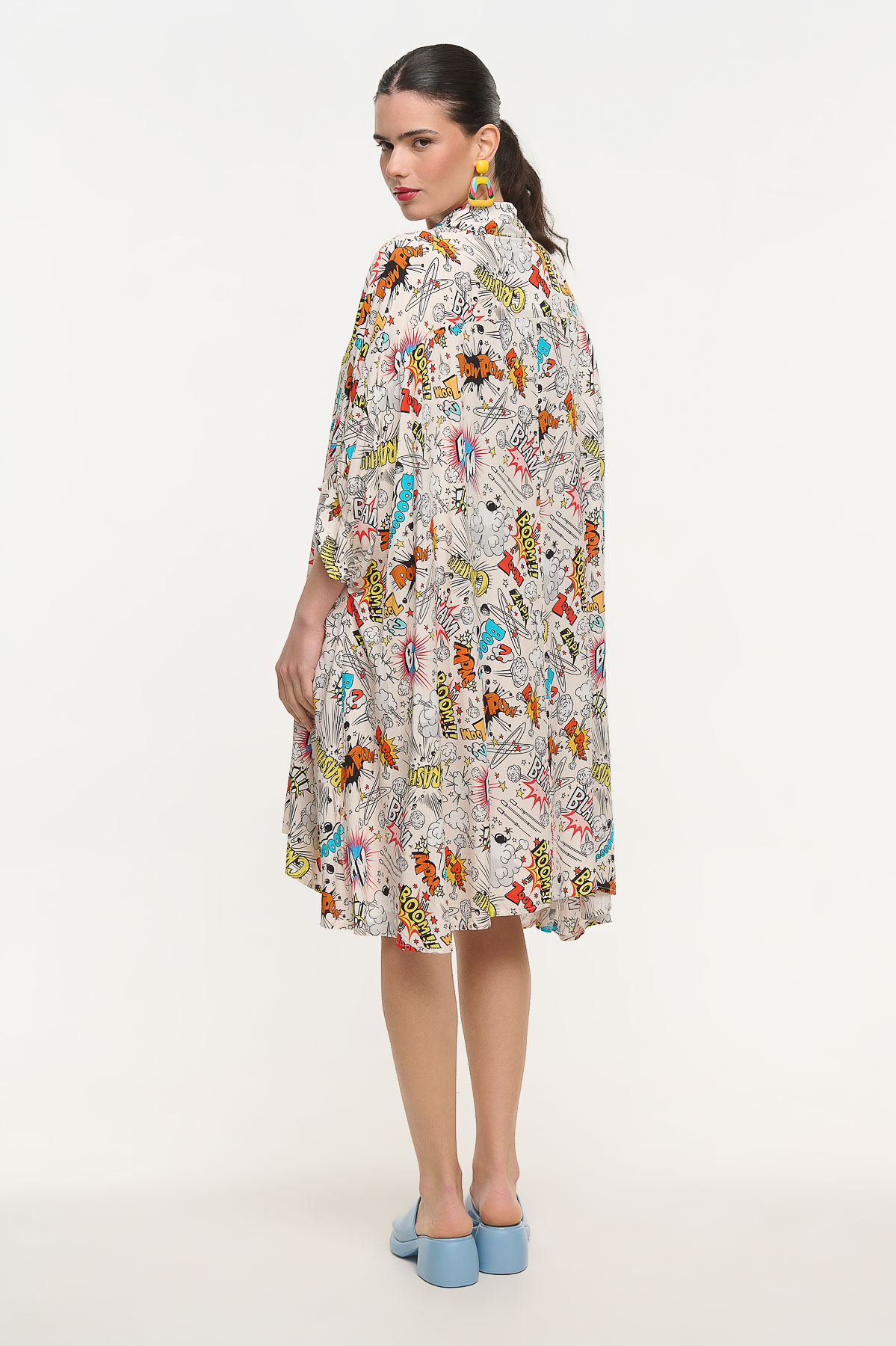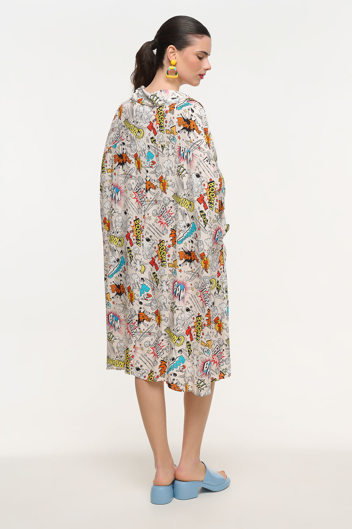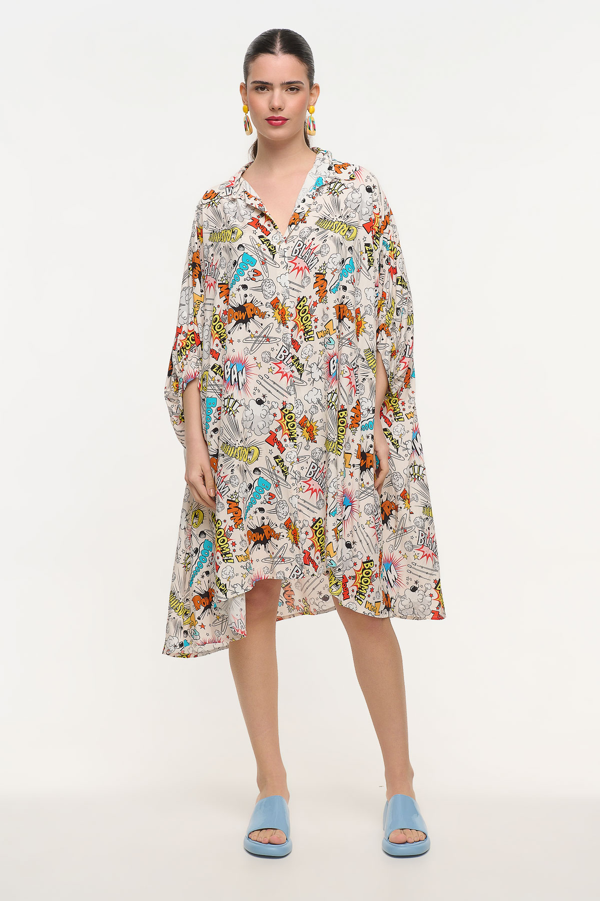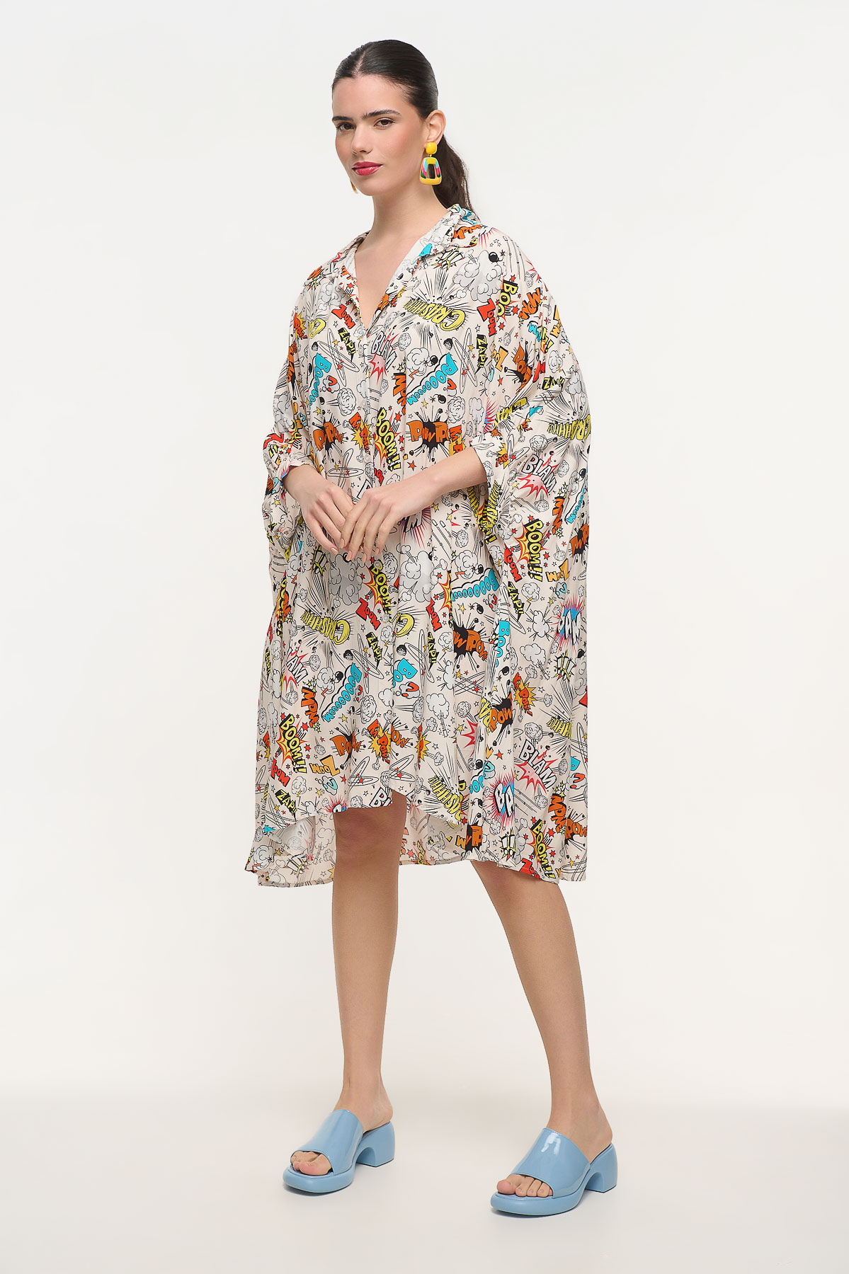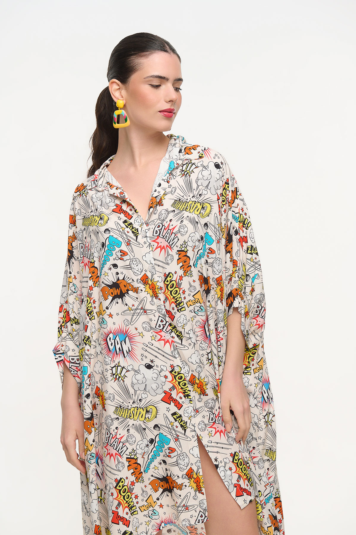 Oversized shirt dress με ιδιαίτερο comic print εμπνευσμένο από τον κόσμο της pop art και των κλασικών comics. Τα γραφιστικά στοιχεία δημιουργούν ένα δυναμικό και παιχνιδιάρικο αποτέλεσμα που τραβάει τα βλέμματα. Η χαλαρή oversized γραμμή προσφέρει άνεση και αέρινη κίνηση, ενώ ο γιακάς και το πουκαμισένιο ύφος δίνουν μια κομψή ισορροπία στο έντονο σχέδιο. Είναι one size και καλύπτει μεγέθη από XS έως 2XL, προσφέροντας ευελιξία στην εφαρμογή. Με μήκος 110 cm αποτελεί ιδανική επιλογή για καθημερινές εμφανίσεις με μοντέρνο χαρακτήρα και ξεχωριστό στυλ.
