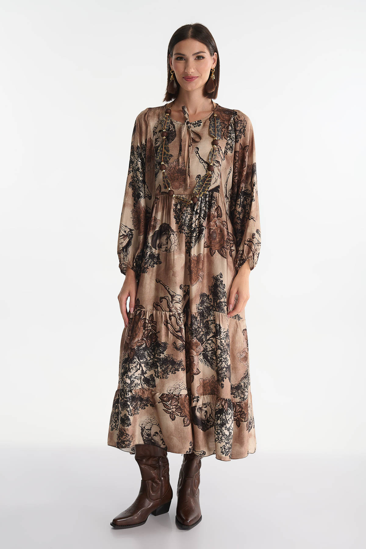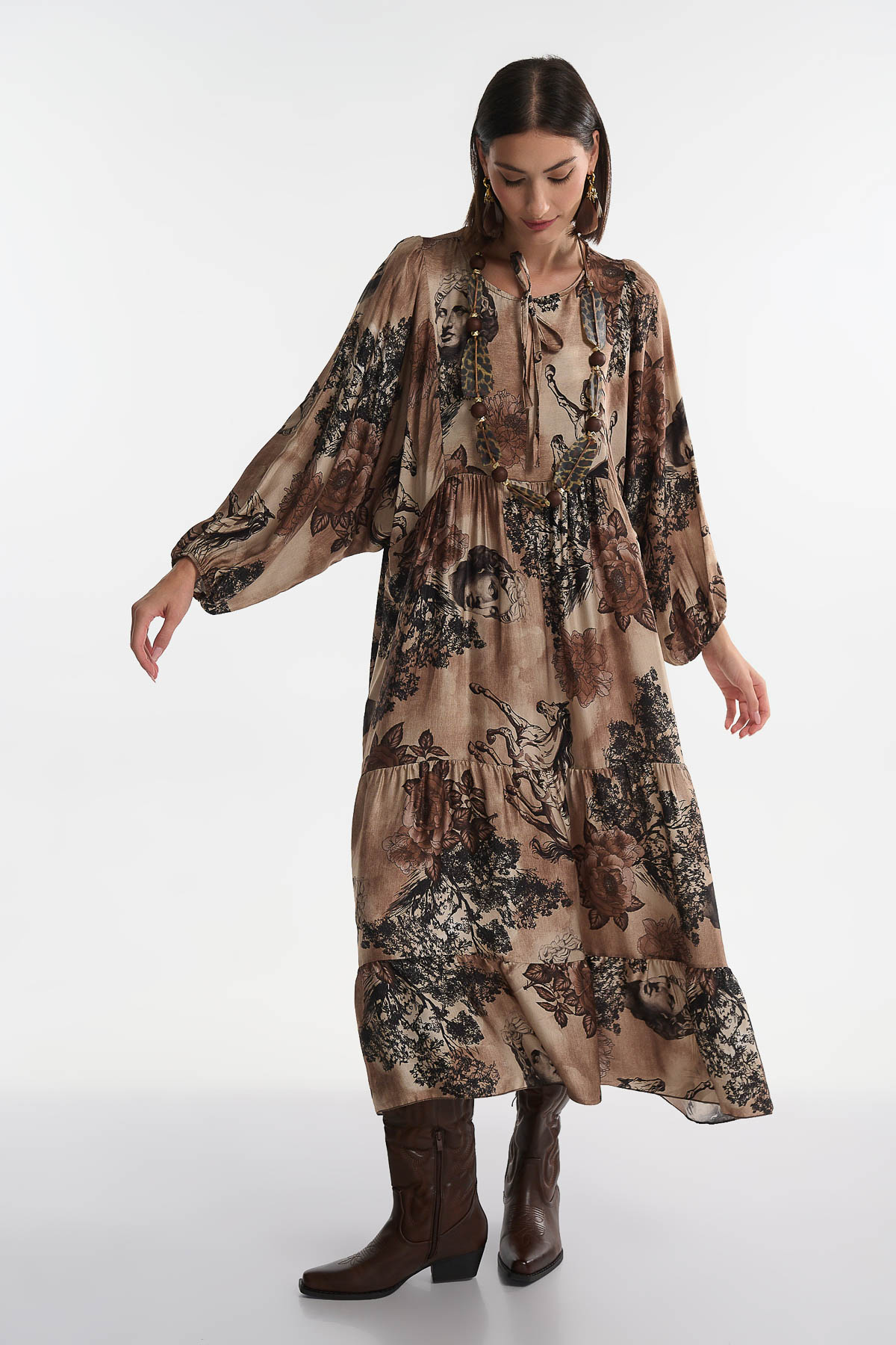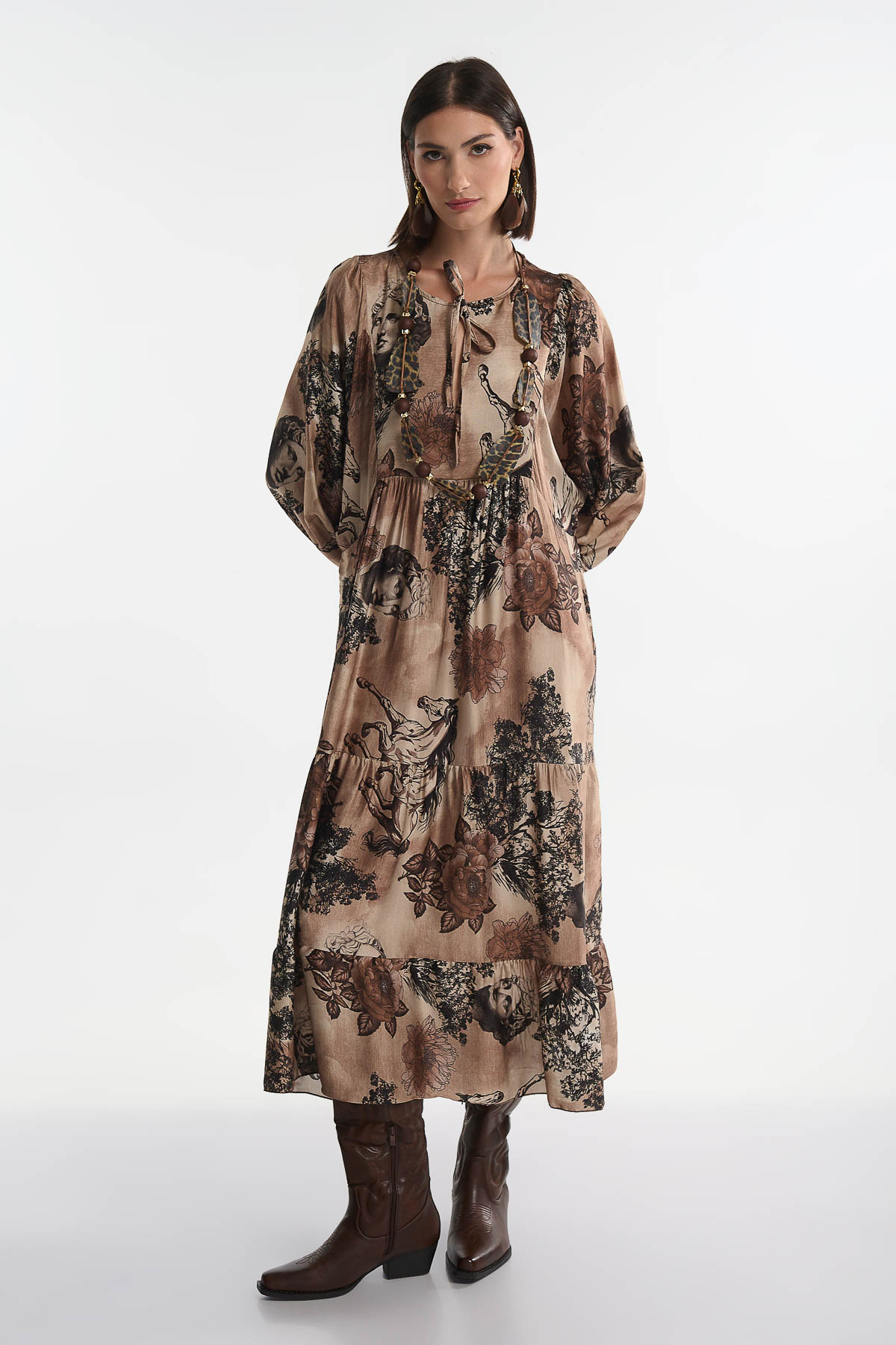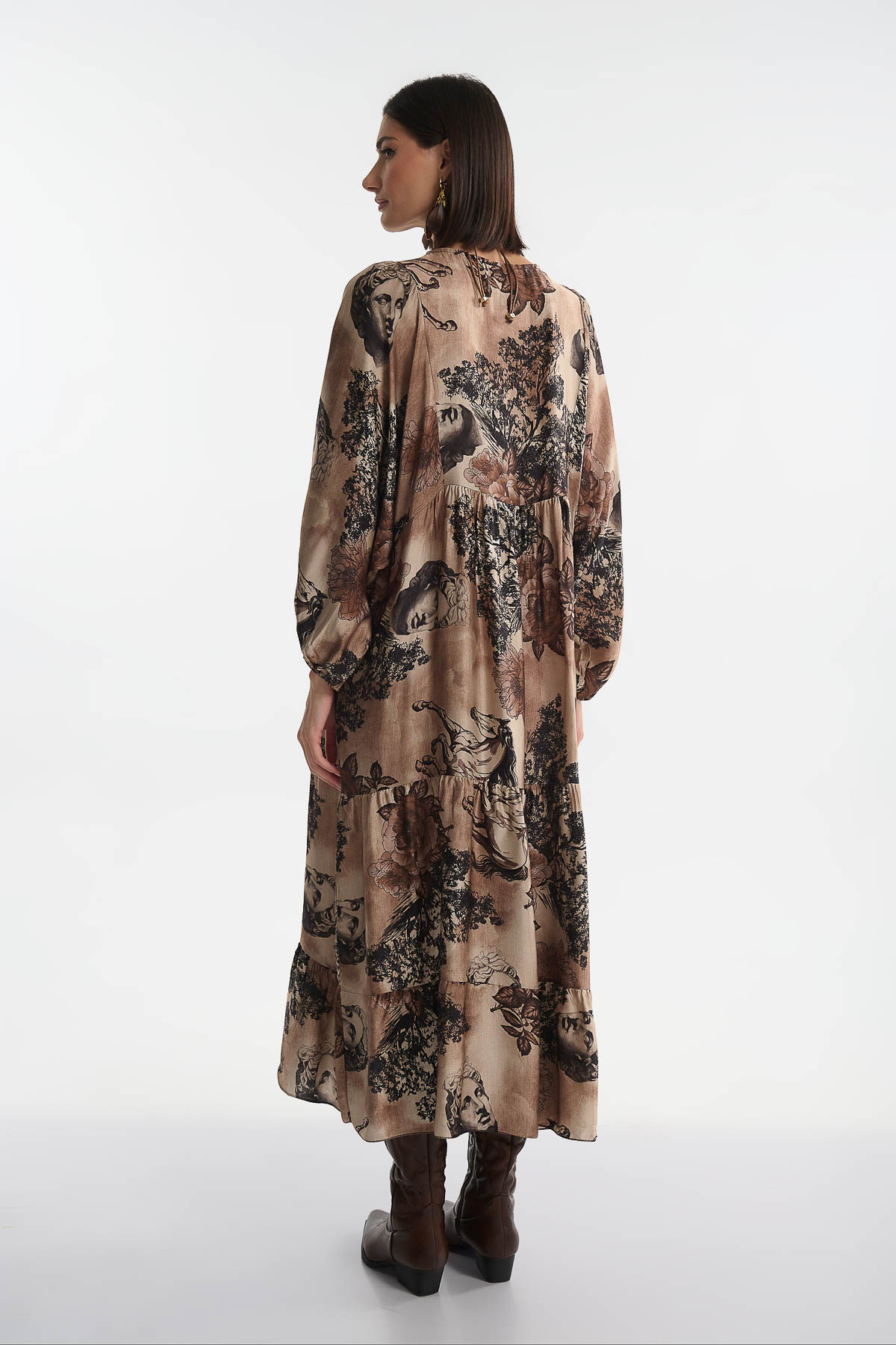 Αναδείξτε το στυλ σας με αυτό το εντυπωσιακό maxi φόρεμα από μετάξι, με μοναδικά καλλιτεχνικά prints που συνδυάζουν ρομαντισμό και μοντέρνα αισθητική. Διαθέτει V λαιμόκοψη και αέρινη γραμμή που αγκαλιάζει το σώμα, προσφέροντας κίνηση και άνεση. Τα balloon μανίκια και η ρευστή υφή του το καθιστούν ιδανικό για εντυπωσιακές εμφανίσεις από το πρωί μέχρι το βράδυ. • Υλικό: 70% Βισκόζη – 30% Μετάξι • V λαιμόκοψη • Μήκος : 128 cm • Στήθος έως 120 cm .