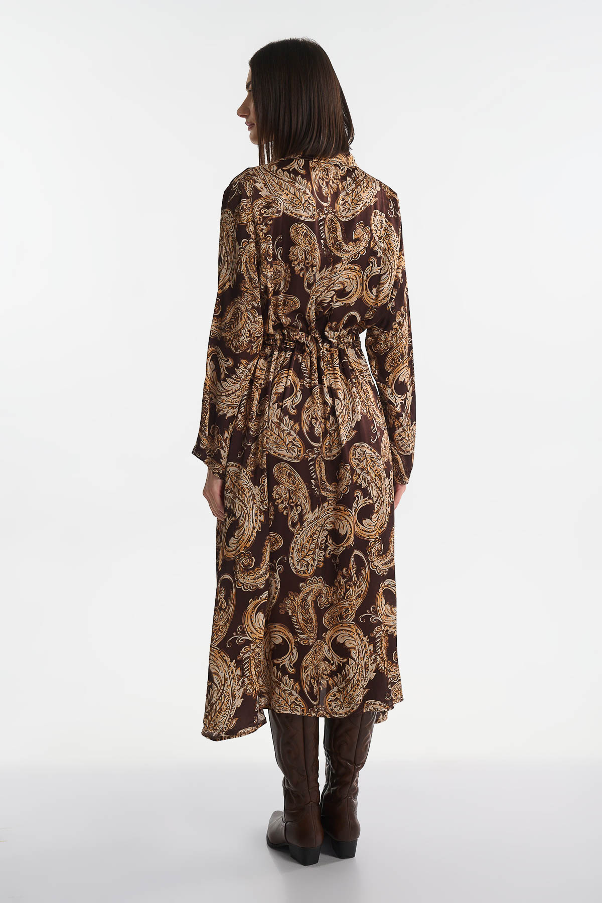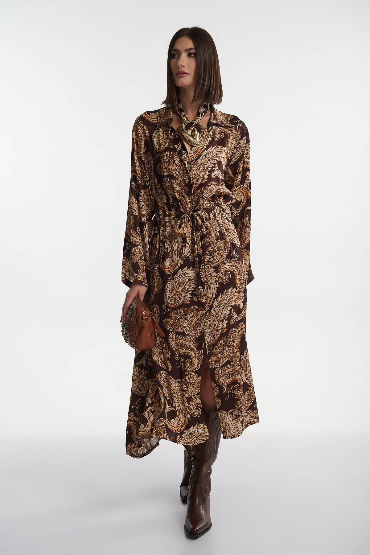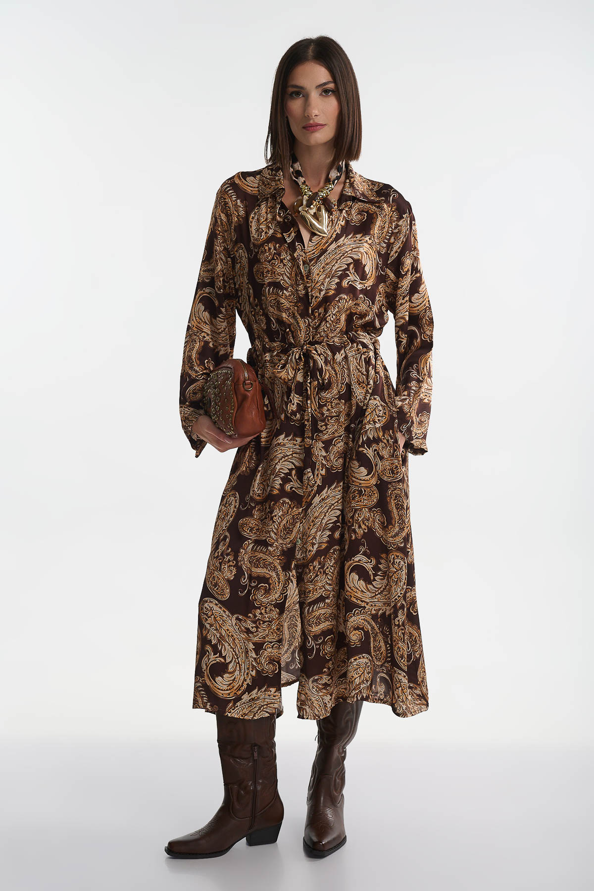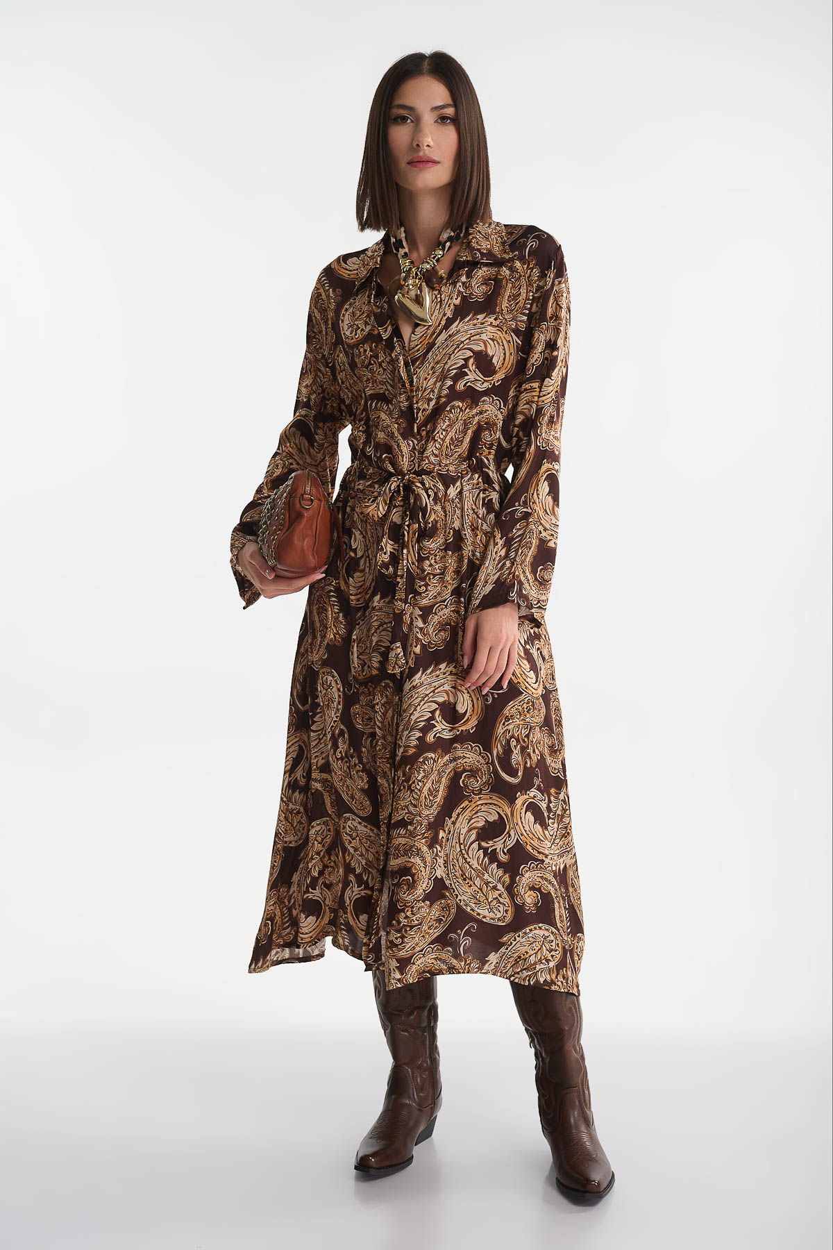 Silk μάξι φόρεμα σεμιζιέ με εντυπωσιακό paisley μοτίβο, μακριά μανίκια και ζώνη στη μέση για θηλυκή σιλουέτα. Ιδανικό για κομψές boho-chic εμφανίσεις.Ένα κομμάτι που αποπνέει κλασική κομψότητα και ρομαντική αύρα, ιδανικό για boho-chic εμφανίσεις ή βραδινές εξόδους με στιλ. Συνδυάζεται υπέροχα με cowboy boots ή ψηλοτάκουνα, καθώς και με statement αξεσουάρ για ένα ολοκληρωμένο, fashion-forward look. Διαθέτει πλαϊνές τσέπες . Μήκος : 125 cm μπροστά – 135 cm πίσω . Σύνθεση : 70% Viscose – 30% Silk.