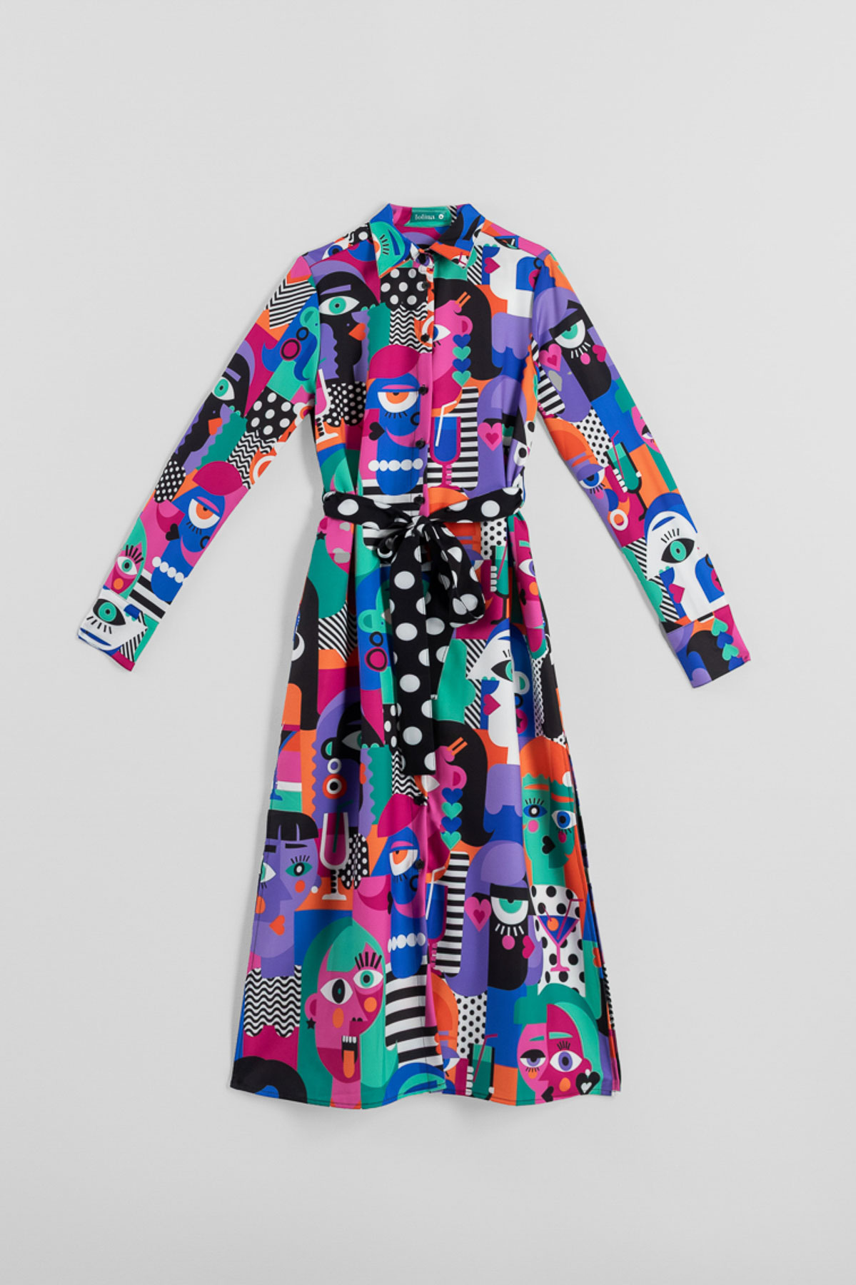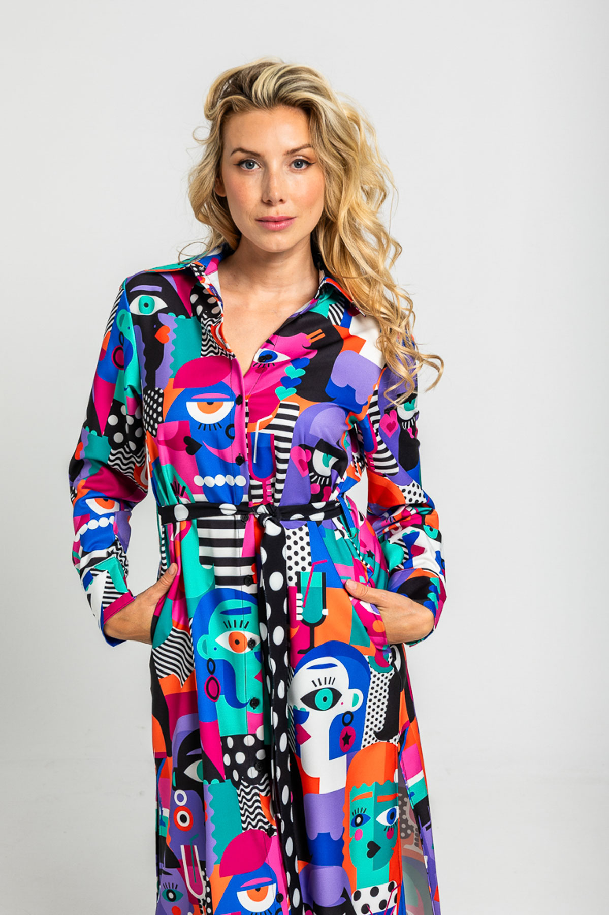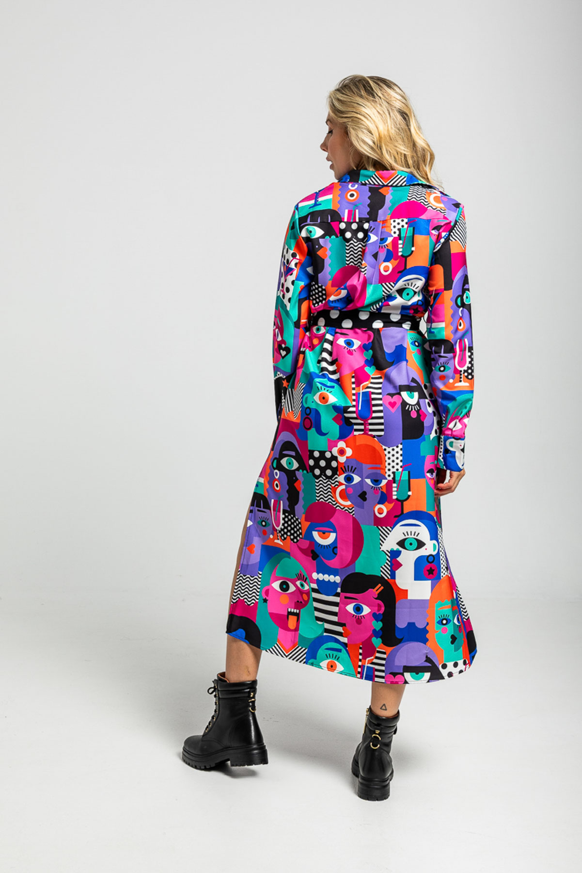 Το σεμιζιέ φόρεμα ImPERFECTA ξεχωρίζει για το καλλιτεχνικό του design, με πολύχρωμο γεωμετρικό εμπριμέ τύπου Picasso. Προσφέρει άνεση και στυλ σε κάθε περίσταση. Διαθέτει γιακά πουκαμίσου, κλείσιμο με κουμπιά σε όλο το μήκος, μακριά μανίκια με μανσέτες και ζώνη πουά σε συνδυασμένο ύφασμα που τονίζει τη μέση. Το μήκος midi με πλαϊνά ανοίγματα και οι κρυφές τσέπες το κάνουν πρακτικό και κομψό ταυτόχρονα.