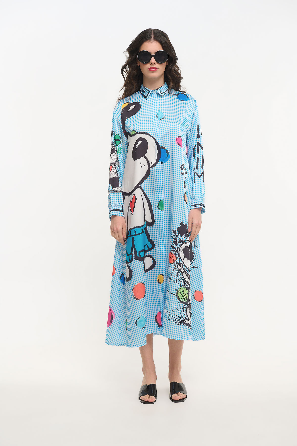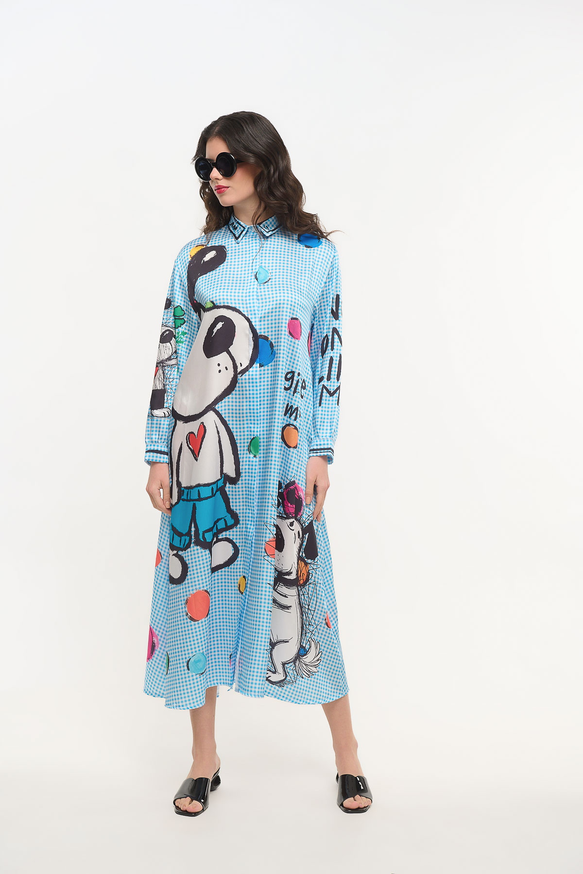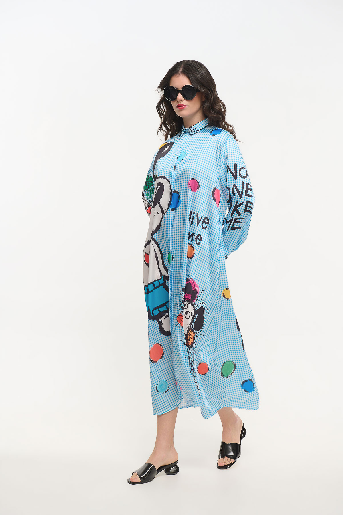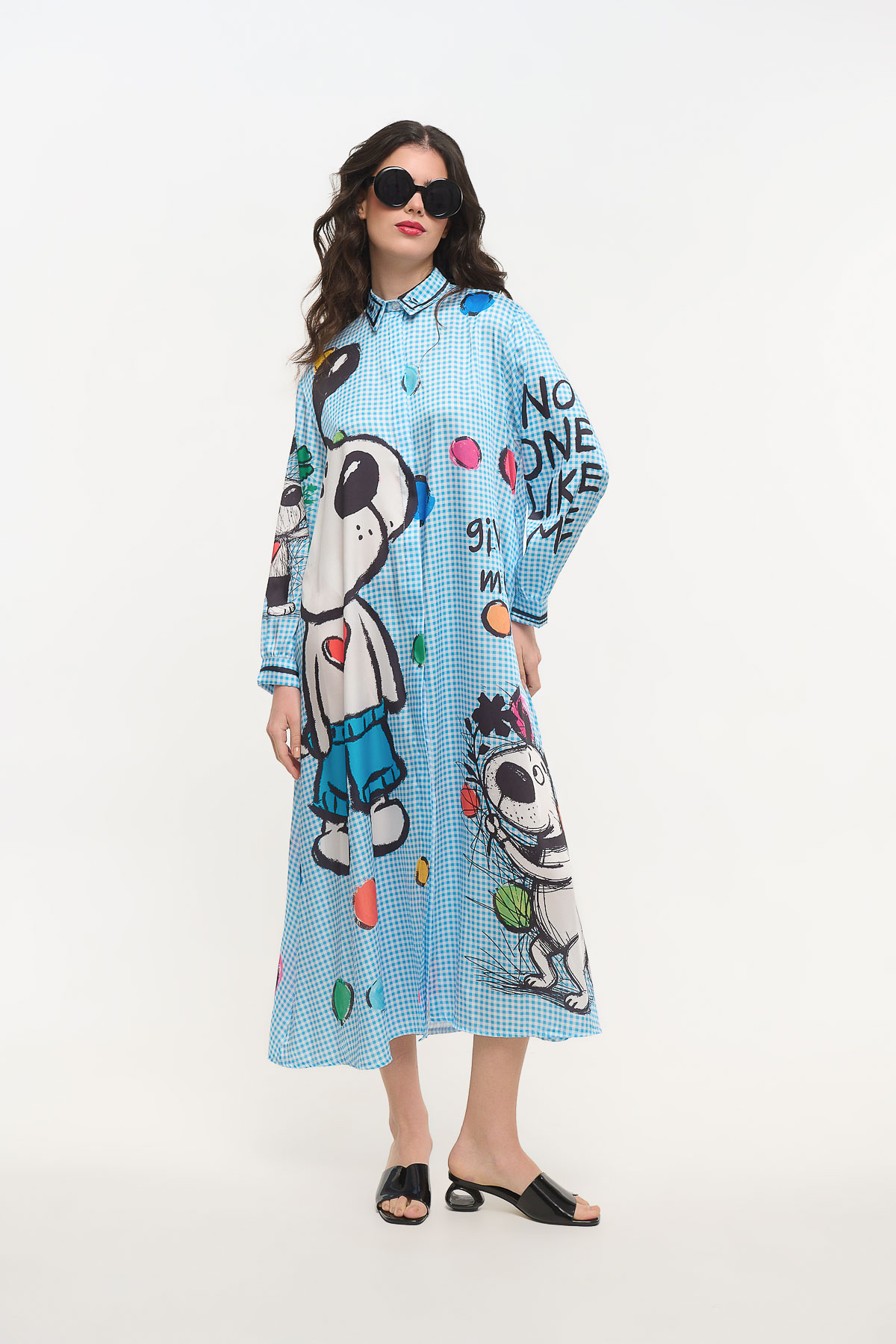 Maxi φόρεμα σεμιζιέ με playful χαρακτήρα και εντυπωσιακό Snoopy print που δίνει μοναδικό fashion ύφος. Το γαλάζιο καρό μοτίβο συνδυάζεται με ζωηρά χρώματα και cartoon λεπτομέρειες, δημιουργώντας ένα ξεχωριστό statement κομμάτι για τις καλοκαιρινές εμφανίσεις. Η άνετη γραμμή προσφέρει ελευθερία κινήσεων και κομψή ροή στο ύφασμα, ενώ ο κλασικός γιακάς προσθέτει διαχρονικό στυλ. Διαθέτει πρακτικές πλαϊνές τσέπες που ενισχύουν τη λειτουργικότητα του σχεδίου. Είναι one size και καλύπτει μεγέθη από XS έως XL, με περίμετρο στήθους έως 120 cm. Με μήκος 136 cm αποτελεί ιδανική επιλογή για casual chic εμφανίσεις όλη τη σεζόν.