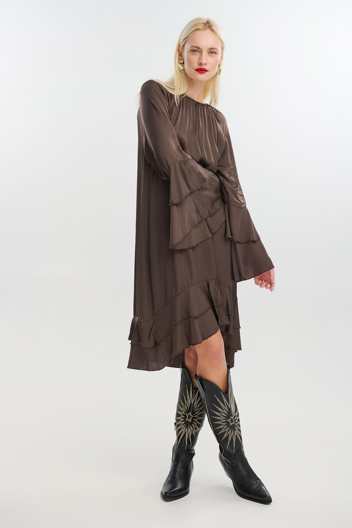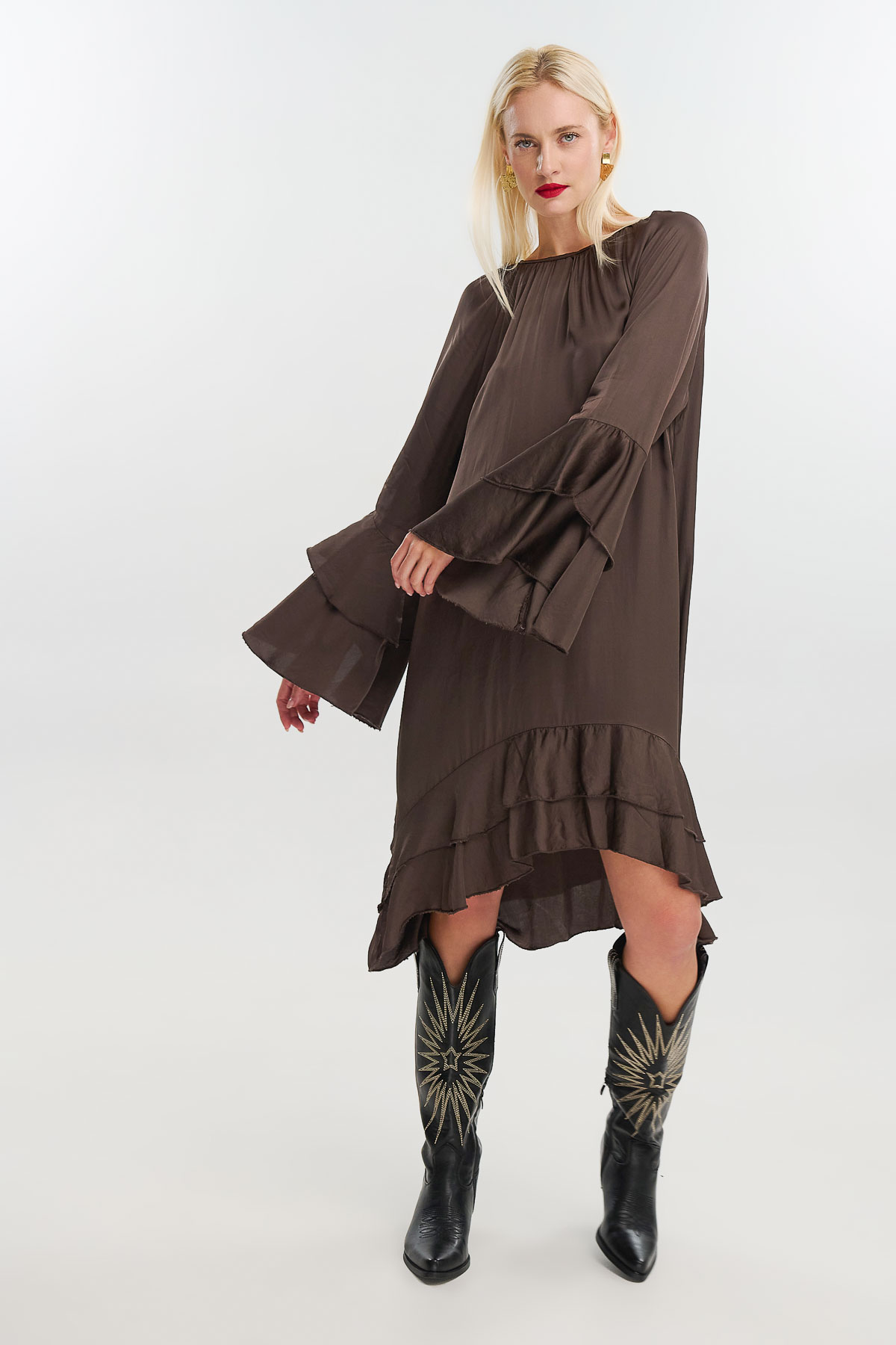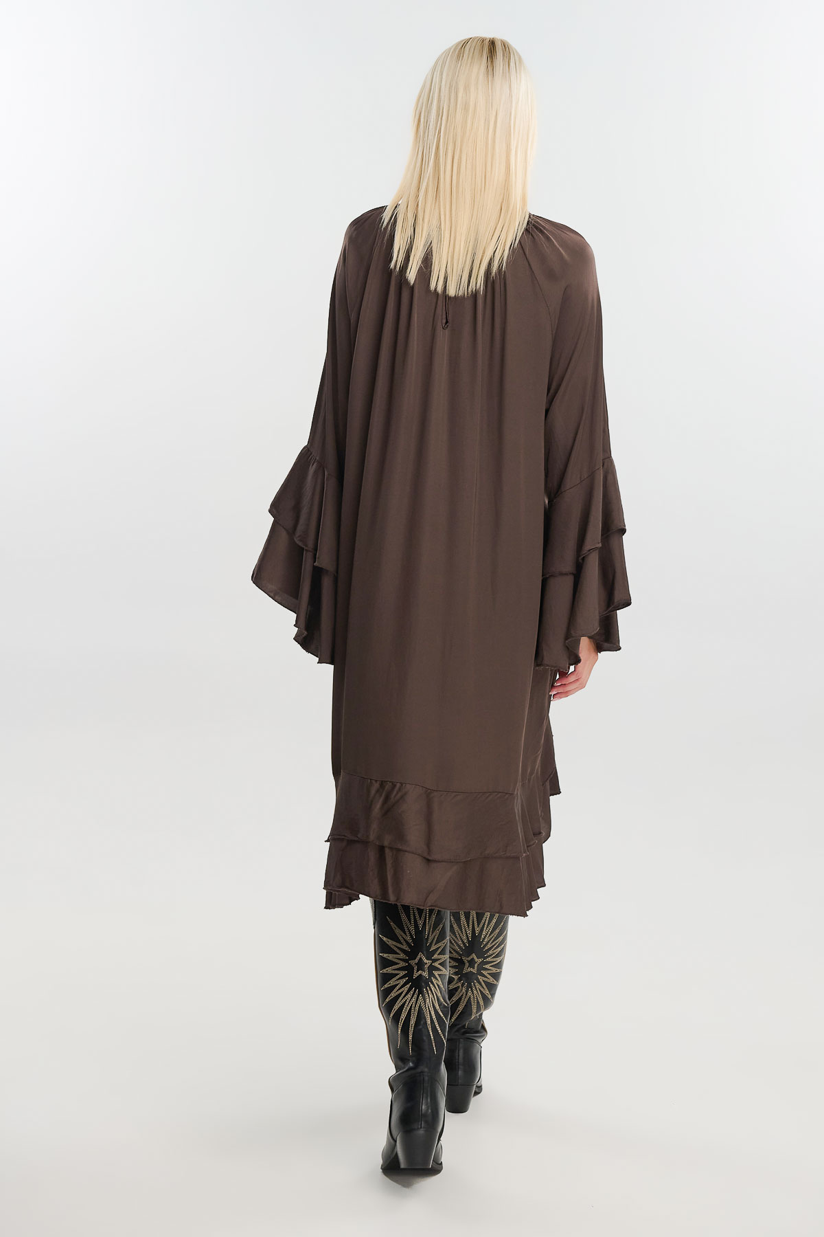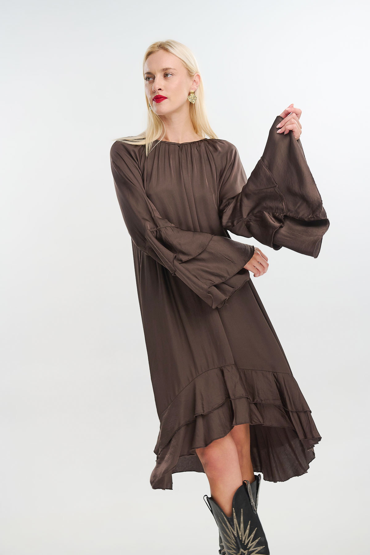 Αέρινο και διαχρονικά θηλυκό, το μεταξωτό φόρεμα με καμπάνα μανίκια συνδυάζει απλότητα και κομψότητα. Η loose γραμμή του χαρίζει κίνηση και άνεση, ενώ οι φαρδιές μανσέτες και τα ρευστά βολάν στο τελείωμα προσθέτουν έναν ρομαντικό, boho χαρακτήρα.
