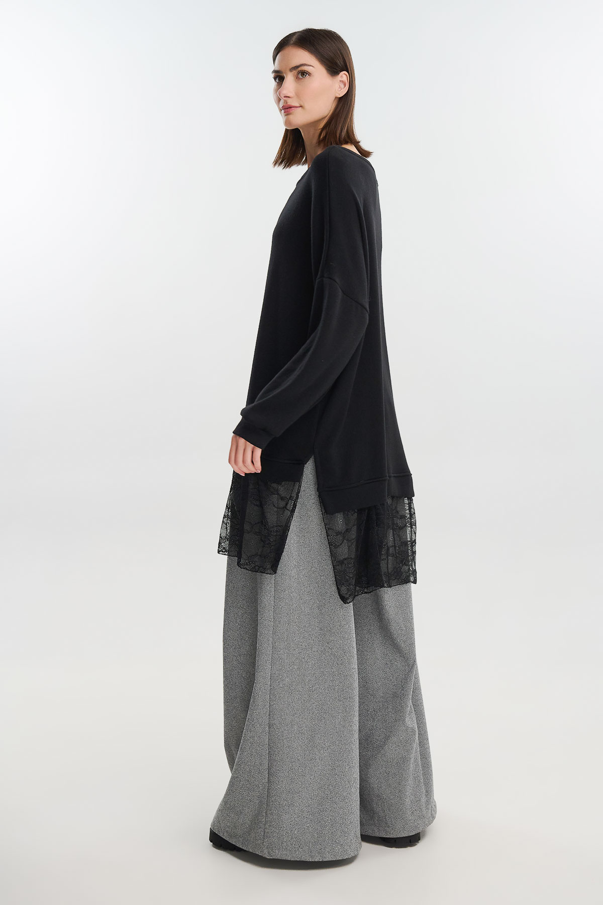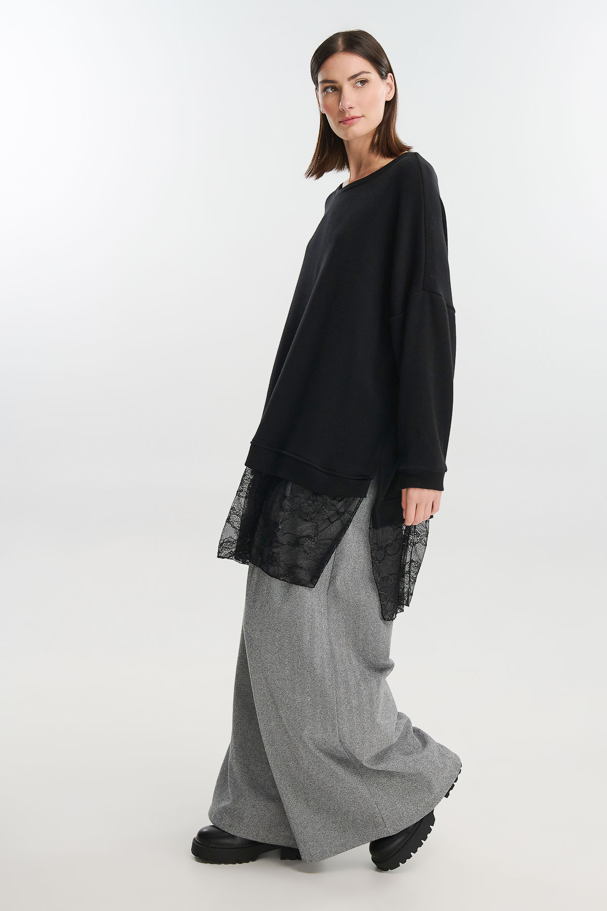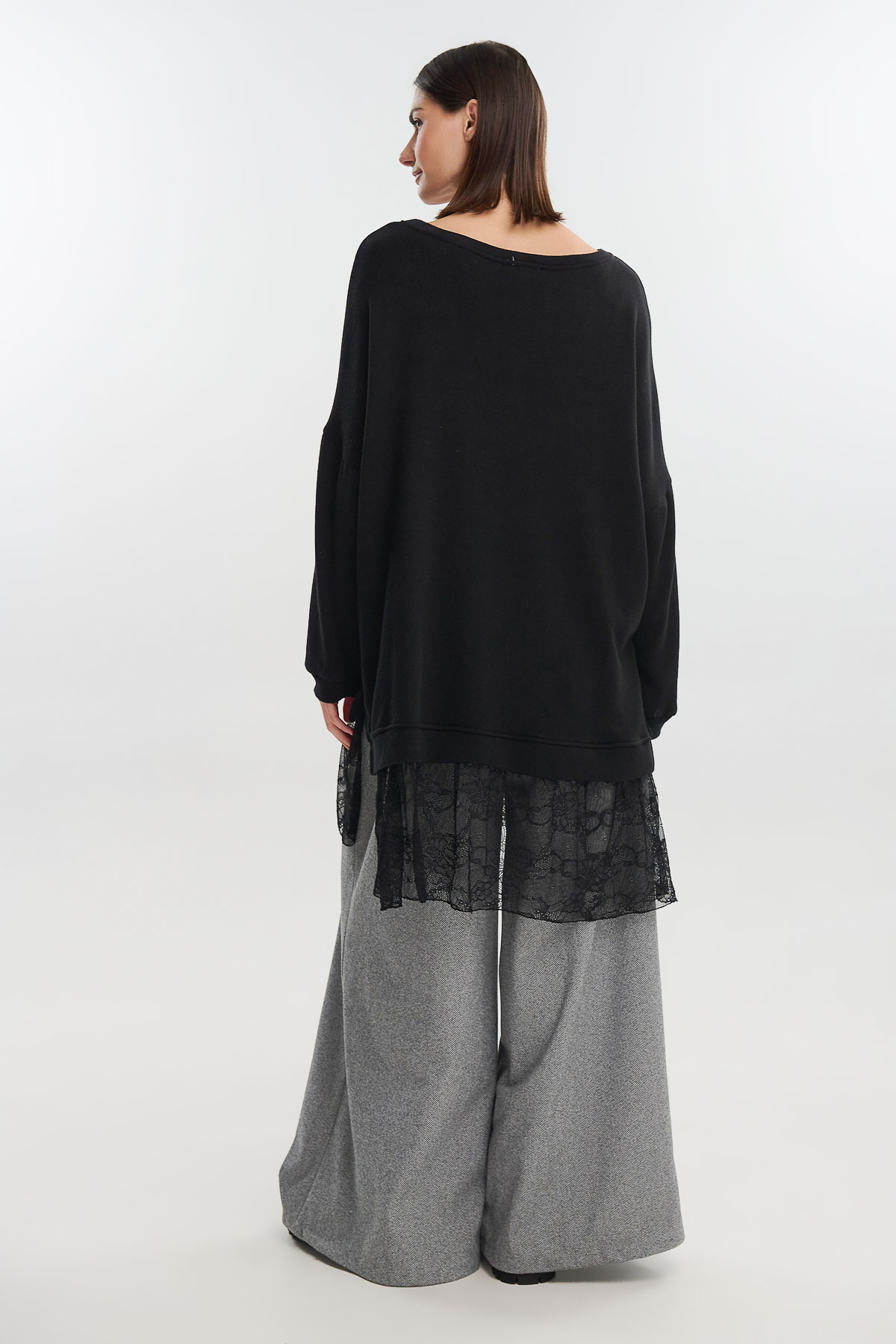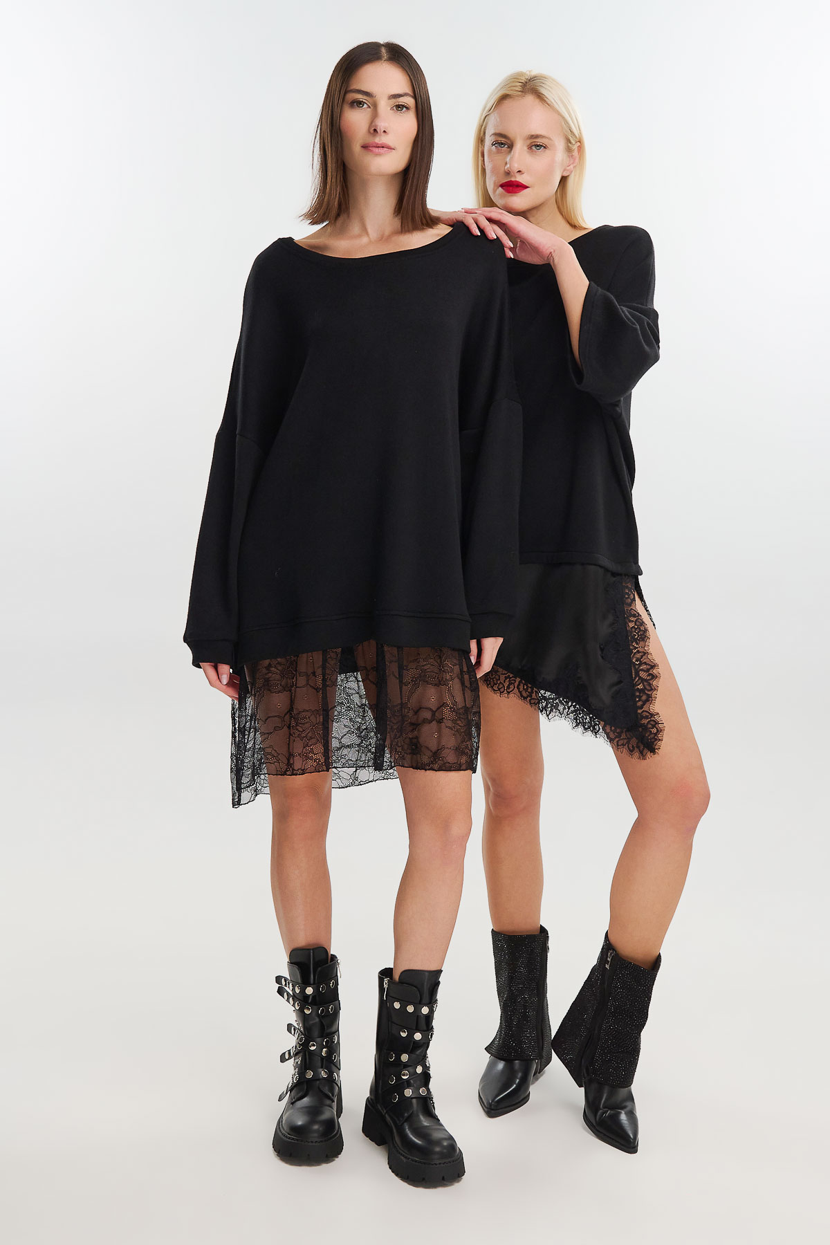 Ένα φόρεμα που συνδυάζει τη ζεστασιά του πλεκτού με τη θηλυκότητα της δαντέλας, δημιουργώντας ένα μοναδικό αποτέλεσμα με urban-chic χαρακτήρα. Η oversized γραμμή του προσφέρει άνεση και κίνηση, ενώ το εντυπωσιακό τελείωμα από λεπτή μαύρη δαντέλα χαρίζει ρομαντική και σύγχρονη διάθεση.