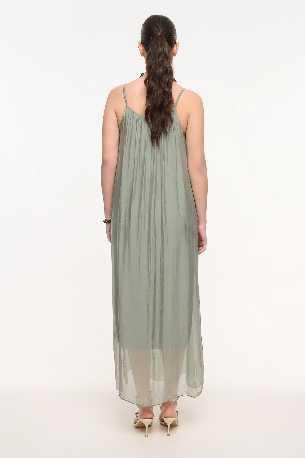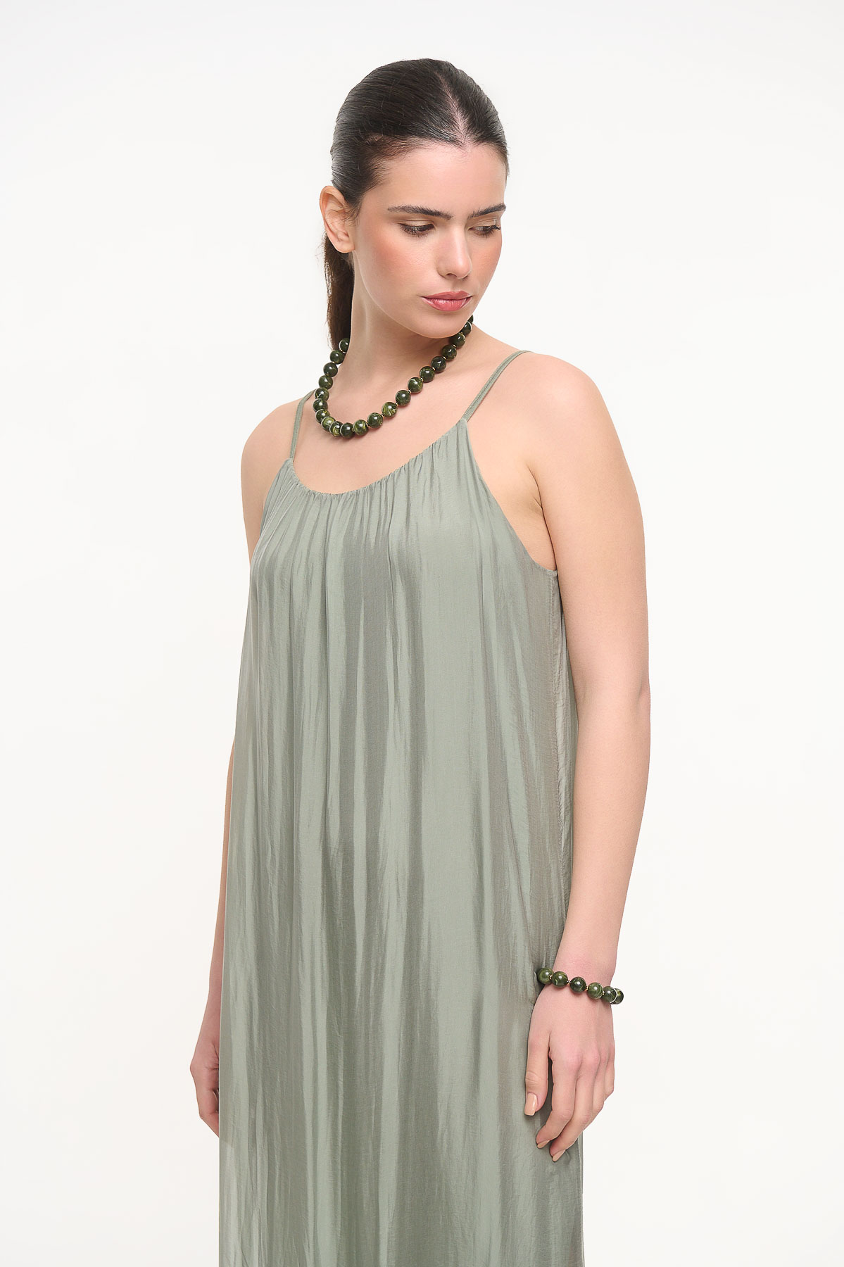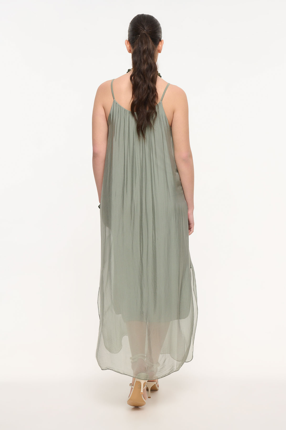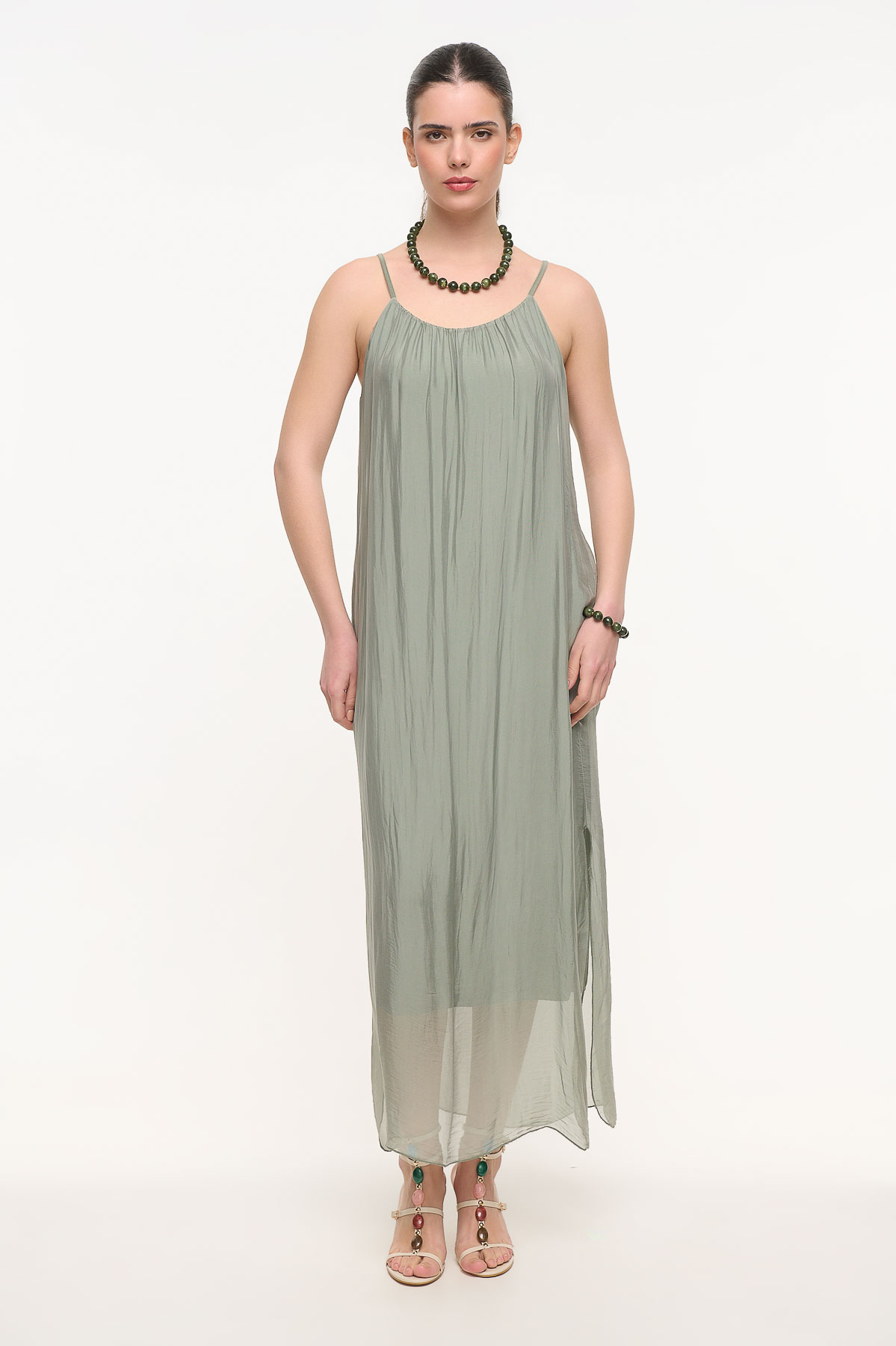 Αέρινο και κομψό, το μάξι φόρεμα από μετάξι και βισκόζη , αγκαλιάζει ανάλαφρα τη σιλουέτα και προσφέρει αίσθηση δροσιάς ακόμα και στις πιο ζεστές ημέρες. Οι λεπτές τιράντες τονίζουν τους ώμους, ενώ το σούρωμα στο ντεκολτέ προσθέτει κίνηση και θηλυκότητα. Η γραμμή του είναι φαρδιά και ίσια, χαρίζοντας άνεση και ελευθερία στις κινήσεις. Ιδανικό για κομψές εμφανίσεις από το πρωί έως το βράδυ, συνδυάζεται με εντυπωσιακά αξεσουάρ και σανδάλια.
