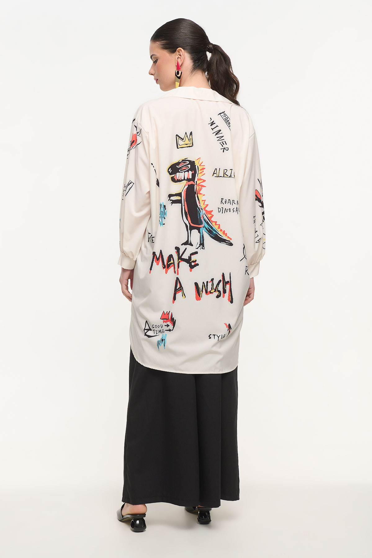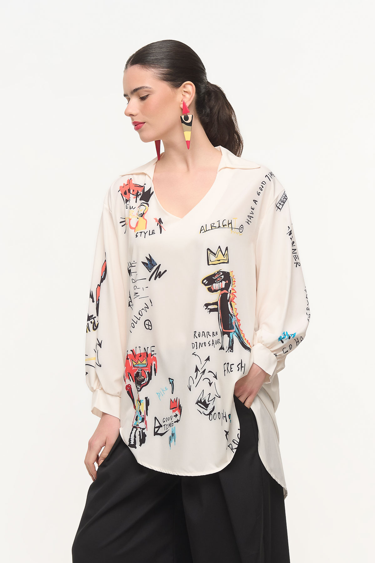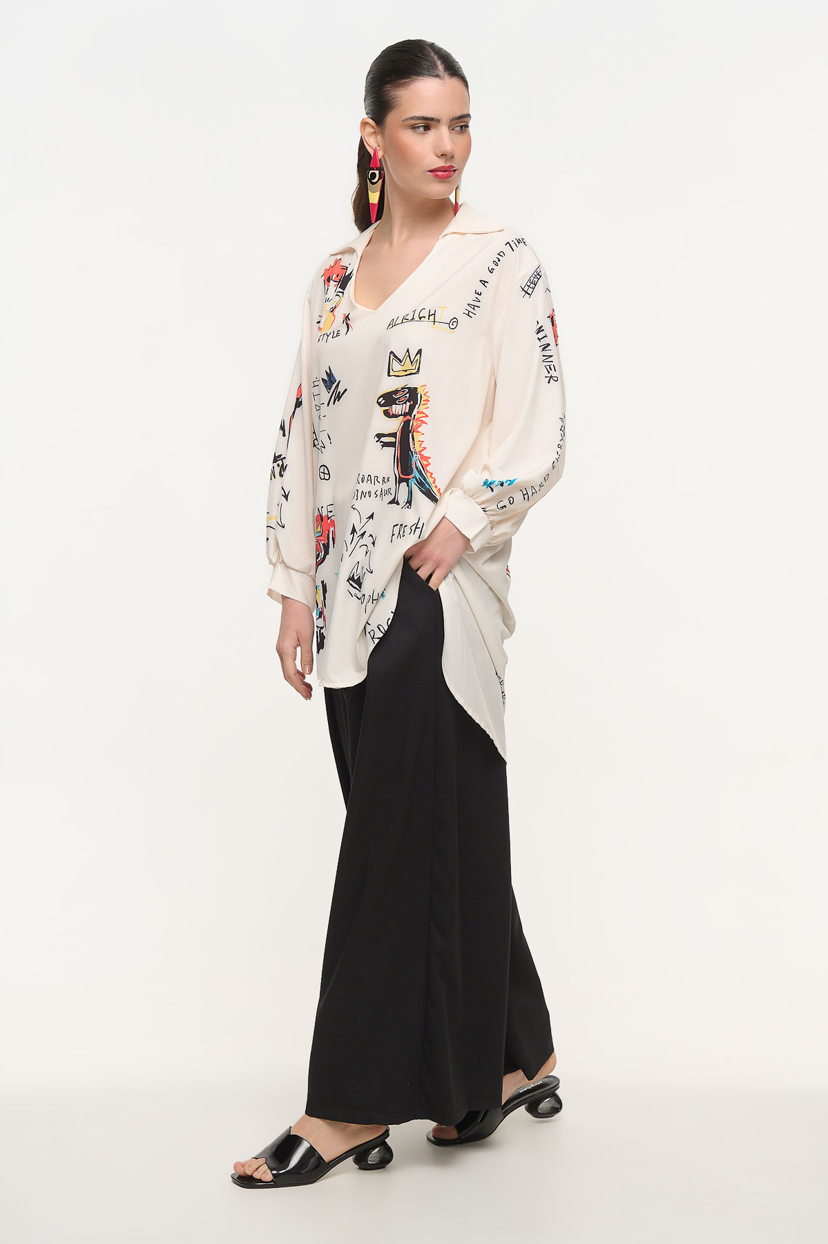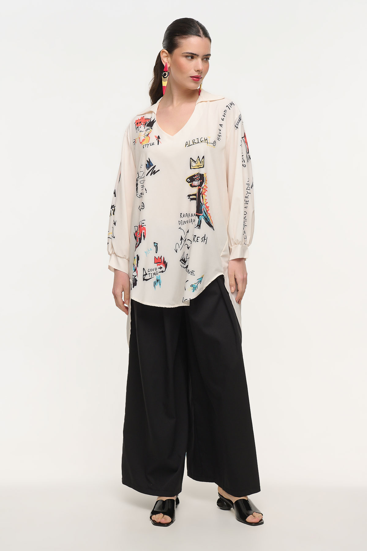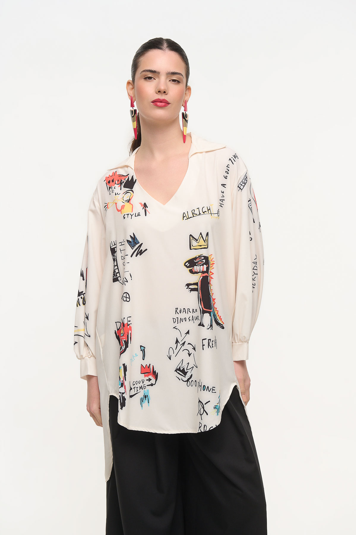 Oversized μπλούζα – φόρεμα με ιδιαίτερο artistic print που θυμίζει χειροποίητα sketches και graffiti στοιχεία. Τα παιχνιδιάρικα σχέδια με φιγούρες, σύμβολα και γραφιστικές λεπτομέρειες δημιουργούν ένα σύγχρονο και δημιουργικό αποτέλεσμα που ξεχωρίζει. Η χαλαρή oversized γραμμή προσφέρει άνεση και κομψή κίνηση, ενώ το V ντεκολτέ και ο γιακάς προσθέτουν μια διακριτική κομψότητα στο σχέδιο. Μπορεί να φορεθεί είτε ως μπλούζα με παντελόνα είτε ως κοντό φόρεμα για πιο fashion εμφανίσεις. Καλύπτει στήθος έως 135 cm και διαθέτει ασύμμετρο μήκος 85 cm μπροστά και 104 cm πίσω, προσφέροντας μοντέρνα σιλουέτα και άνετη εφαρμογή.