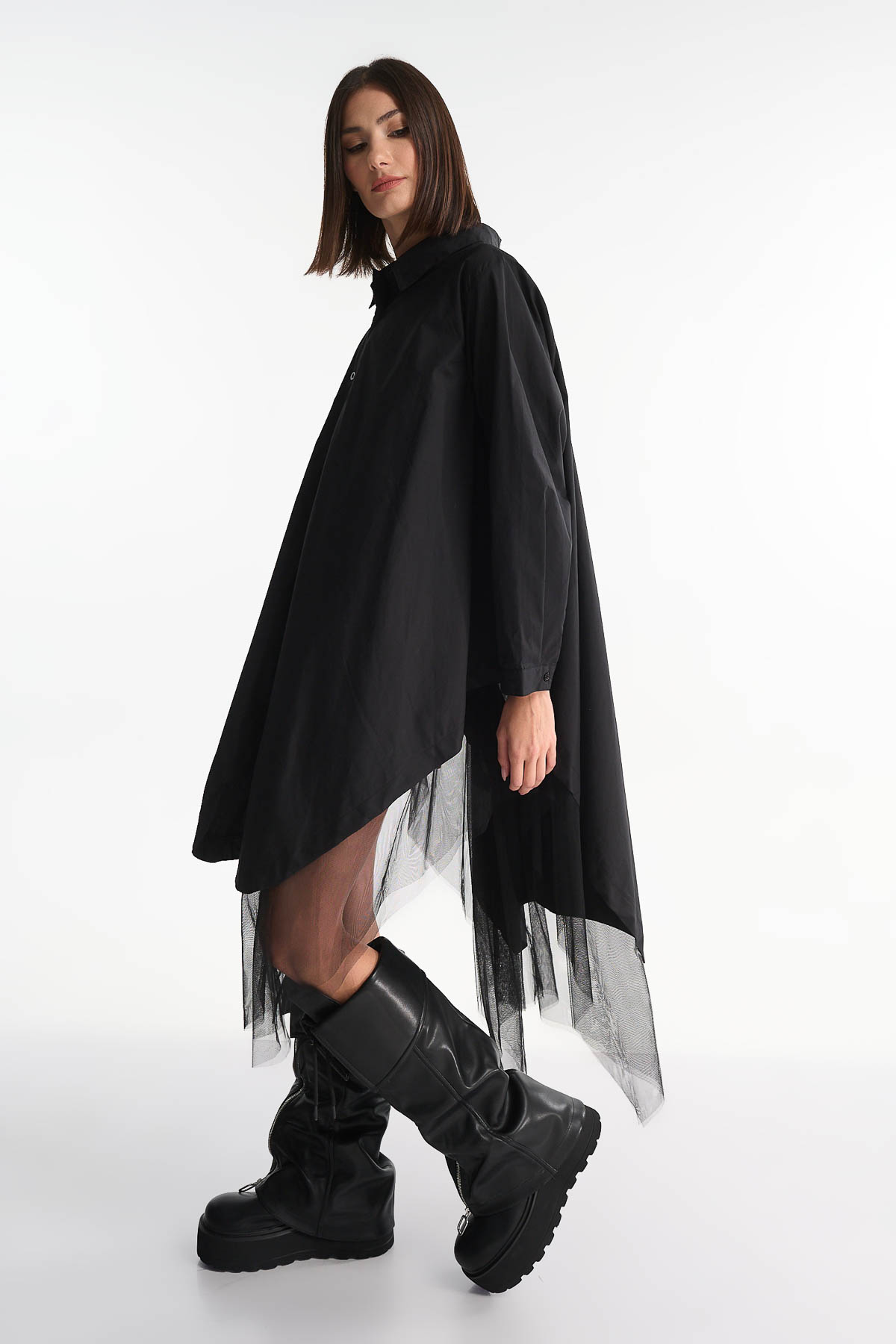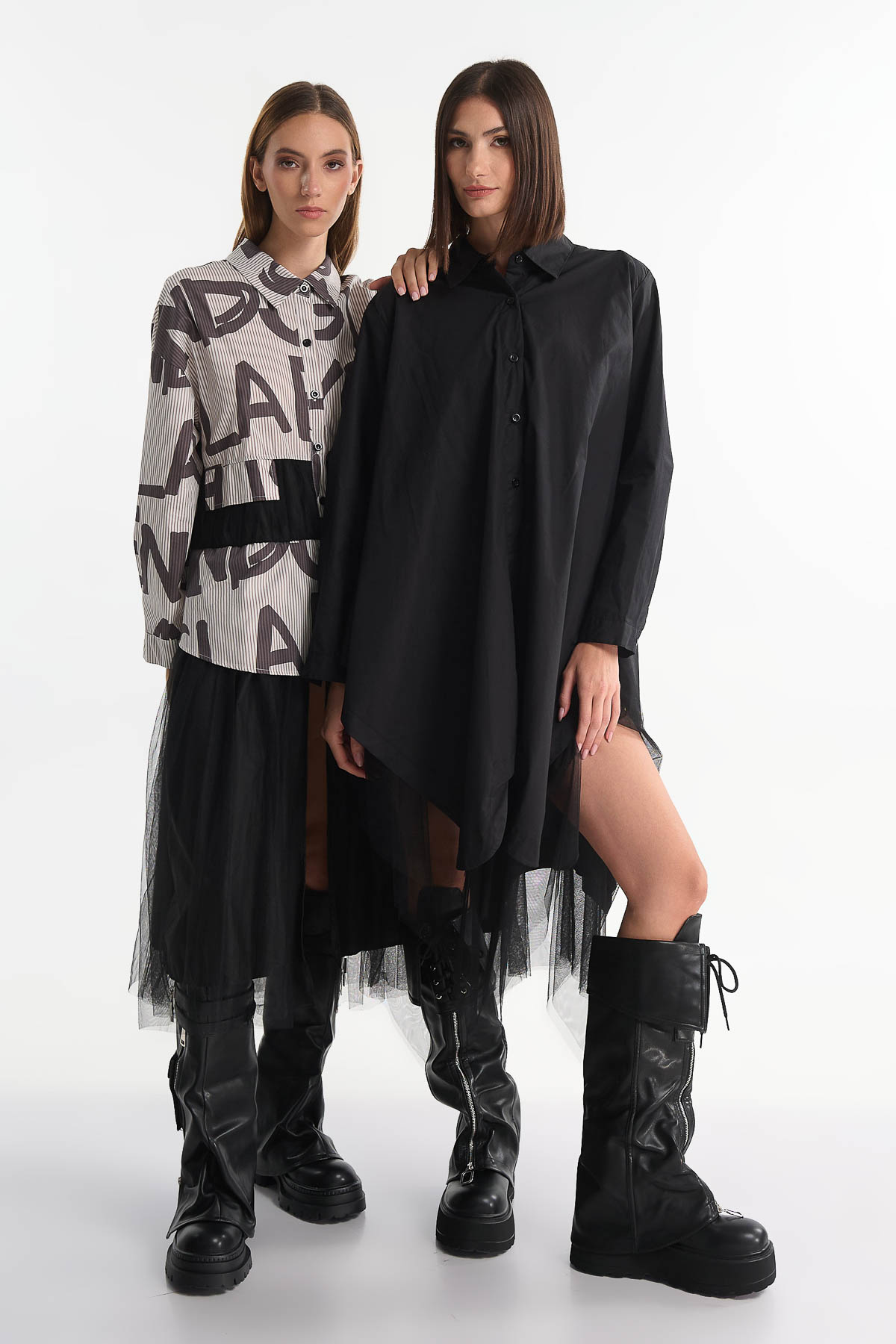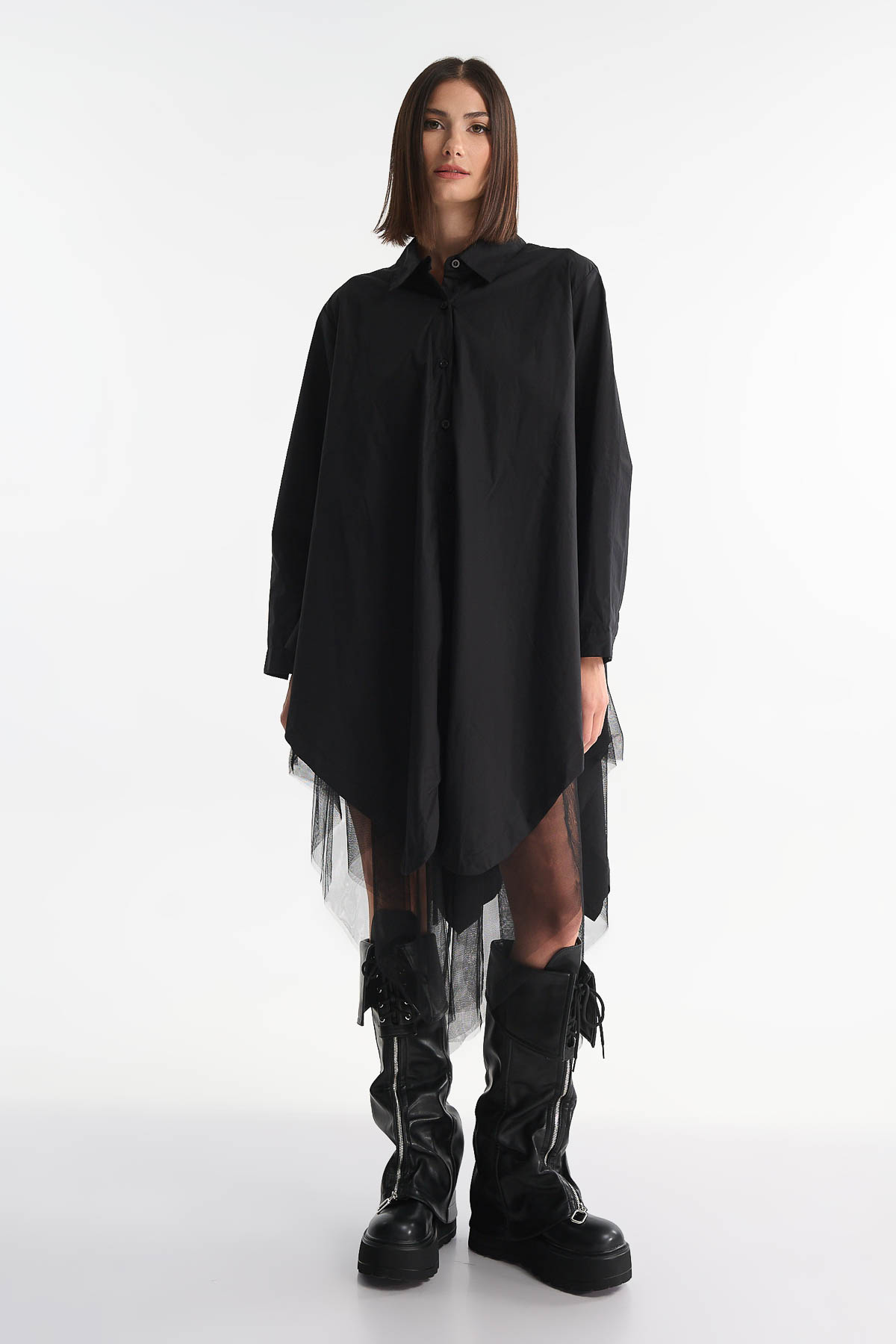 Το ασύμμετρο μαύρο shirt dress με τούλι συνδυάζει μίνιμαλ αισθητική με street style λεπτομέρειες . Το καθαρό, βαμβακερό ύφασμα χαρίζει φυσική ροή και ελευθερία κινήσεων, ενώ η ασύμμετρη γραμμή με το διάφανο τούλι δημιουργεί ένα layered εφέ που απογειώνει το look. Το design ισορροπεί ανάμεσα στην κομψότητα και τη δυναμική street αισθητική, καθιστώντας το ιδανικό για statement εμφανίσεις. Μπορεί να φορεθεί ως φόρεμα με combat boots για ένα bold, fashion-forward αποτέλεσμα ή να συνδυαστεί με leggings και ζώνη για πιο structured στυλ. Καλύπτει απο XS έως 2XL . Σύνθεση : 100% Cotton .