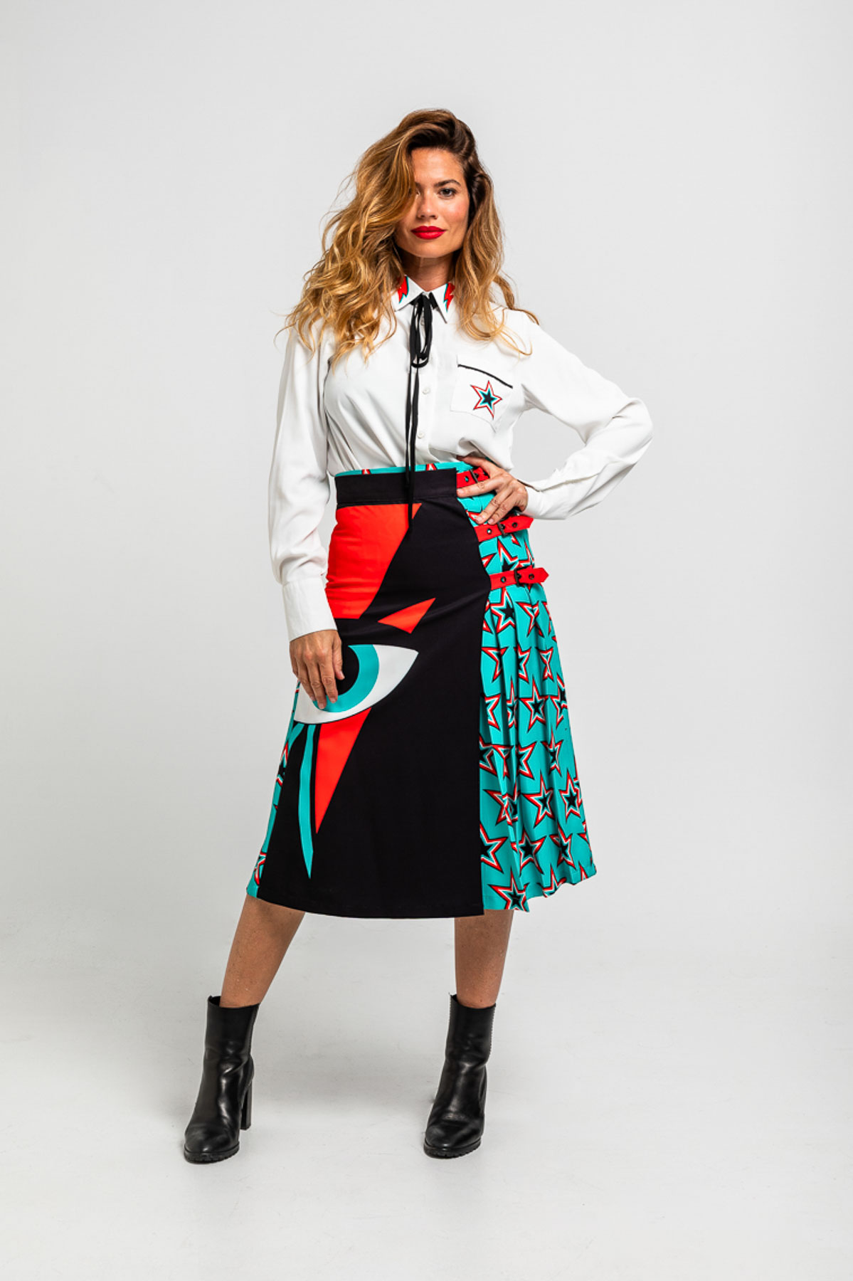 Η φούστα Starwoman της Lolina είναι το απόλυτο fashion statement για όσες λατρεύουν τη μόδα με attitude. Με εντυπωσιακό grunge print αστεριών σε έντονα χρώματα και το χαρακτηριστικό Bowie rayo – eye motif, η φούστα αυτή συνδυάζει τέλεια την τέχνη με το στυλ.