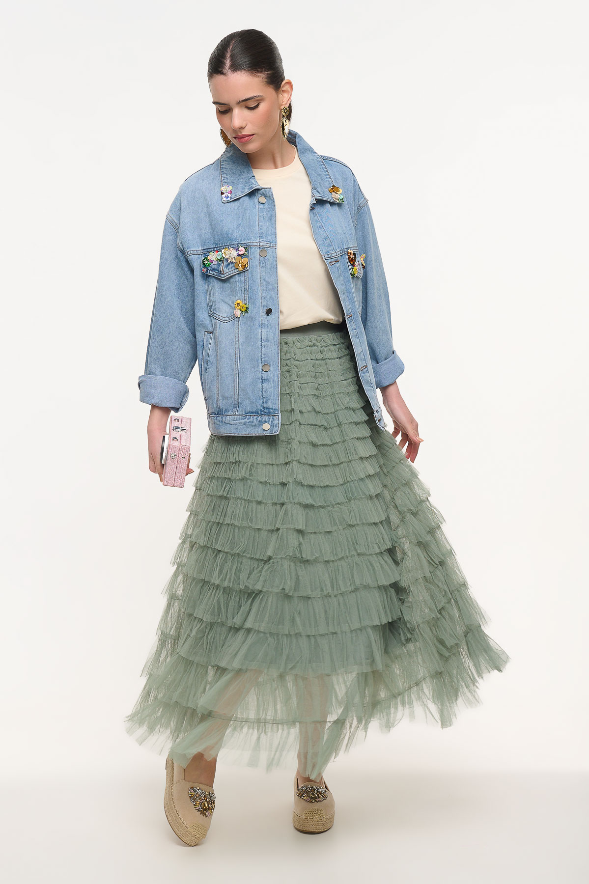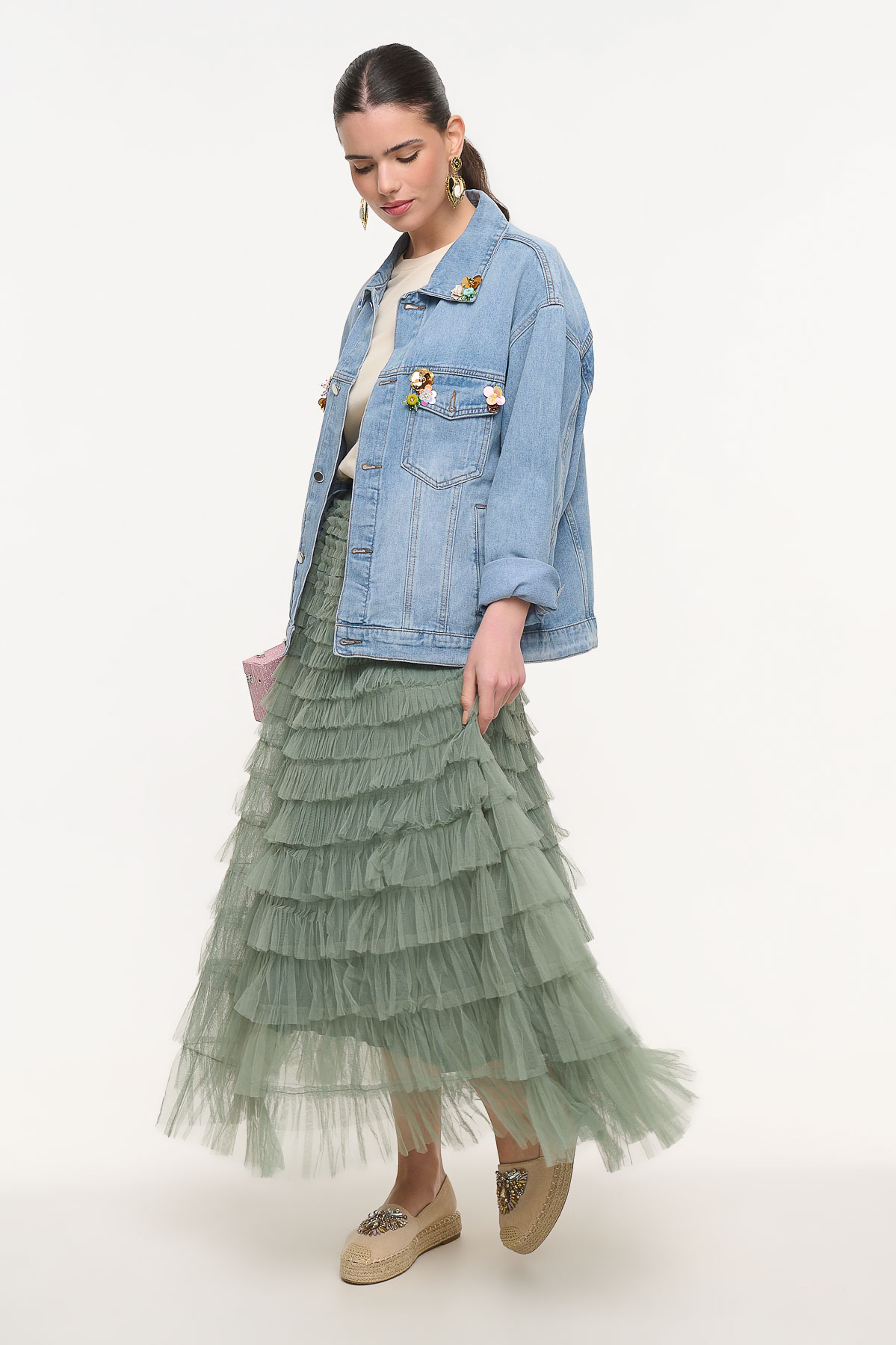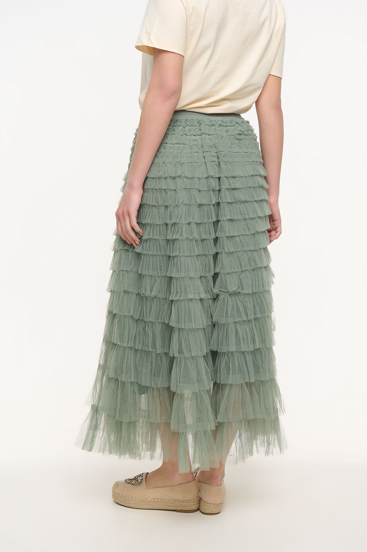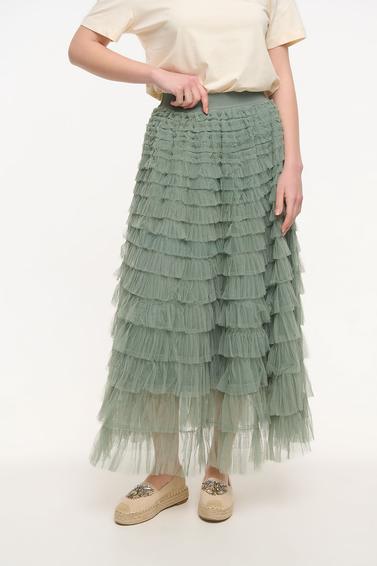 Maxi τούλινη φούστα σε απαλή απόχρωση μέντας που χαρίζει ρομαντική και αέρινη κίνηση σε κάθε εμφάνιση. Το ελαφρύ τούλι δημιουργεί όμορφο όγκο και κομψή σιλουέτα, ενώ η εσωτερική φόδρα εξασφαλίζει άνεση και σωστή εφαρμογή. Το λάστιχο στη μέση προσφέρει ευκολία στο φόρεμα και προσαρμόζεται άνετα στο σώμα, καθιστώντας τη φούστα ιδανική για πολλές σιλουέτες. Συνδυάζεται εύκολα με πουκάμισα, tops ή t-shirts για κομψά καθημερινά αλλά και πιο ιδιαίτερα looks. Είναι one size, καλύπτει περίμετρο μέσης έως 110 cm και έχει μήκος 102 cm, δημιουργώντας μια εντυπωσιακή και θηλυκή maxi γραμμή.