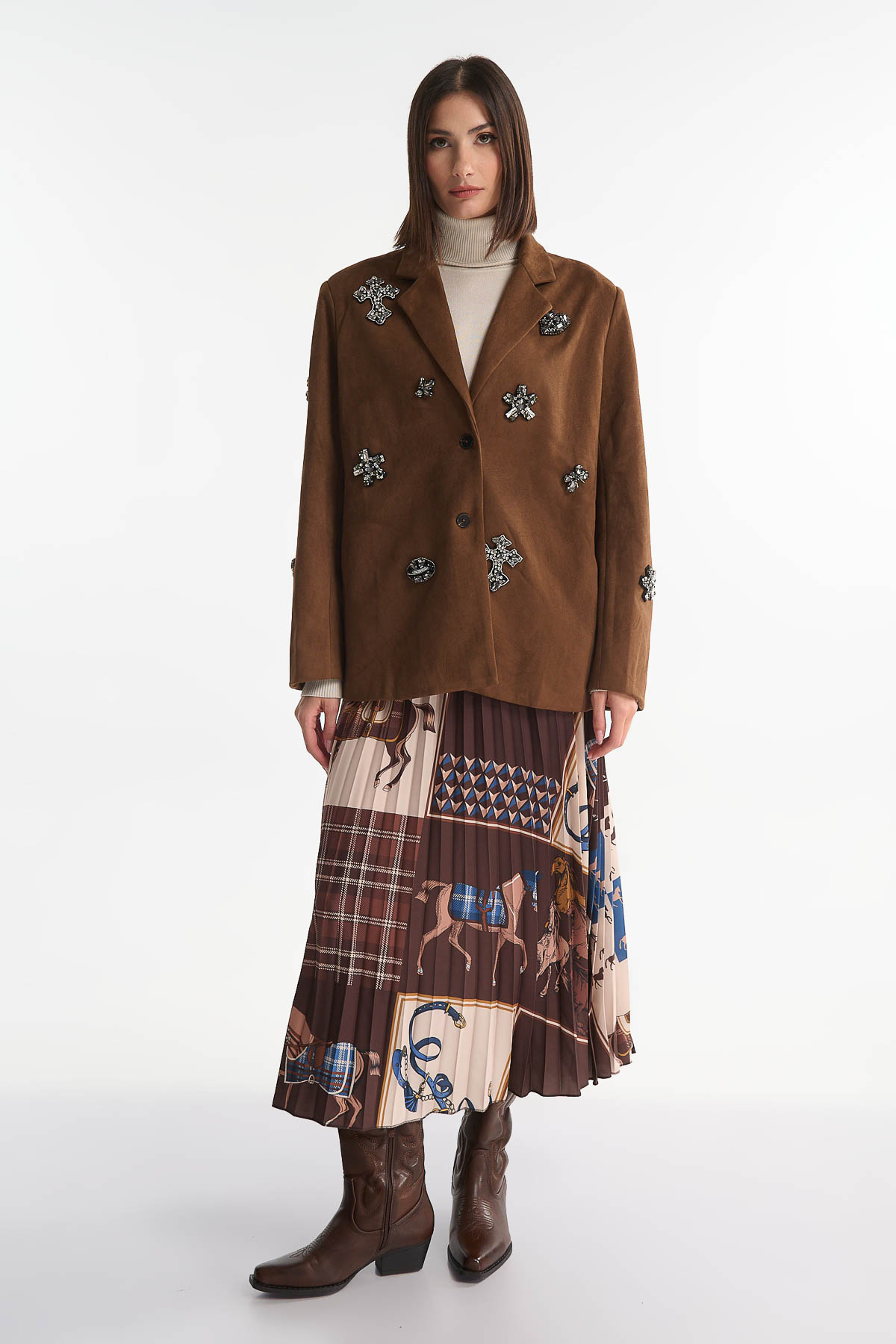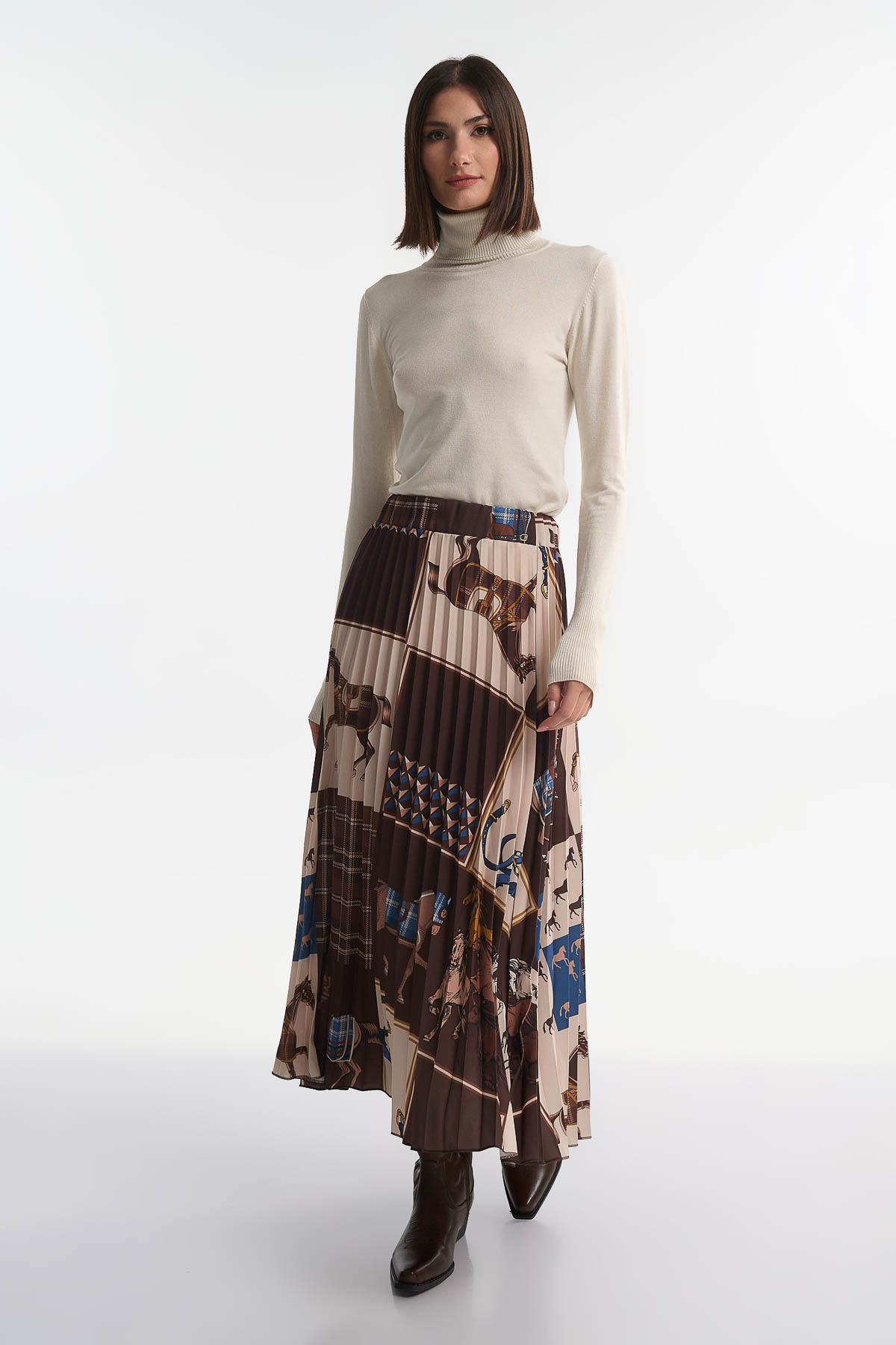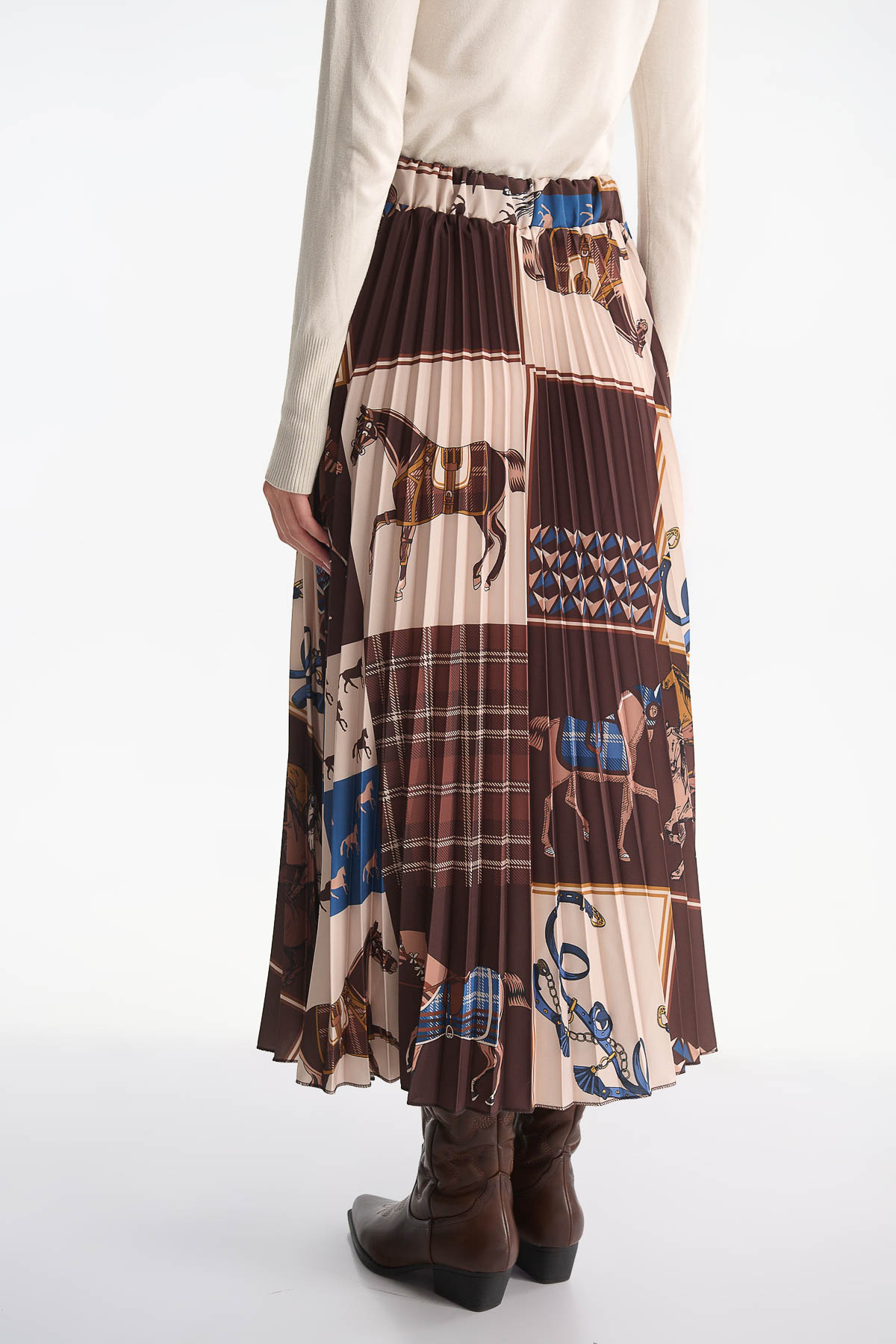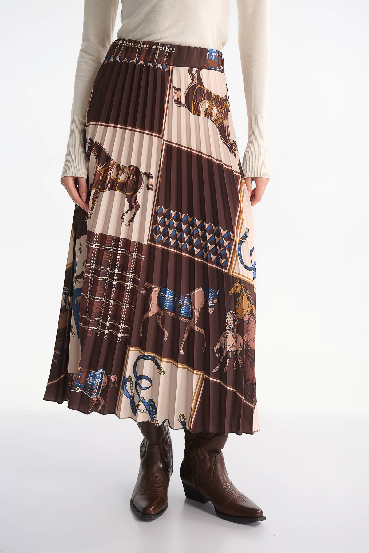 Φούστα πλισέ με ιδιαίτερο equestrian μοτίβο που συνδυάζει κομψότητα και διαχρονικό στυλ. Σε γήινες αποχρώσεις μπεζ, καφέ και μαύρου, διαθέτει ελαστική μέση για άνετη εφαρμογή και αέρινη κίνηση σε κάθε βήμα. Το μήκος της φτάνει στη γάμπα, καθιστώντας την ιδανική για συνδυασμό με μπότες ή γόβες.