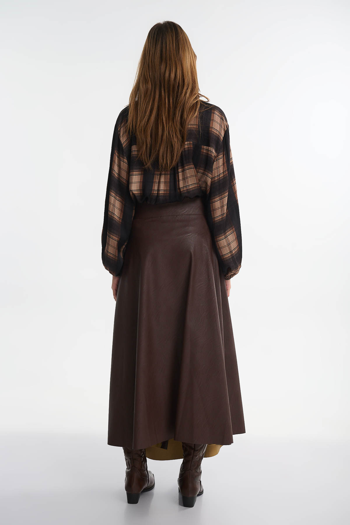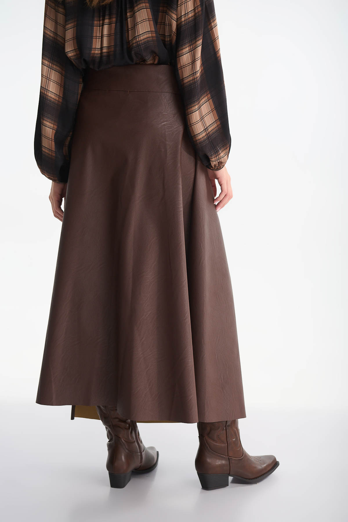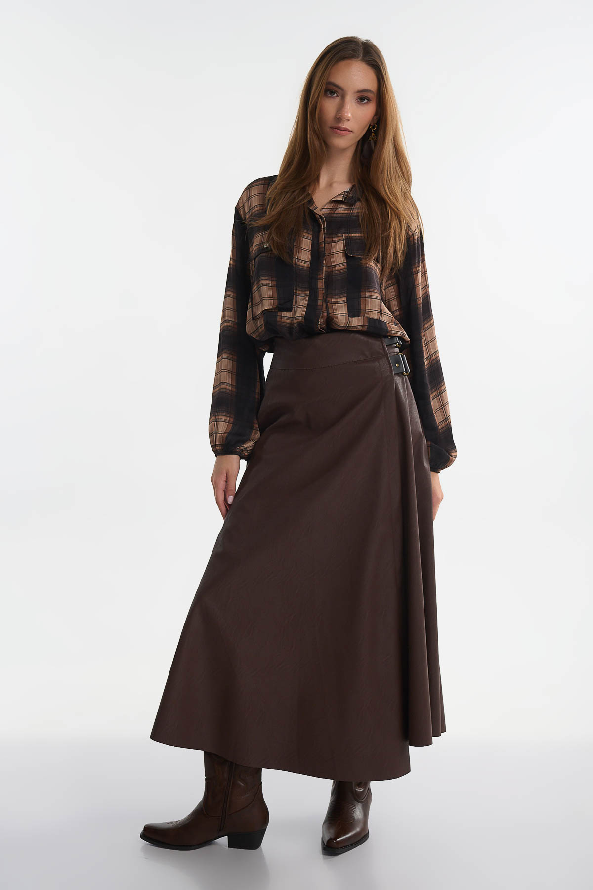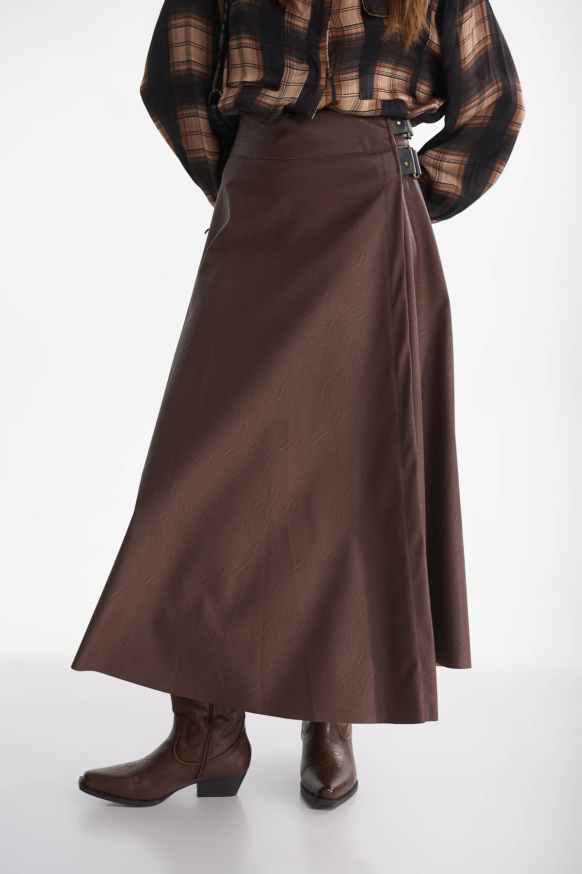 Μακριά eco leather φούστα σε πλούσια καφέ απόχρωση. Διαθέτει μοντέρνο κλείσιμο στο πλάι με δύο μεταλλικές αγκράφες, χαρίζοντας western chic αισθητική. Το ρευστό κόψιμο της προσφέρει κίνηση και κομψότητα, ιδανική για καθημερινές εμφανίσεις ή πιο statement looks. Συνδυάστε τη με μπότες για αυθεντικό cowboy style ή με τακούνια για πιο elegant αποτέλεσμα. Είναι one size και ρυθμίζεις το κλέισιμο στο πλάι σε 3 σημεία . Μήκος : 95 cm . Σύνθεση : 100% Polyester.