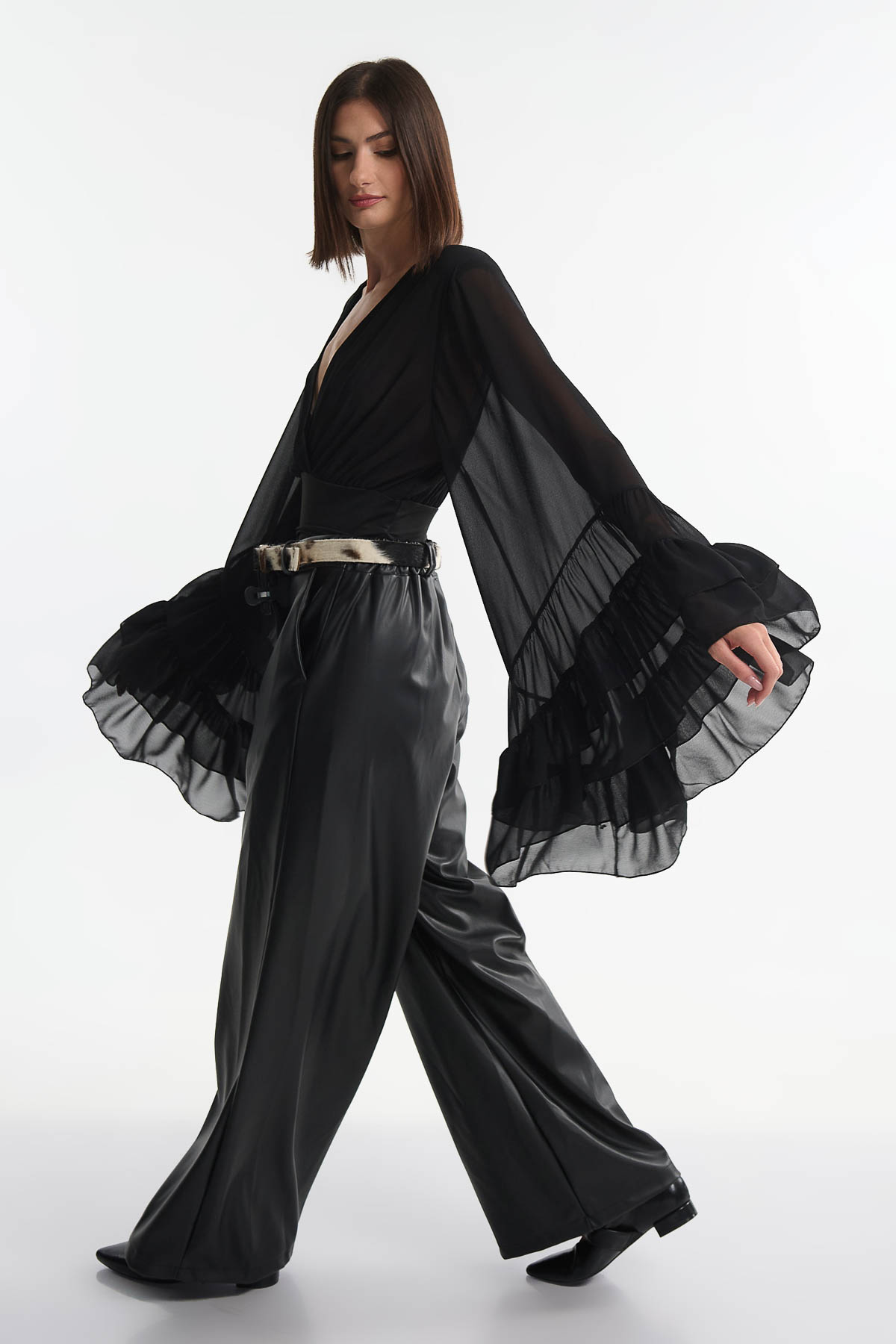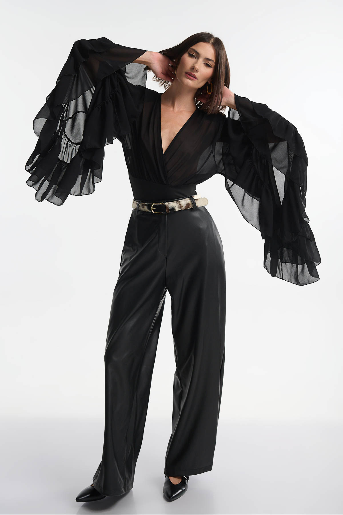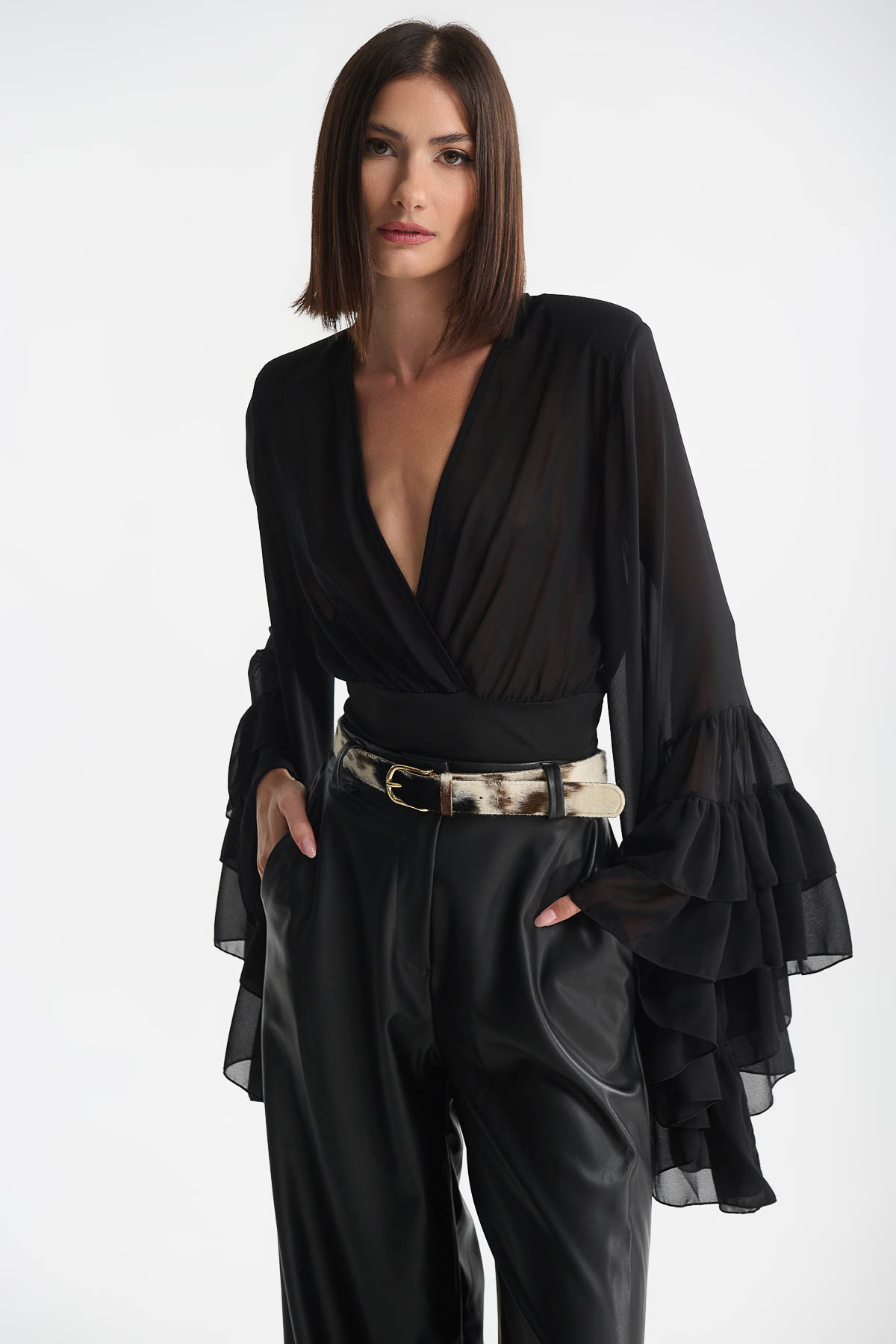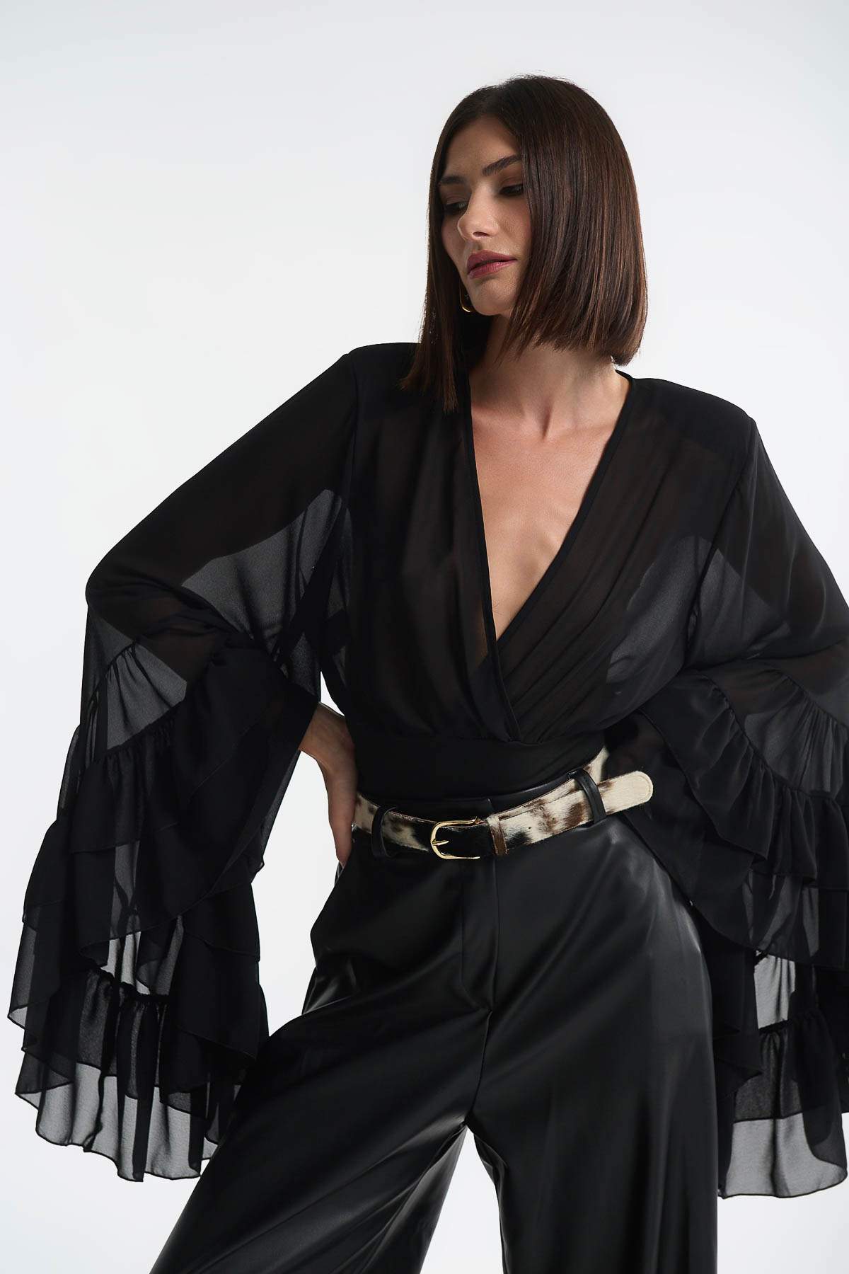 Blouse Cabana Sleeves είναι μια statement επιλογή που συνδυάζει κομψότητα και θεατρικότητα. Κατασκευασμένη από αέρινο, see-through ύφασμα, διαθέτει εντυπωσιακά φαρδιά μανίκια με πολλαπλά βολάν, δημιουργώντας κίνηση και ρομαντική διάθεση σε κάθε εμφάνιση. Οι διακριτικές βάτες στους ώμους προσδίδουν δομή και ισορροπία στο σχέδιο, ενώ το βαθύ V ντεκολτέ αναδεικνύει θηλυκότητα.