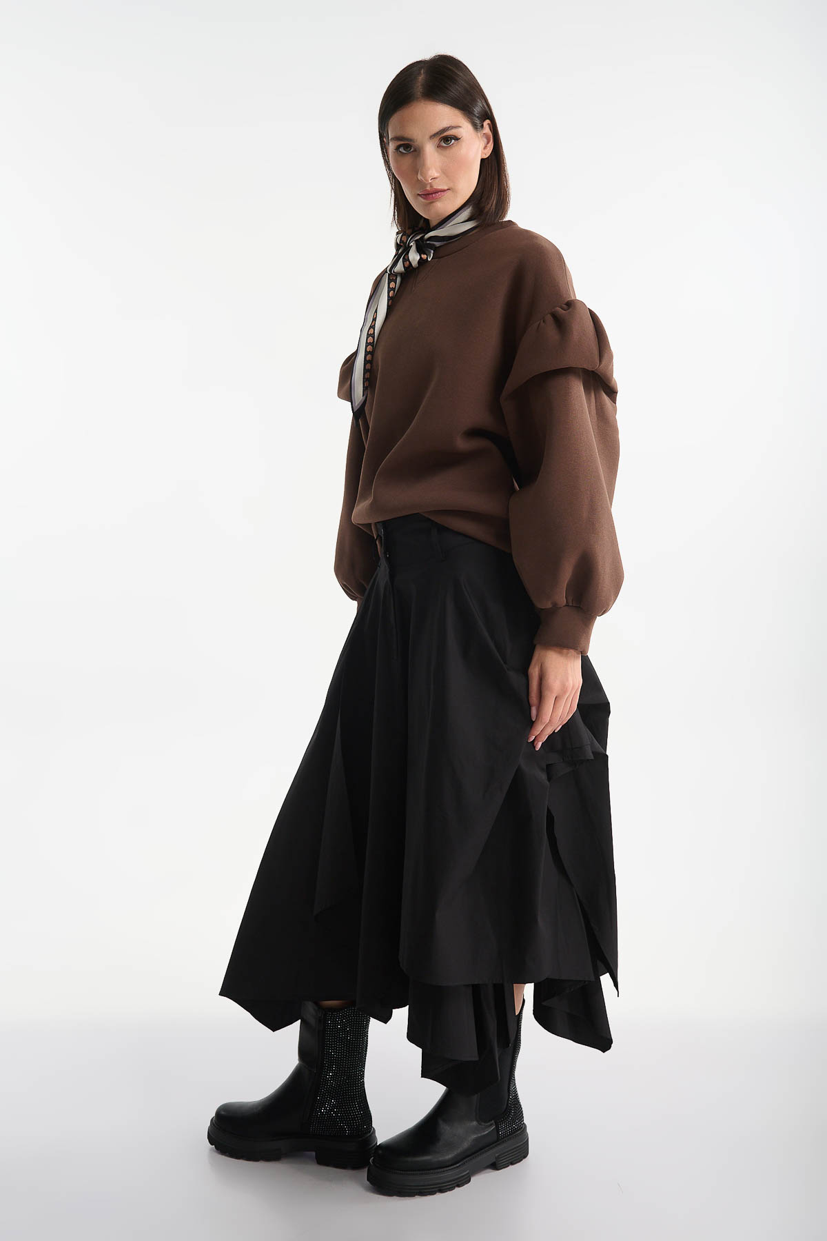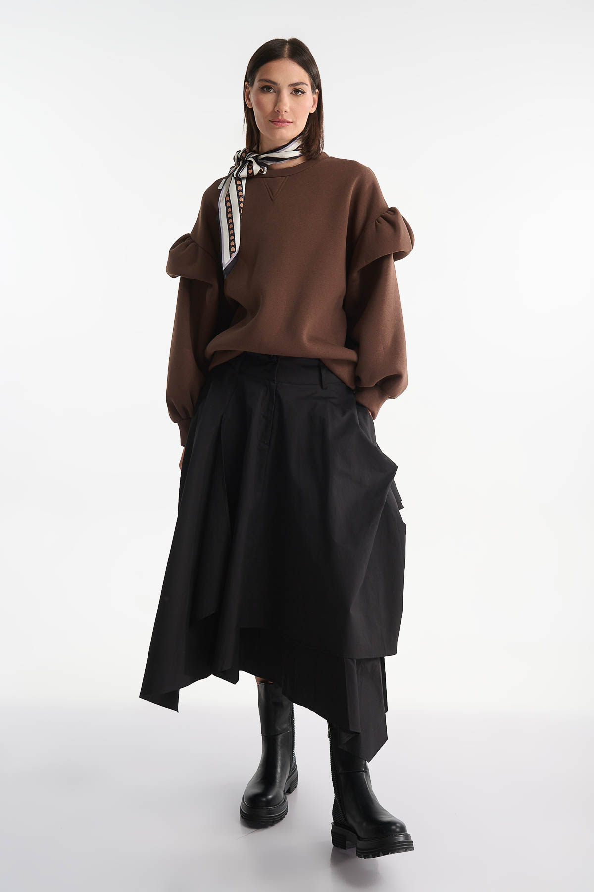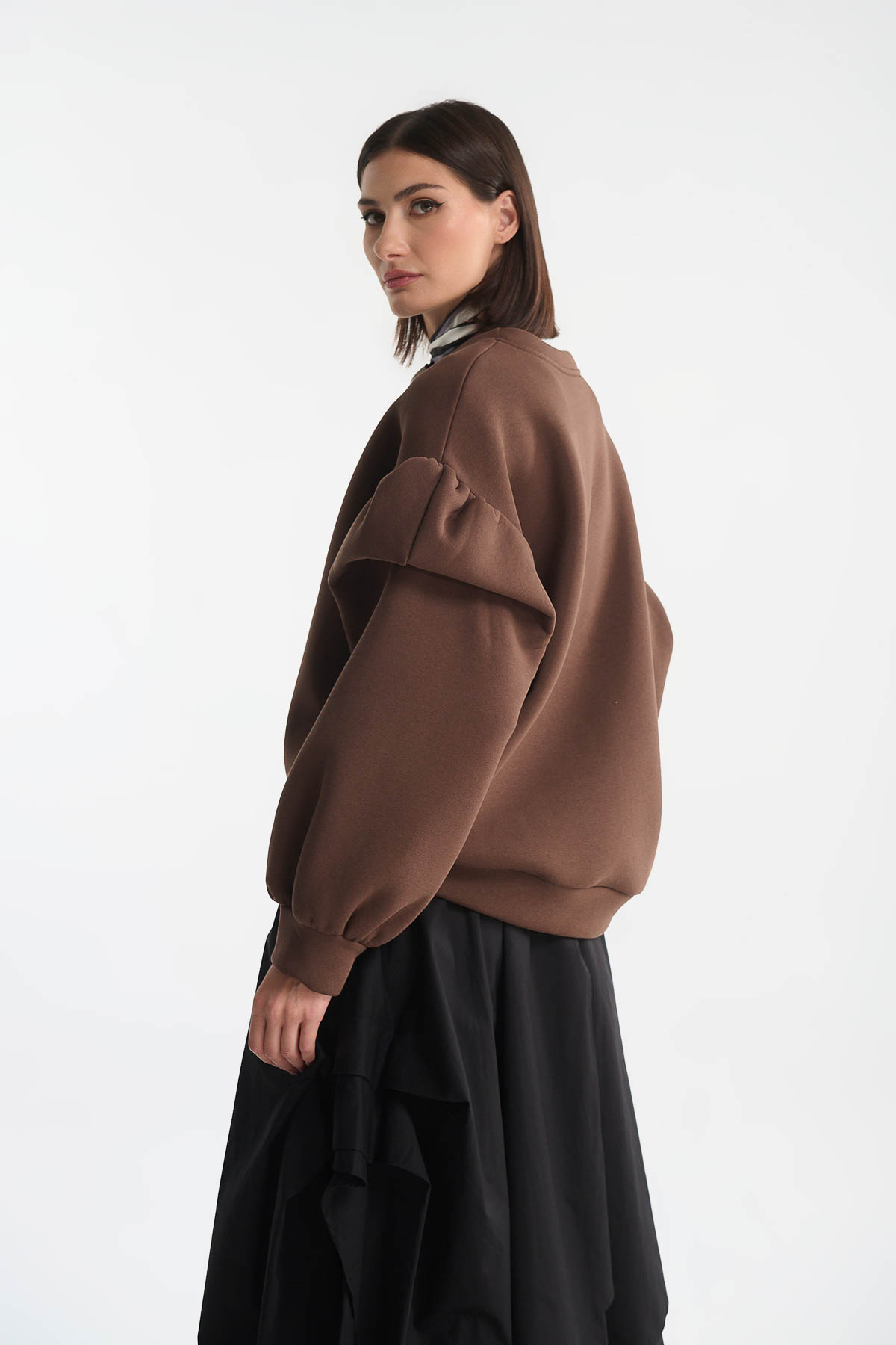 Μπλούζα φούτερ με βολάν στα μανίκια, σε γλυκιά σοκολατί απόχρωση που αποπνέει κομψότητα και ζεστασιά. Το μοναδικό design των balloon μανικιών με διακριτικά βολάν προσθέτει θηλυκότητα και fashion-forward χαρακτήρα στο look.Η χαλαρή γραμμή της προσφέρει άνεση και στυλ, ιδανική για layering ή για ένα statement outfit. Συνδυάστε την με wide-leg παντελόνες ή midi φούστες για πιο chic εμφανίσεις, ή με τζιν για ένα elevated casual look.