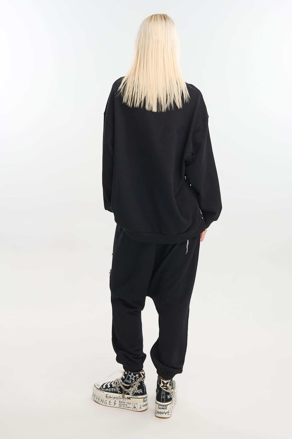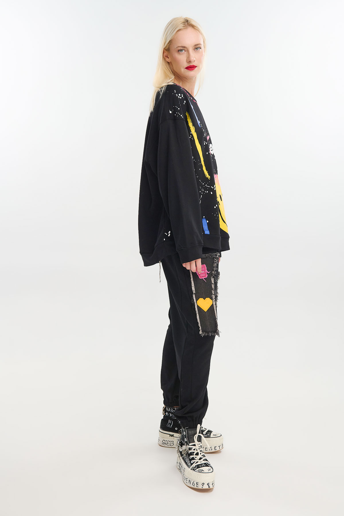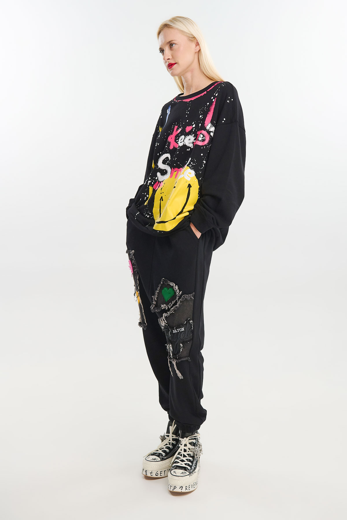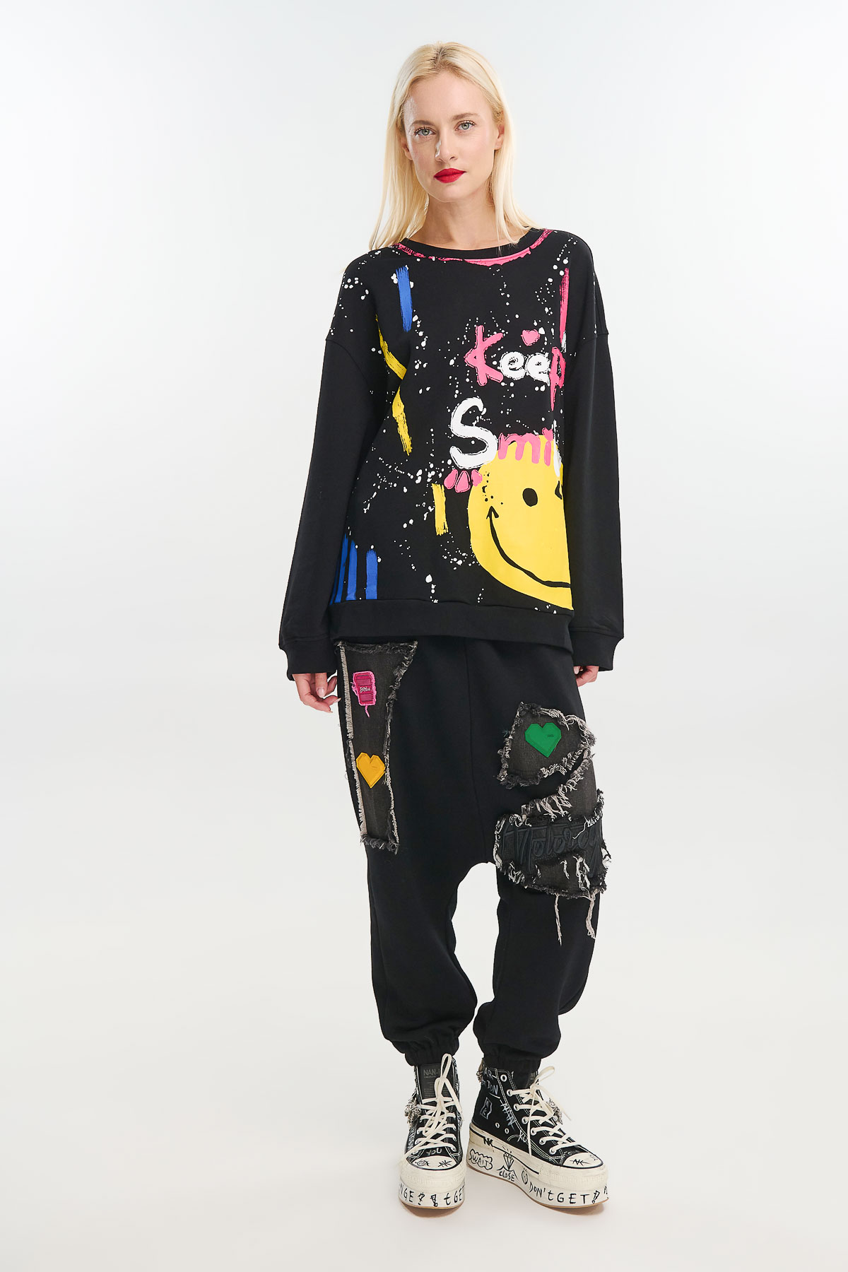 Άνετο φούτερ σε μαύρη βάση με πολύχρωμο print τύπου paint και το χαρακτηριστικό Smiley που αποπνέει θετική ενέργεια. Το σύνθημα “Keep Smile” στο μπροστινό μέρος προσθέτει playful χαρακτήρα, ενώ η oversized γραμμή του το κάνει ιδανικό για cool, streetwear εμφανίσεις. Καλύπτει απο XS έως 2XL . Συνδύασέ το με τζιν, joggers ή δερμάτινο παντελόνι για ένα casual look με fun διάθεση. Σύνθεση : 80% Cotton – 20% Polyester.