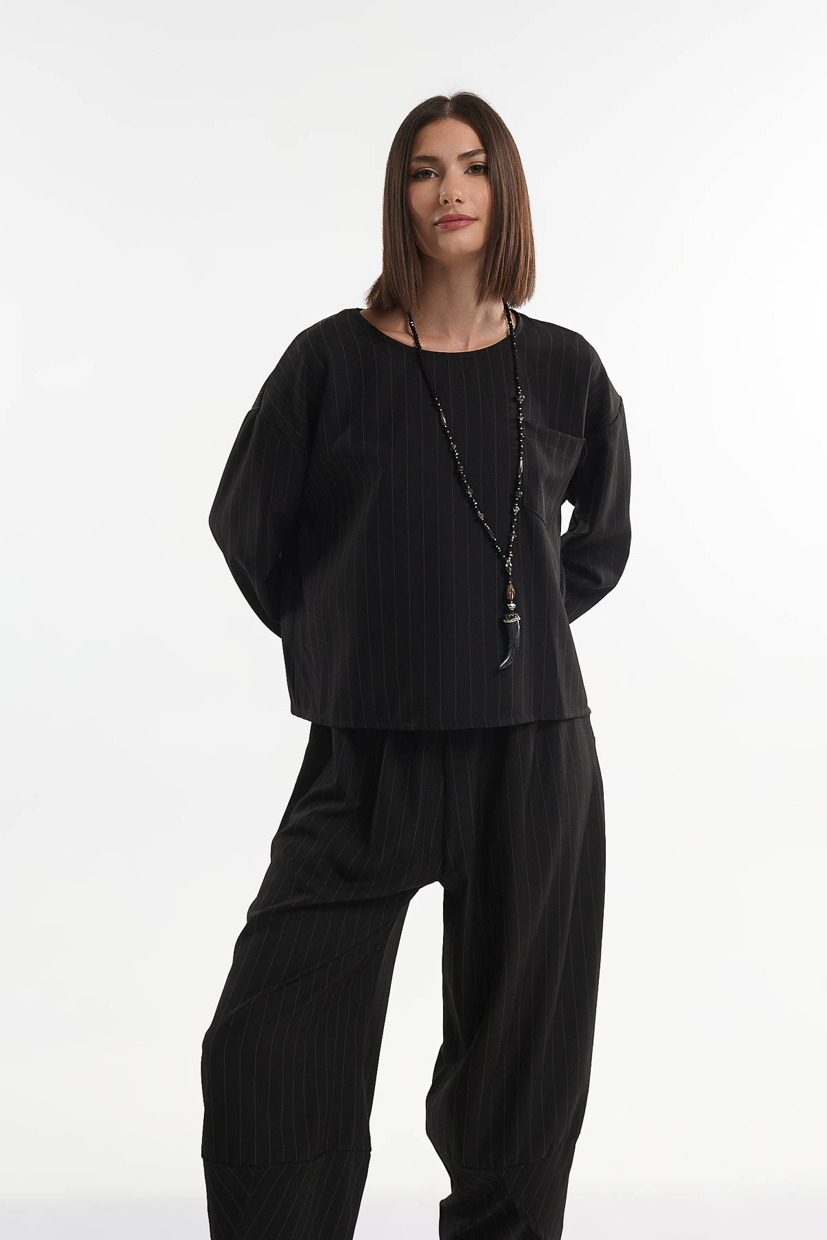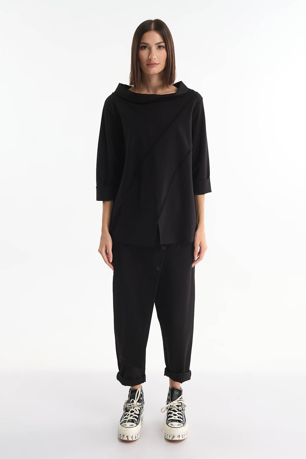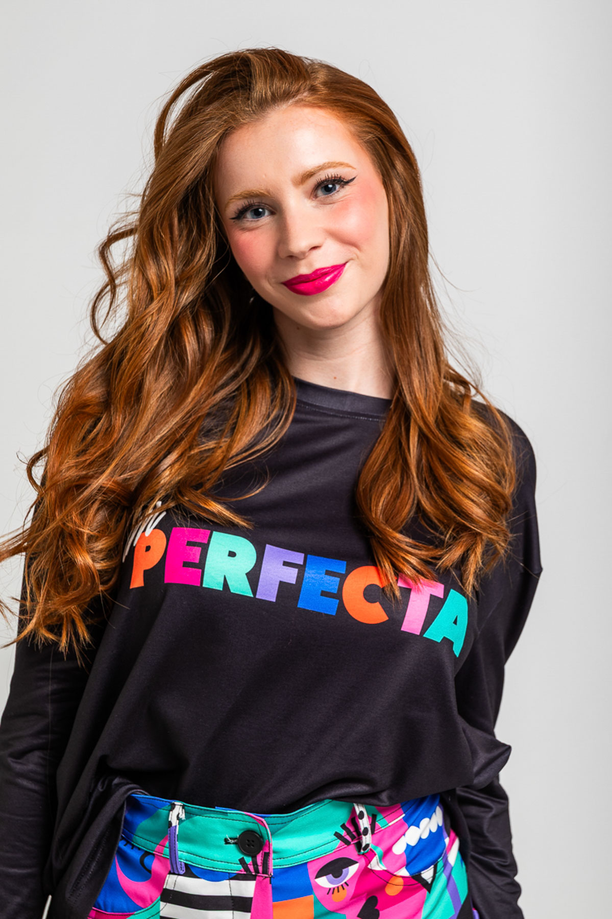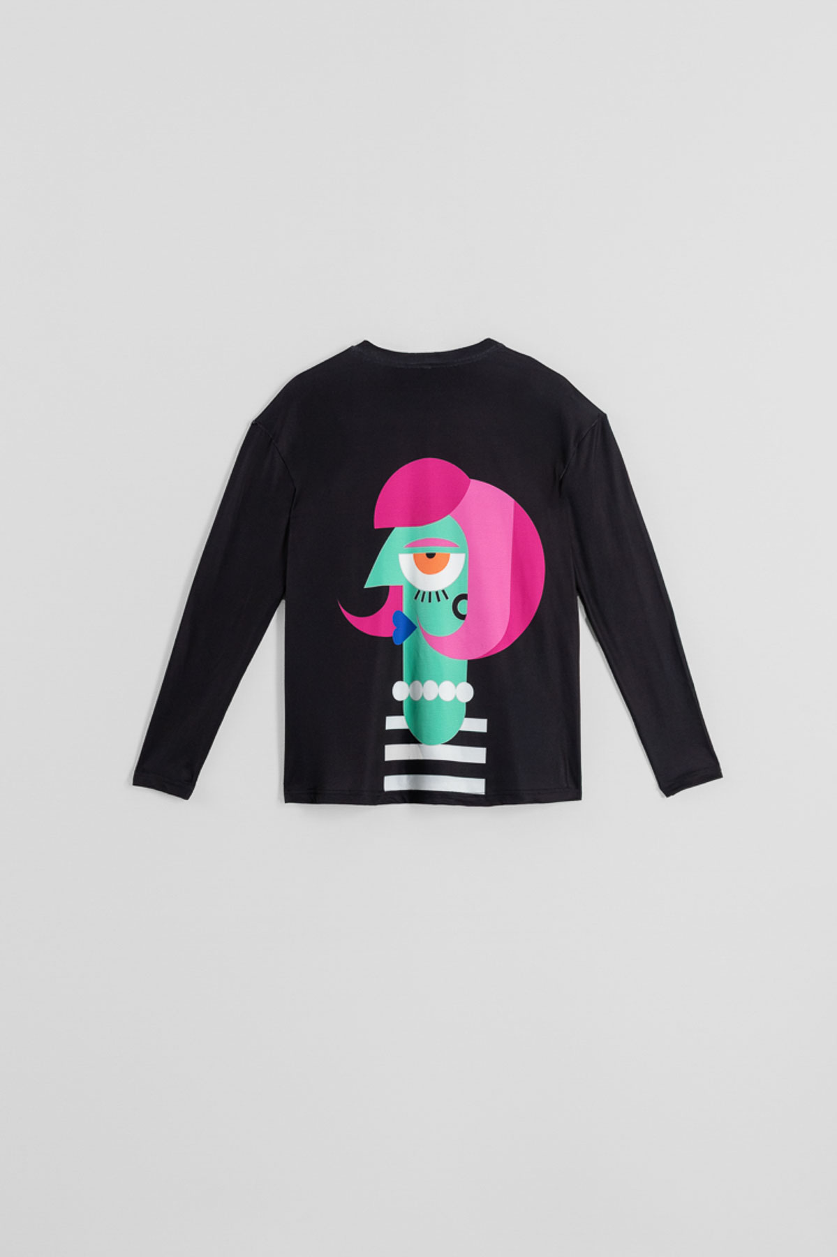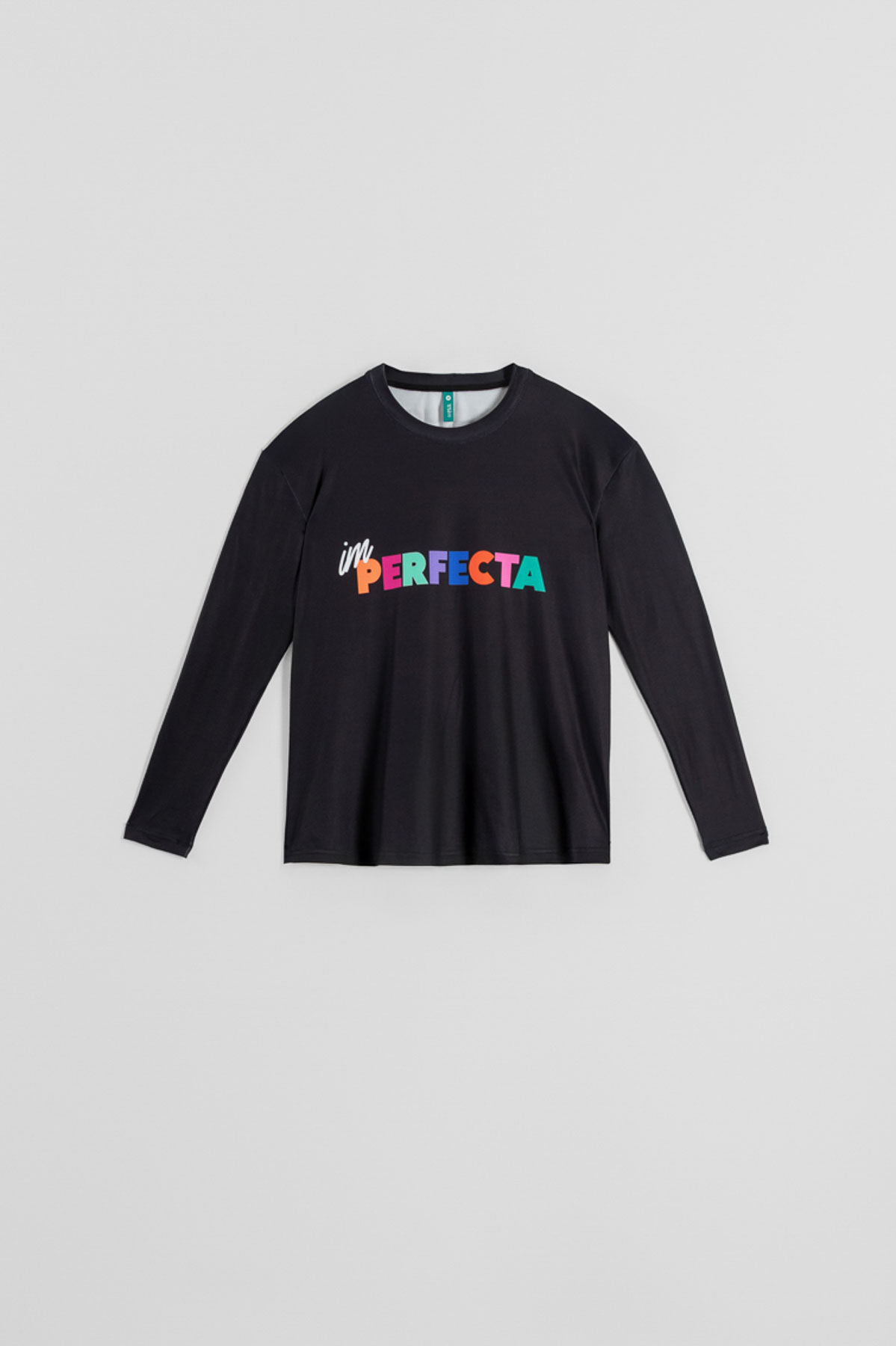 Μακρυμάνικη μπλούζα Lolina από την συλλογή ImPERFECTA, σε μαύρο χρώμα με ιδιαίτερο γραφιστικό σχέδιο εμπνευσμένο από τις γεωμετρικές φιγούρες Picasso. Διαθέτει χαλαρή εφαρμογή με ίσιο τετράγωνο κόψιμο, στρογγυλή λαιμόκοψη και πλάγιους ανοίγματα στο τελείωμα. Στο μπροστινό μέρος ξεχωρίζει το τύπωμα “imPERFECTA” σε έντονα πολύχρωμα γράμματα, ενώ στο πίσω μέρος υπάρχει εντυπωσιακή τοποθετημένη εικονογράφηση με γυναικεία φιγούρα σε ζωντανές αποχρώσεις. Ένα κομμάτι που συνδυάζει άνεση και δυναμικό χαρακτήρα.Σύνθεση: 95% Πολυεστέρας, 5% Ελαστάν.
