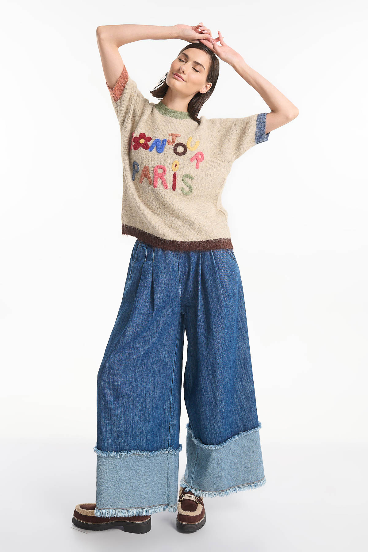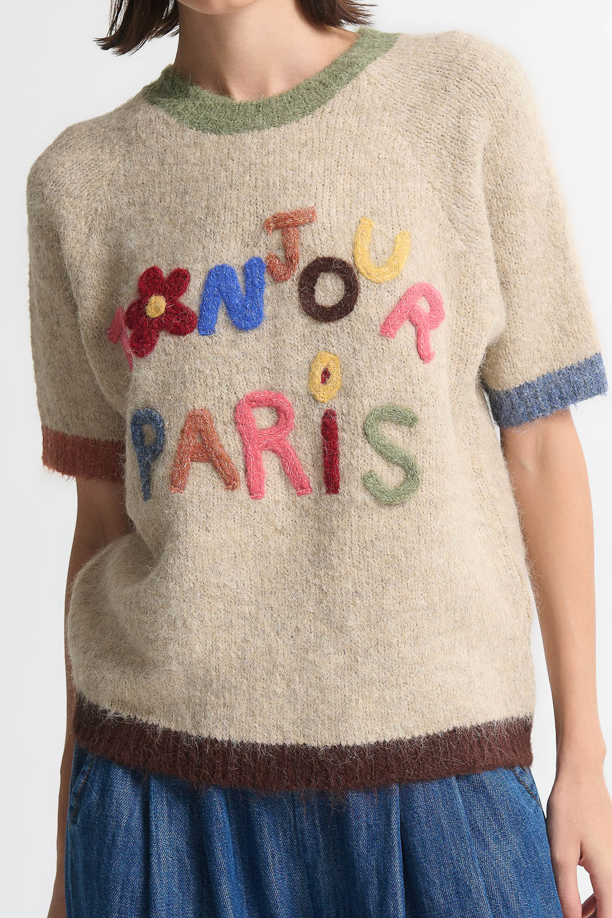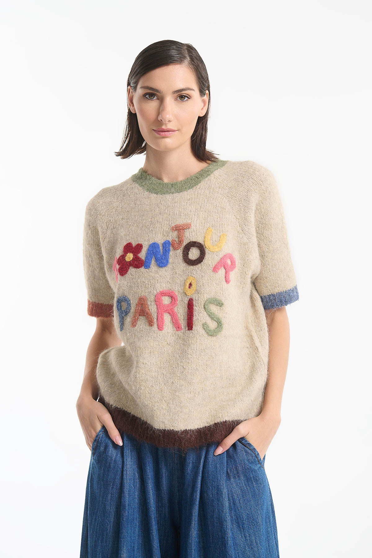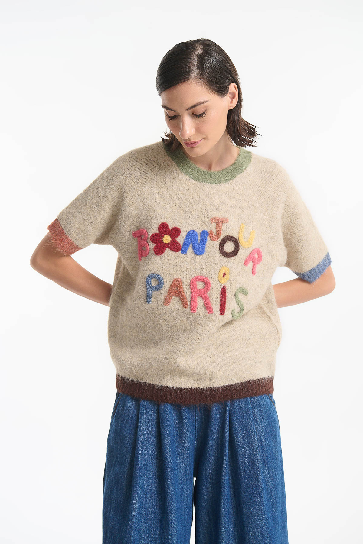 Μπλούζα πλεκτή με κοντό μανίκι και πολύχρωμο κεντητό σχέδιο “BONJOUR PARIS” στο μπροστινό μέρος. Διαθέτει τελειώματα σε διαφορετικά χρώματα στο λαιμό, στα μανίκια και στο κάτω μέρος, προσδίδοντας παιχνιδιάρικη και μοναδική αισθητική.