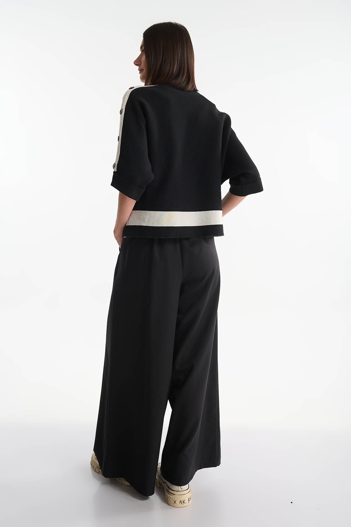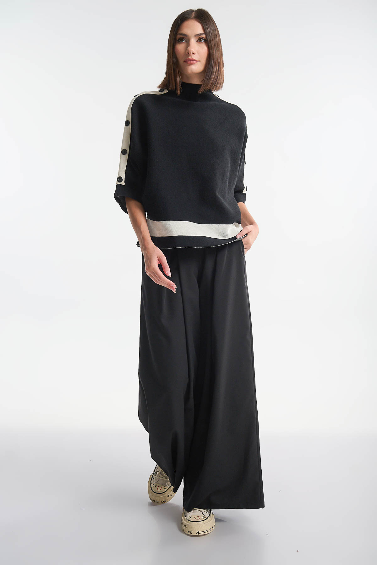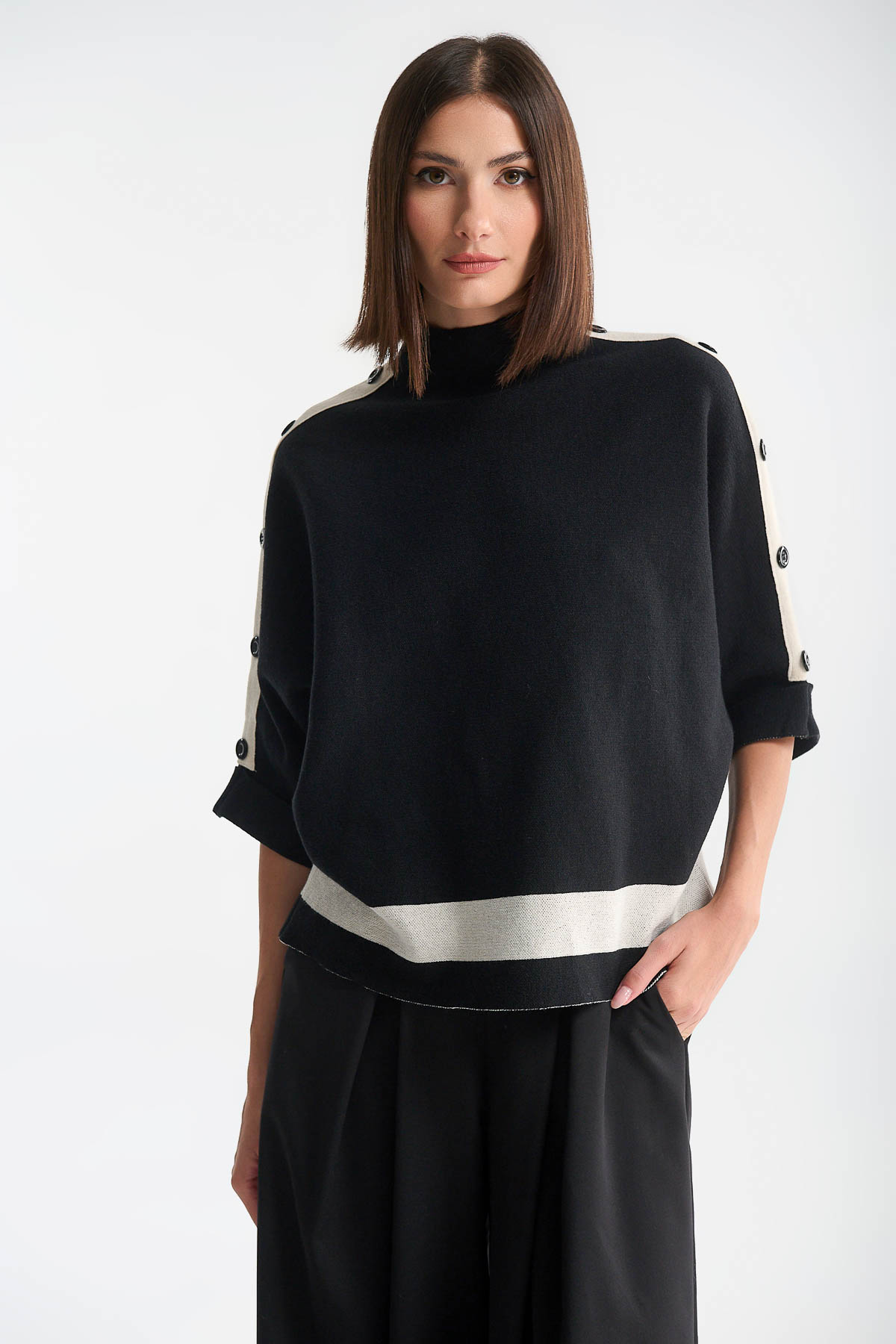 Μπλούζα πλεκτή σε minimal design με χαλαρή, boxy γραμμή. Διαθέτει κοντά μανίκια με λευκές φάσες και κομψά κουμπιά κατά μήκος, που προσθέτουν μία σύγχρονη πινελιά στο κλασικό μαύρο. Η λευκή λεπτομέρεια στη μέση δίνει ισορροπία και αντίθεση, κάνοντας τη μπλούζα ιδανική για συνδυασμούς τόσο με wide-leg παντελόνες όσο και με πιο εφαρμοστά κομμάτια. Ένα διαχρονικό κομμάτι που αποπνέει casual πολυτέλεια. Είναι one size και καλύπτει στήθος έως 115 cm . Μήκος : 65 cm . Σύνθεση : 49% Viscose – 30% Polyester – 21% Nylon.