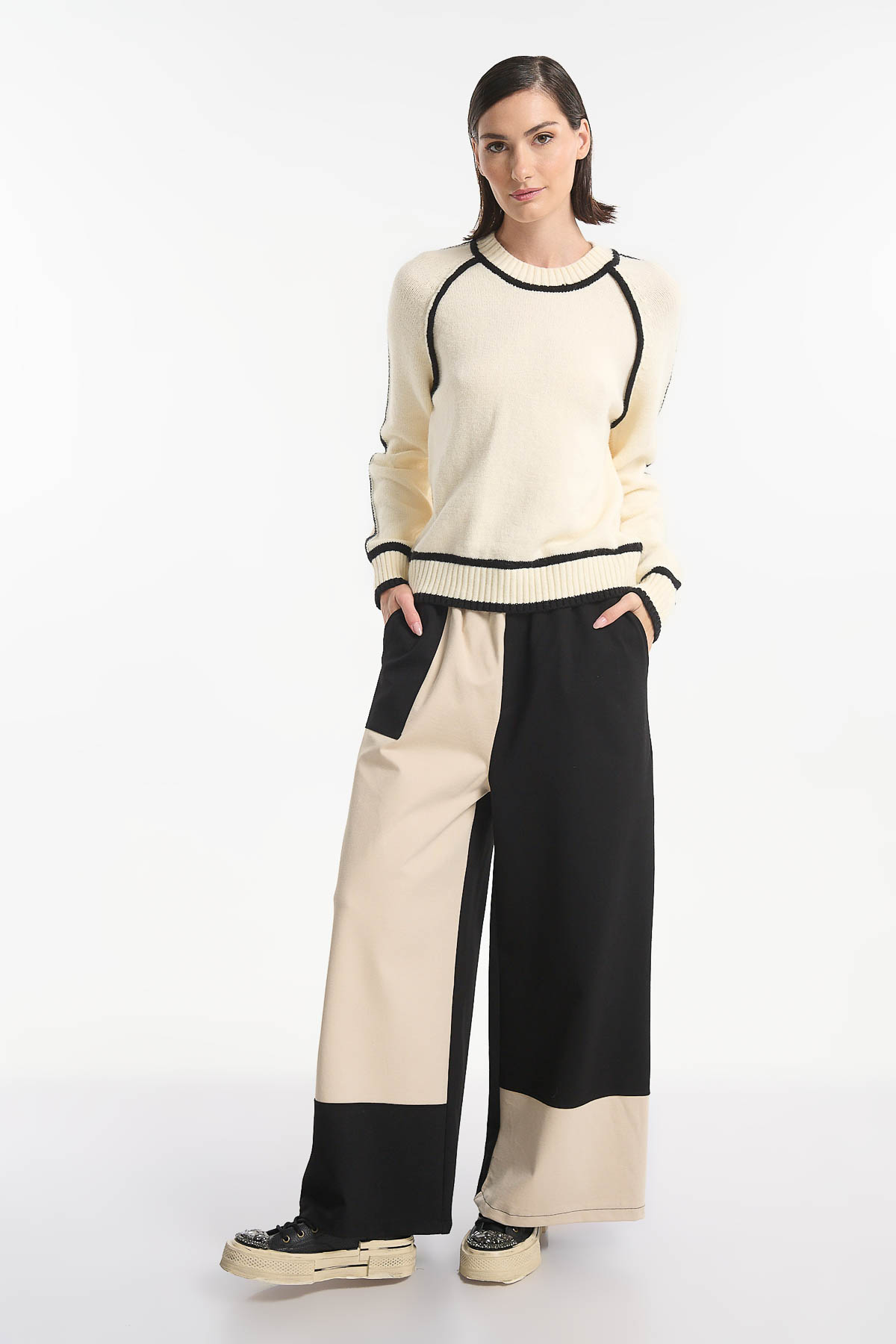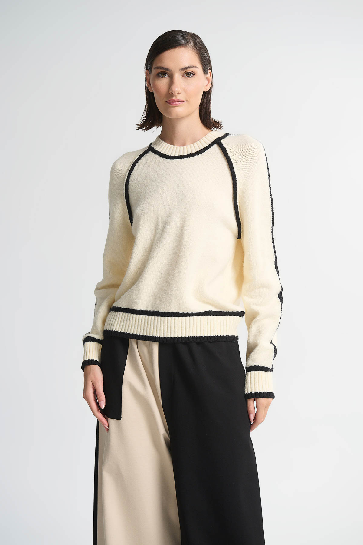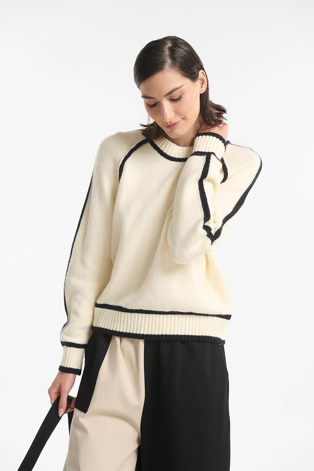 Πλεκτή μπλούζα με μοντέρνο και minimal σχεδιασμό, ιδανική για καθημερινές αλλά και πιο στυλάτες εμφανίσεις. Διαθέτει στρογγυλή λαιμόκοψη και διακριτική αντίθεση με ρίγες σε μανίκια, λαιμό και τελείωμα, προσθέτοντας μια κομψή λεπτομέρεια στο look σας. Μήκος : 64 cm . Καλύπτει στήθος έως 108 cm . Σύνθεση : 45% Acrylic – 29% Polyester – 26% Nylon.