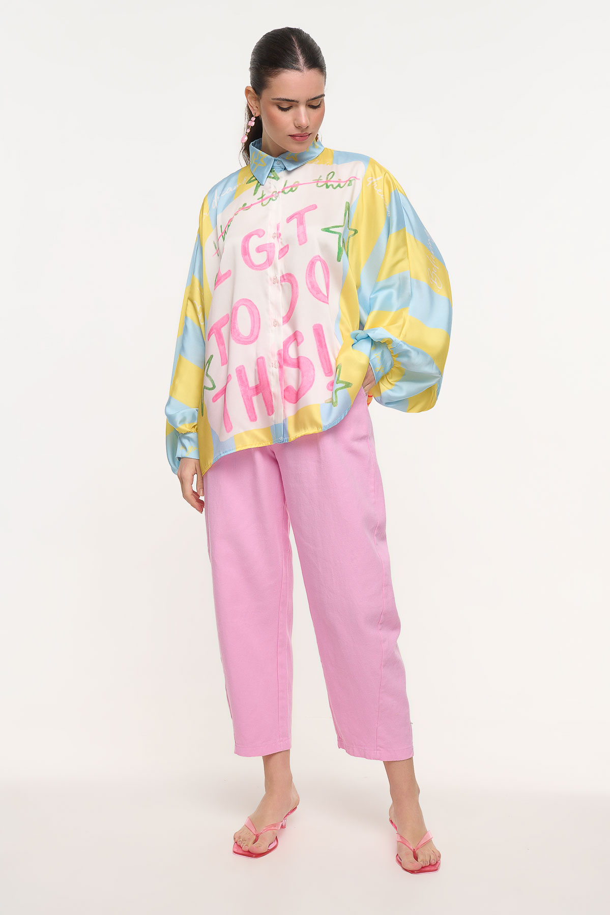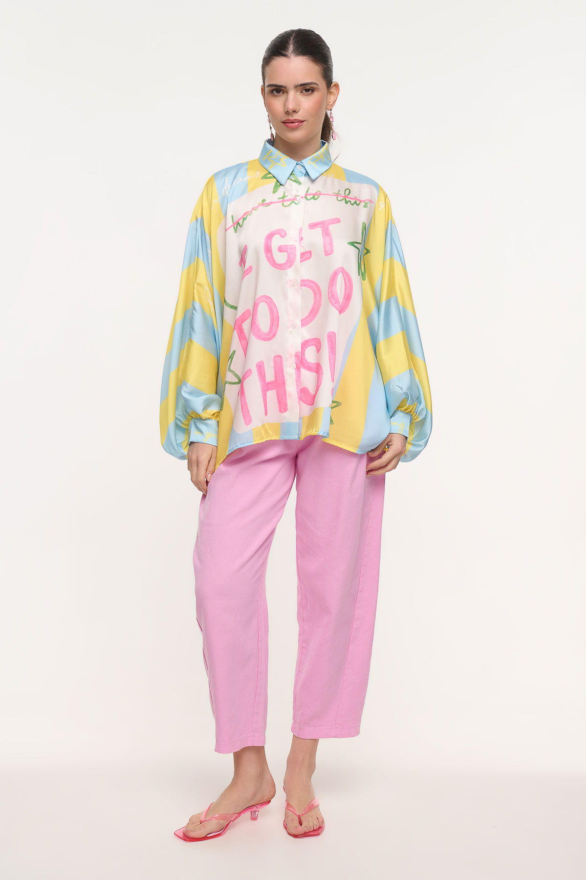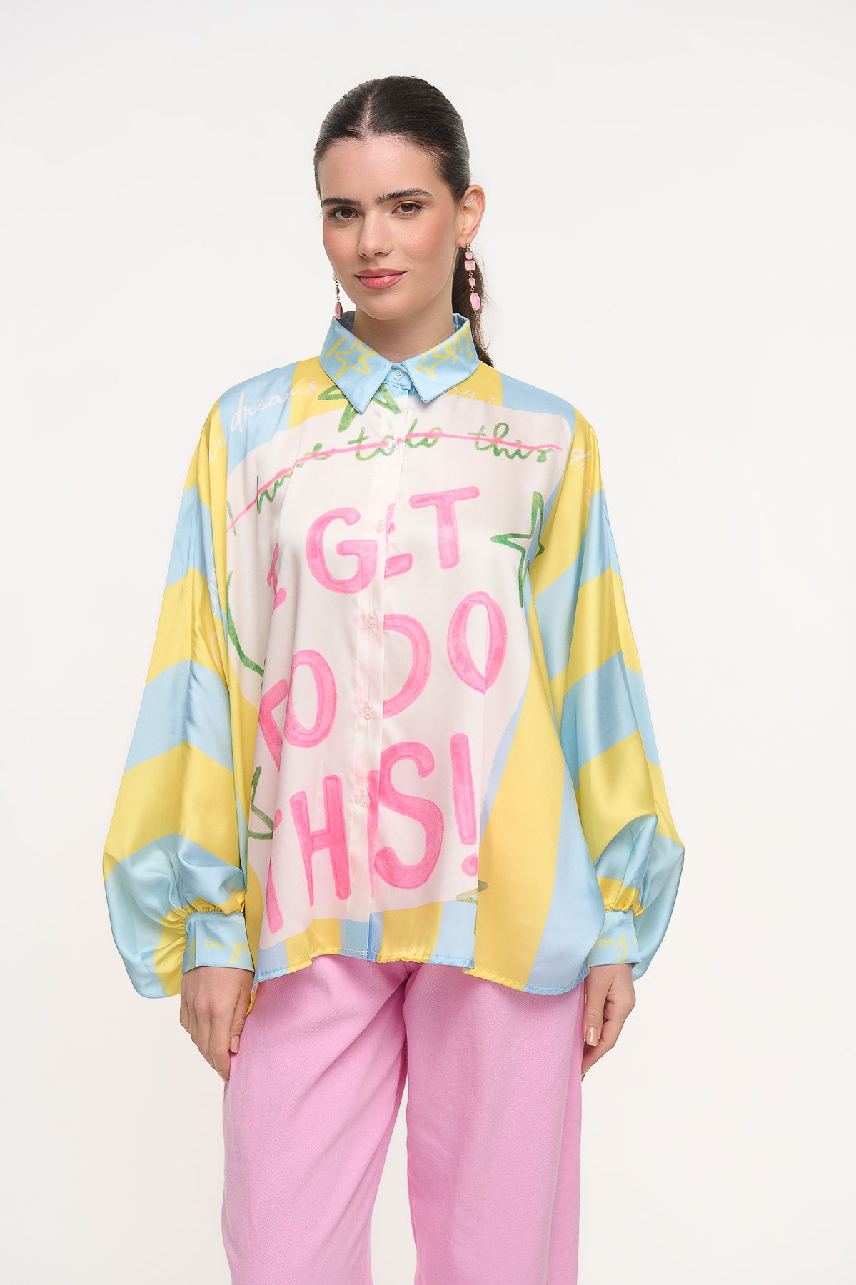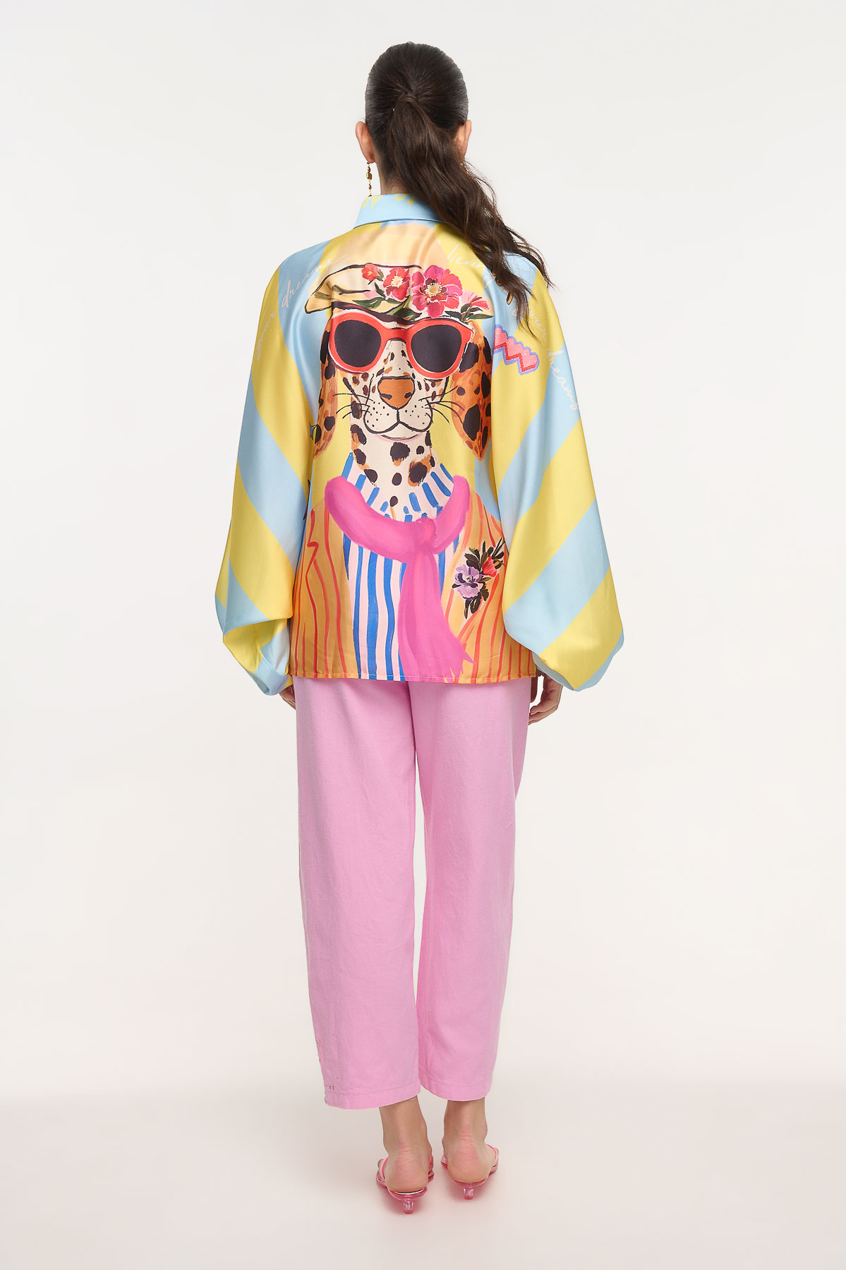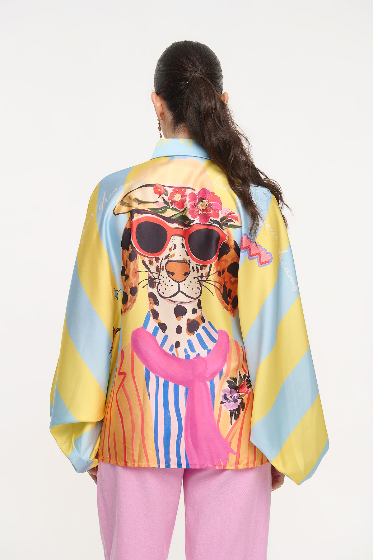 Εντυπωσιακή σατινέ πουκαμίσα με καλλιτεχνικό print και ιδιαίτερα ζωηρά χρώματα που δημιουργούν ένα μοναδικό fashion statement. Το σχέδιο συνδυάζει playful γραφικά στοιχεία στο μπροστινό μέρος με ένα ξεχωριστό illustration στο πίσω μέρος, χαρίζοντας στο κομμάτι μια έντονα δημιουργική και μοντέρνα αισθητική. Η oversized γραμμή της προσφέρει άνεση και κομψότητα, ενώ το σατινέ ύφασμα χαρίζει απαλή υφή και ελαφριά λάμψη.