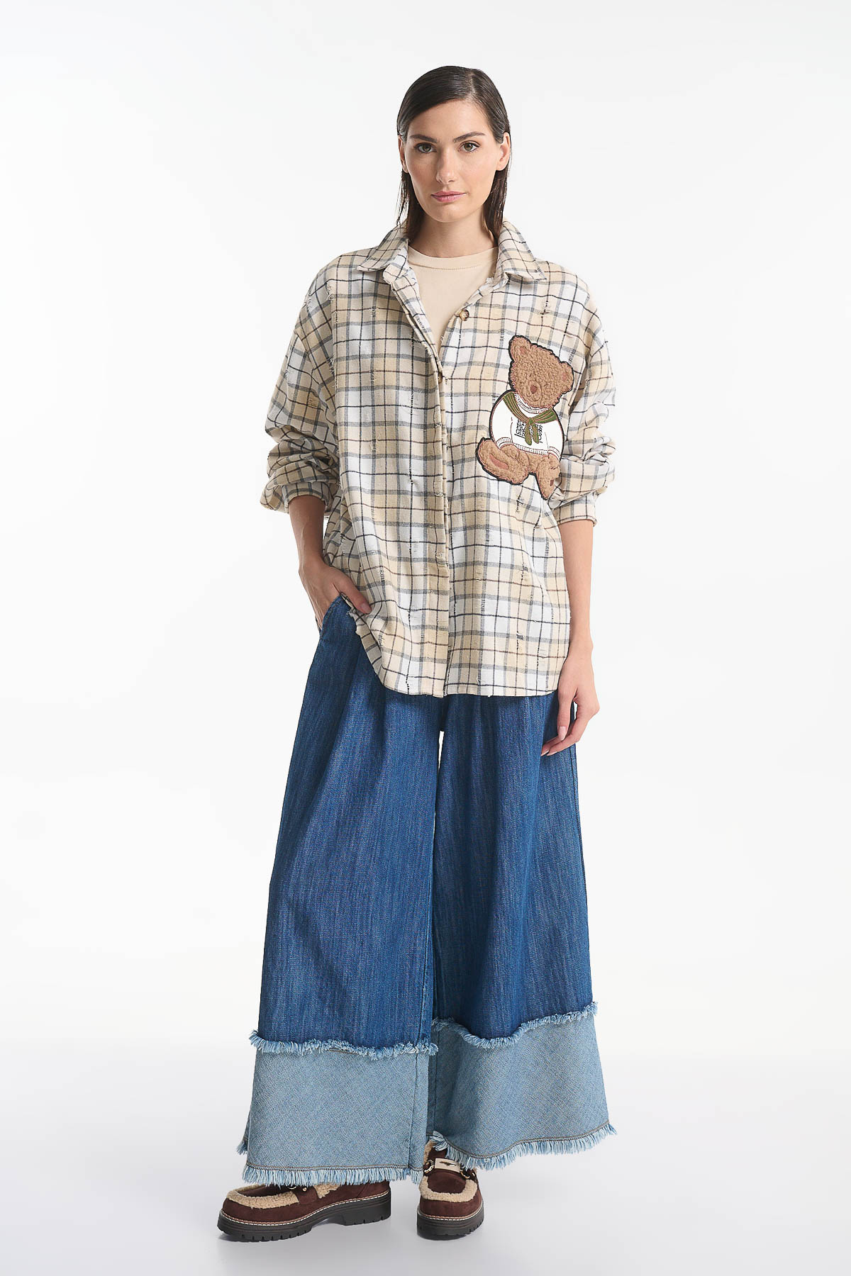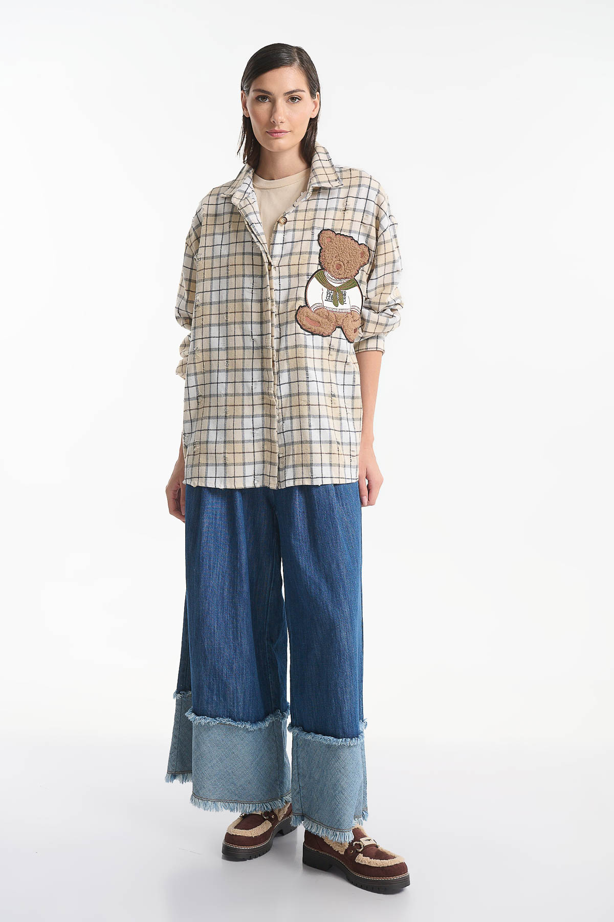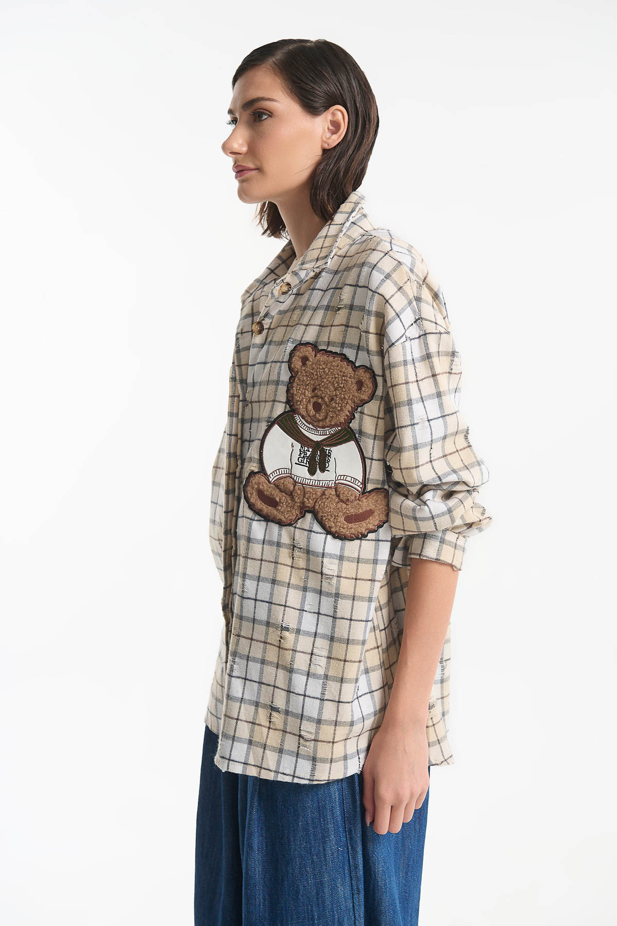 Πουκάμισο καρό oversized σε γήινους τόνους. Διαθέτει εντυπωσιακό patch αρκουδάκι στο μπροστινό μέρος, που χαρίζει παιχνιδιάρικη και μοναδική πινελιά στο outfit σας. Ιδανικό για layered εμφανίσεις, φοριέται είτε ανοιχτό πάνω από T-shirt είτε κλειστό . Μήκος : 78 cm . Καλύπτει στήθος έως 126 cm . Σύνθεση : 65% Cotton – 35% Viscose .