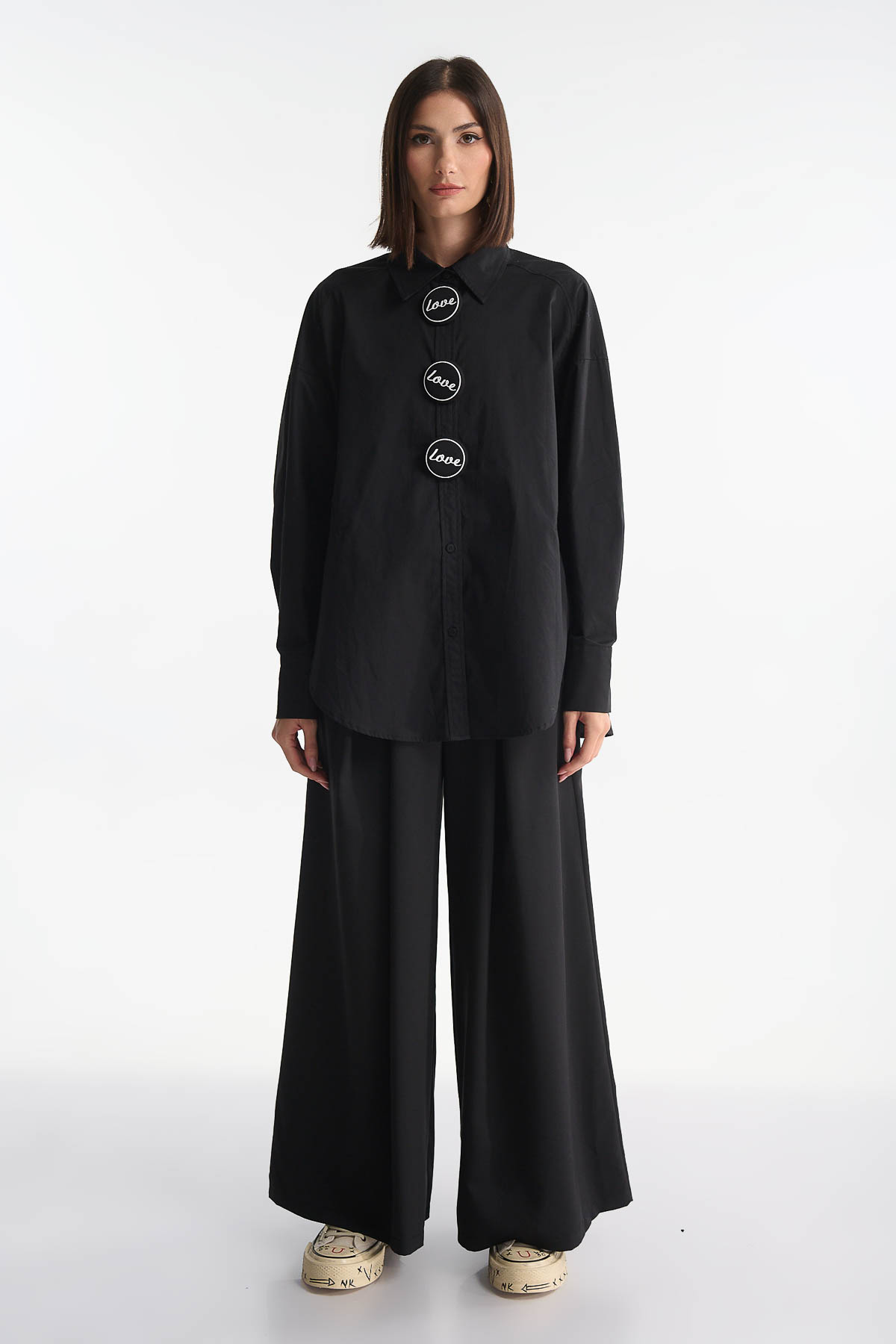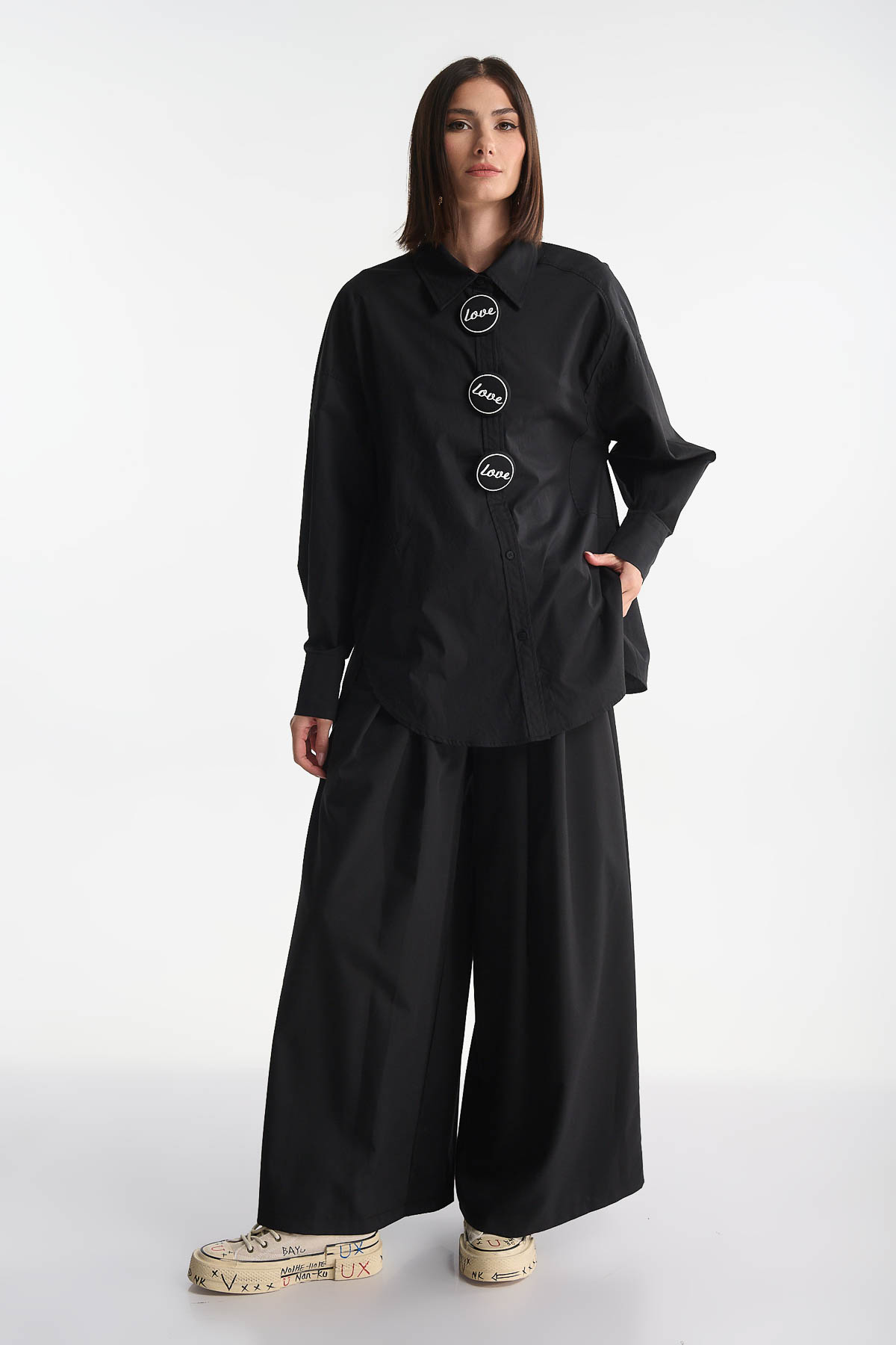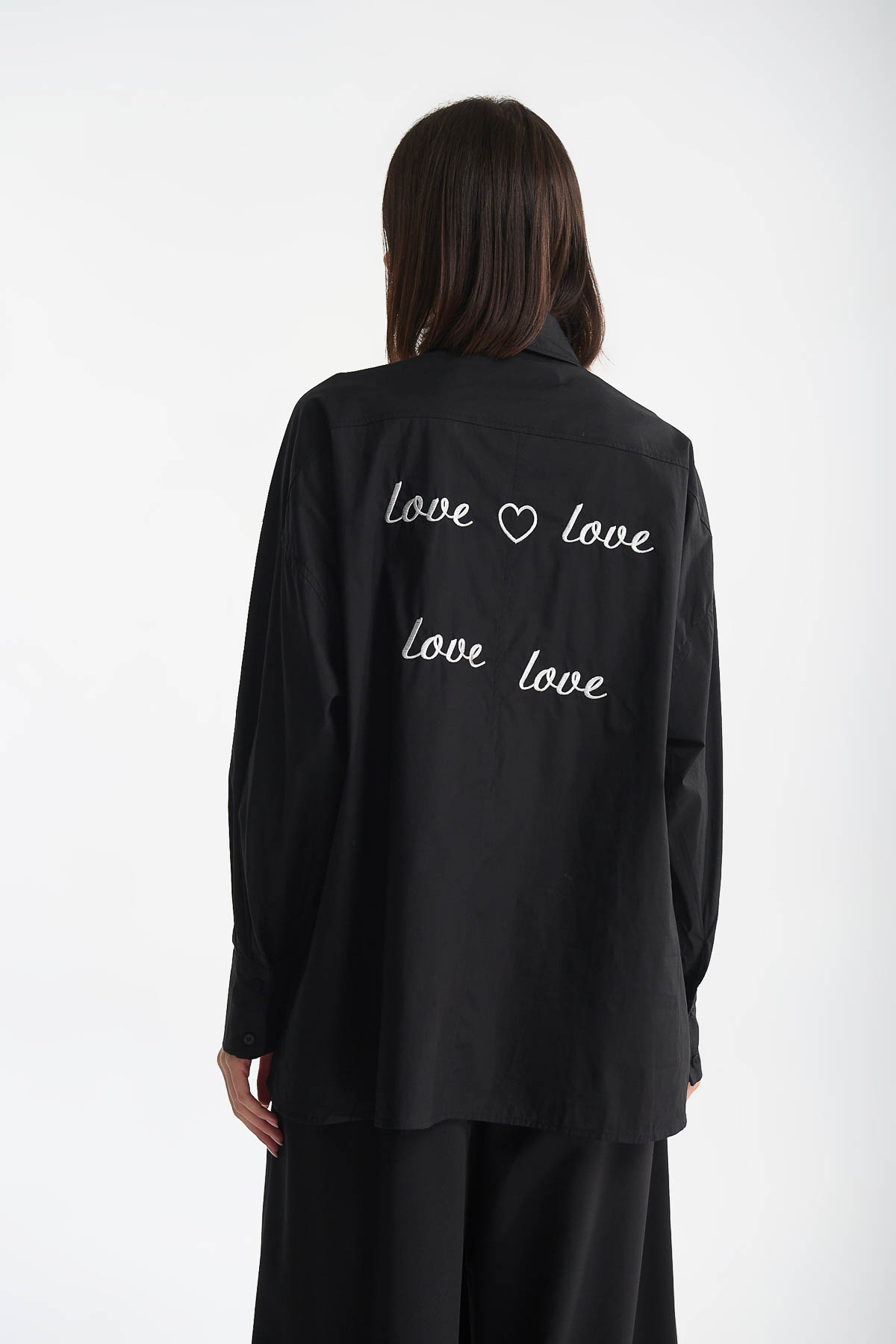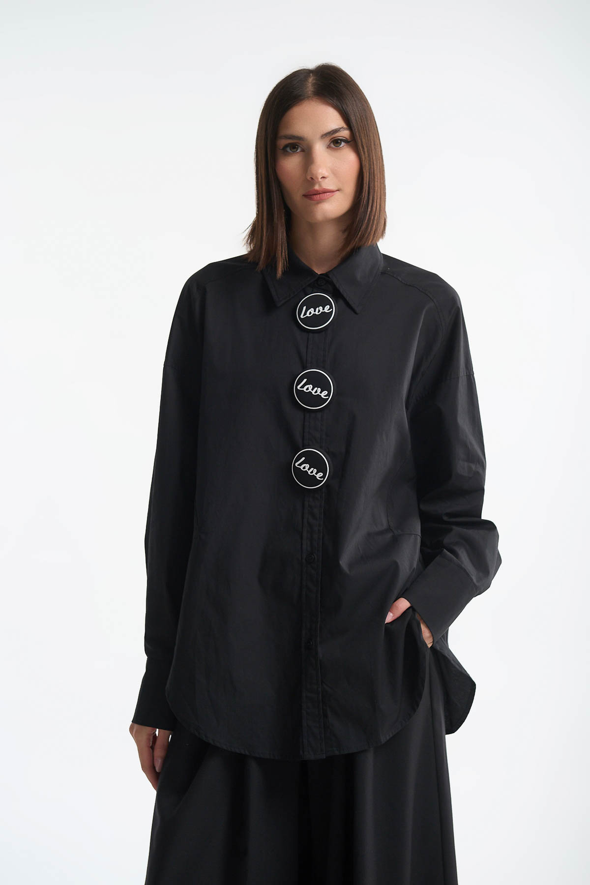 Πουκάμισο Love Cotton – Ένα ιδιαίτερο statement κομμάτι που συνδυάζει minimal αισθητική με playful λεπτομέρειες. Σε oversized γραμμή για άνεση και στυλ, με μεγάλα διακοσμητικά κουμπιά στο μπροστινό μέρος που αναγράφουν τη λέξη love, ενώ στο πίσω μέρος το κέντημα προσθέτει μια ξεχωριστή πινελιά.