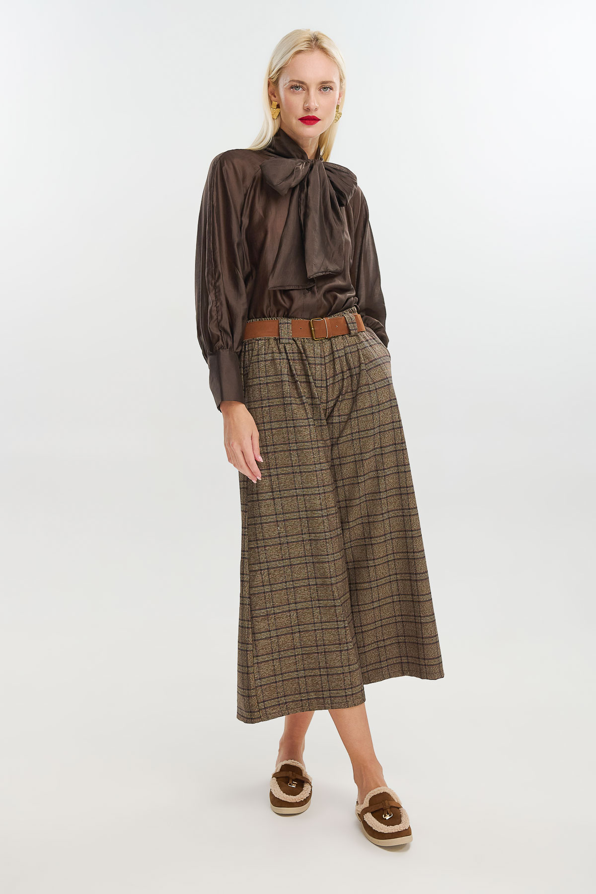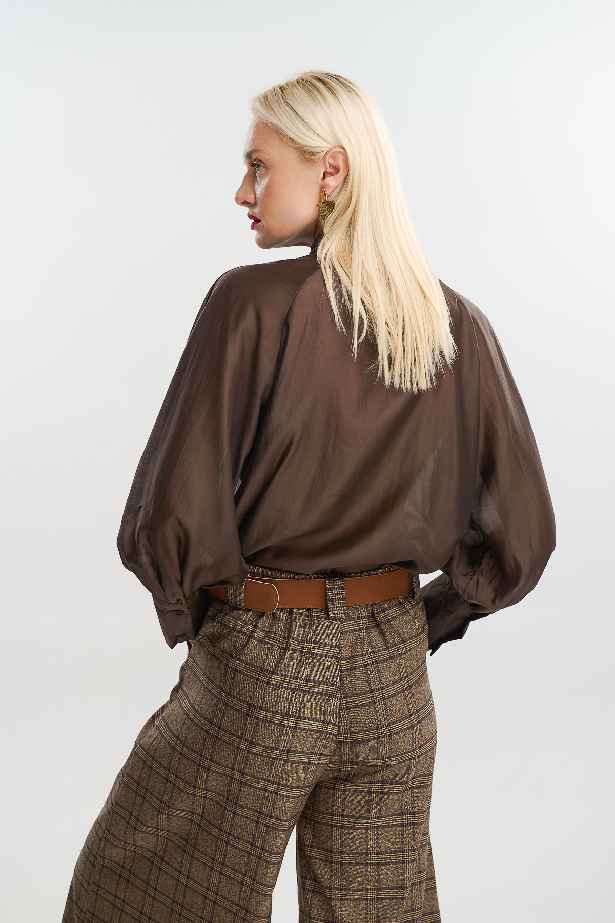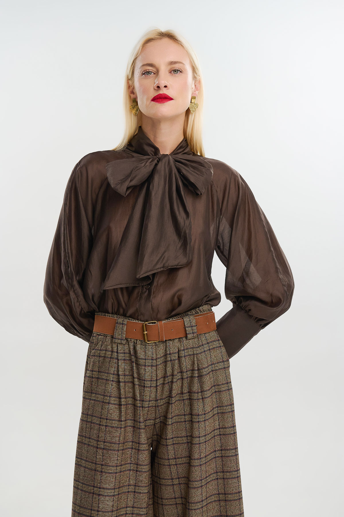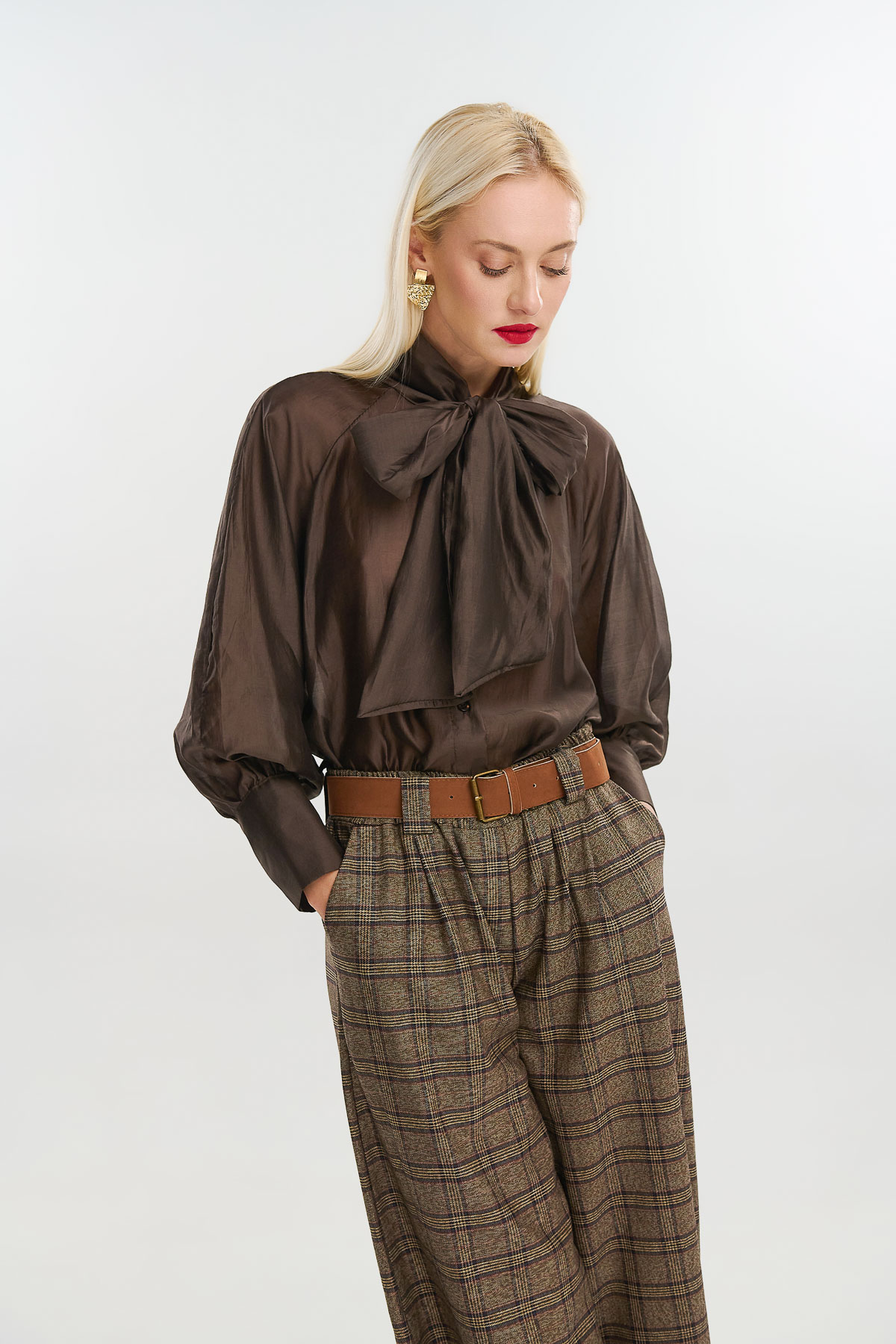 Αέρινο και κομψό πουκάμισο από ημιδιάφανο ύφασμα, με εντυπωσιακό δέσιμο-φιόγκο στο λαιμό. Διαθέτει μακριά φουσκωτά μανίκια με φαρδιά μανσέτα και κλασική γραμμή που αναδεικνύει τη θηλυκότητα και το στιλ.