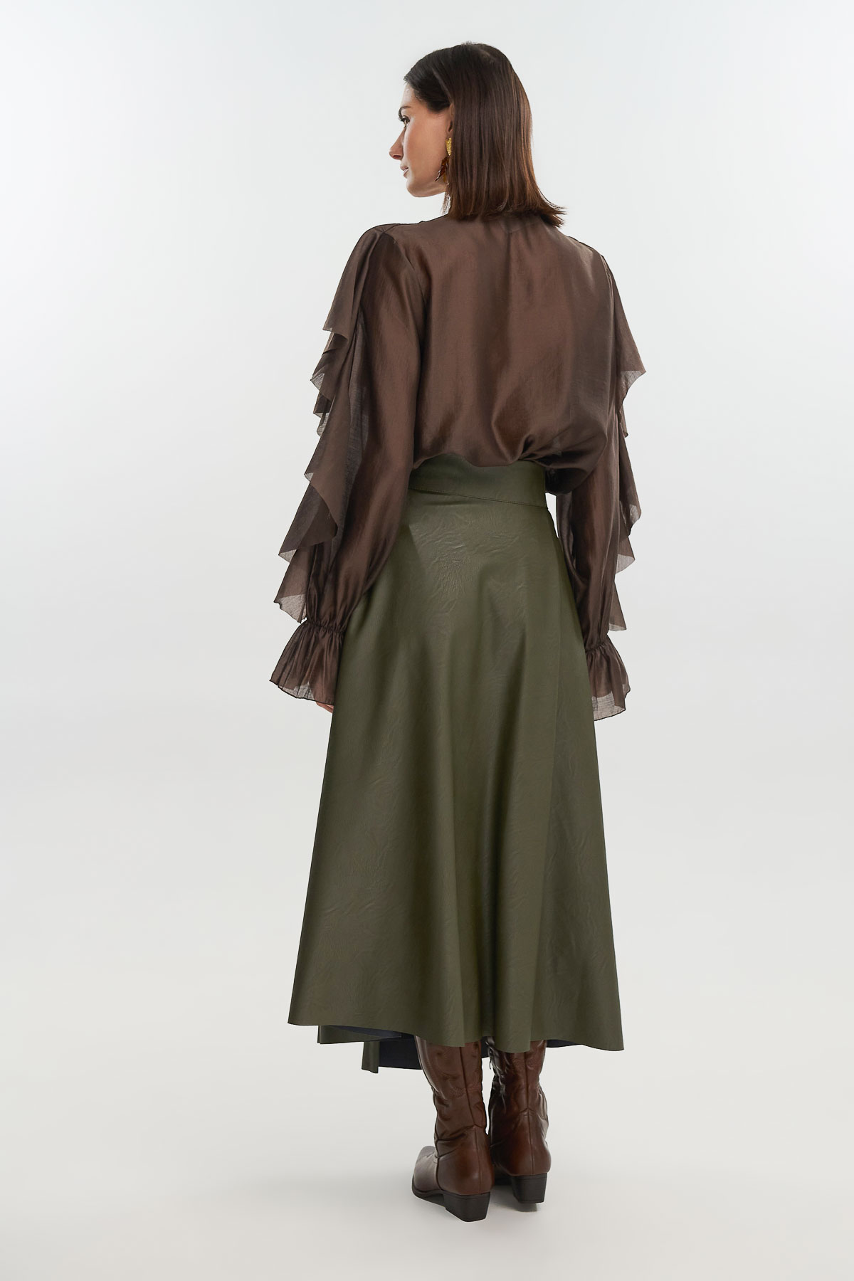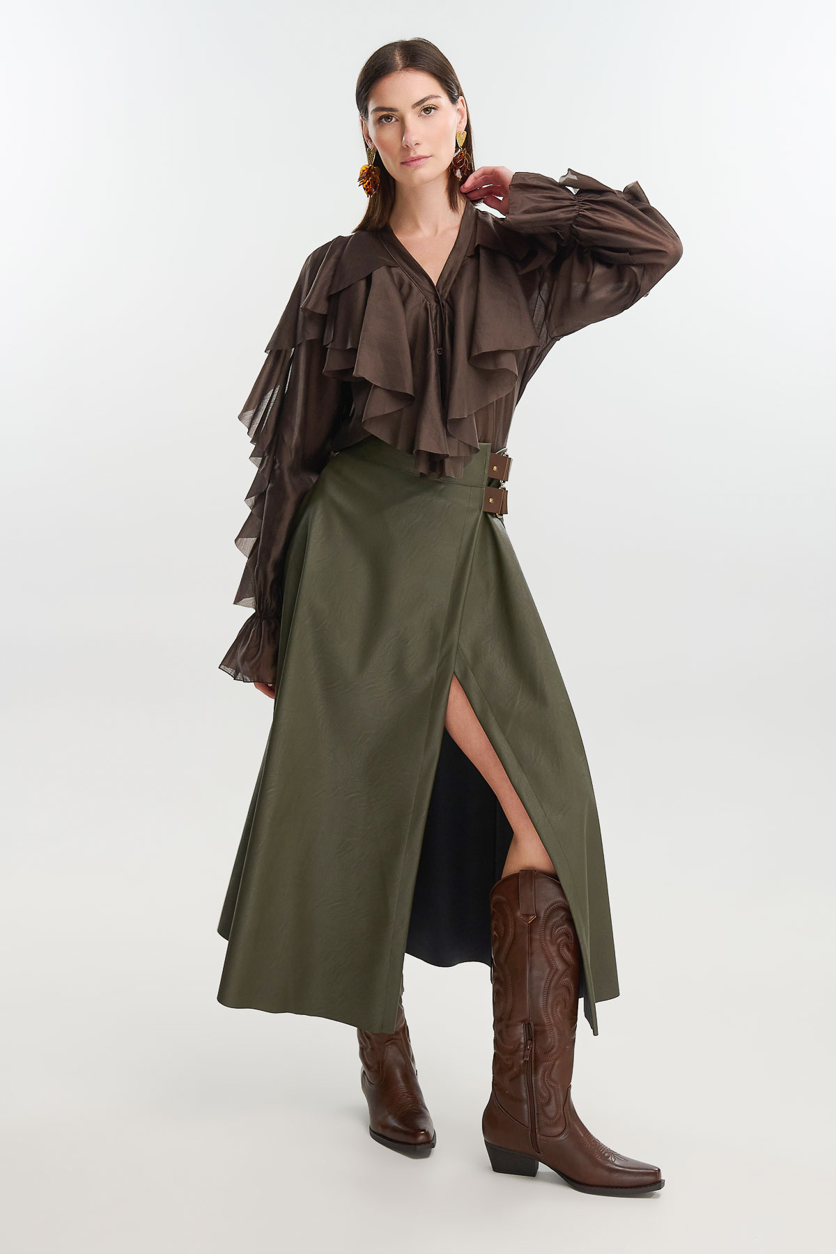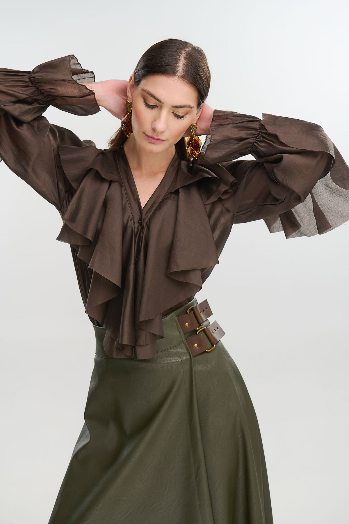 Αέρινο και εντυπωσιακό πουκάμισο με see-through υφή και πλούσια βολάν που χαρίζουν κίνηση και θηλυκότητα. Η ανάλαφρη σύνθεση από tencel προσφέρει δροσερή αίσθηση και διακριτική λάμψη, ενώ η loose γραμμή του εξασφαλίζει άνεση και κομψότητα σε κάθε περίσταση.