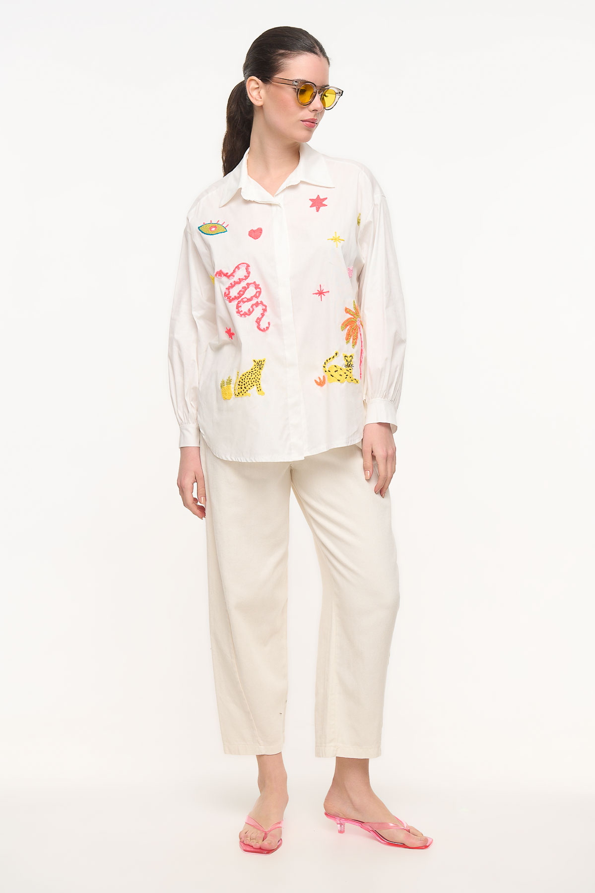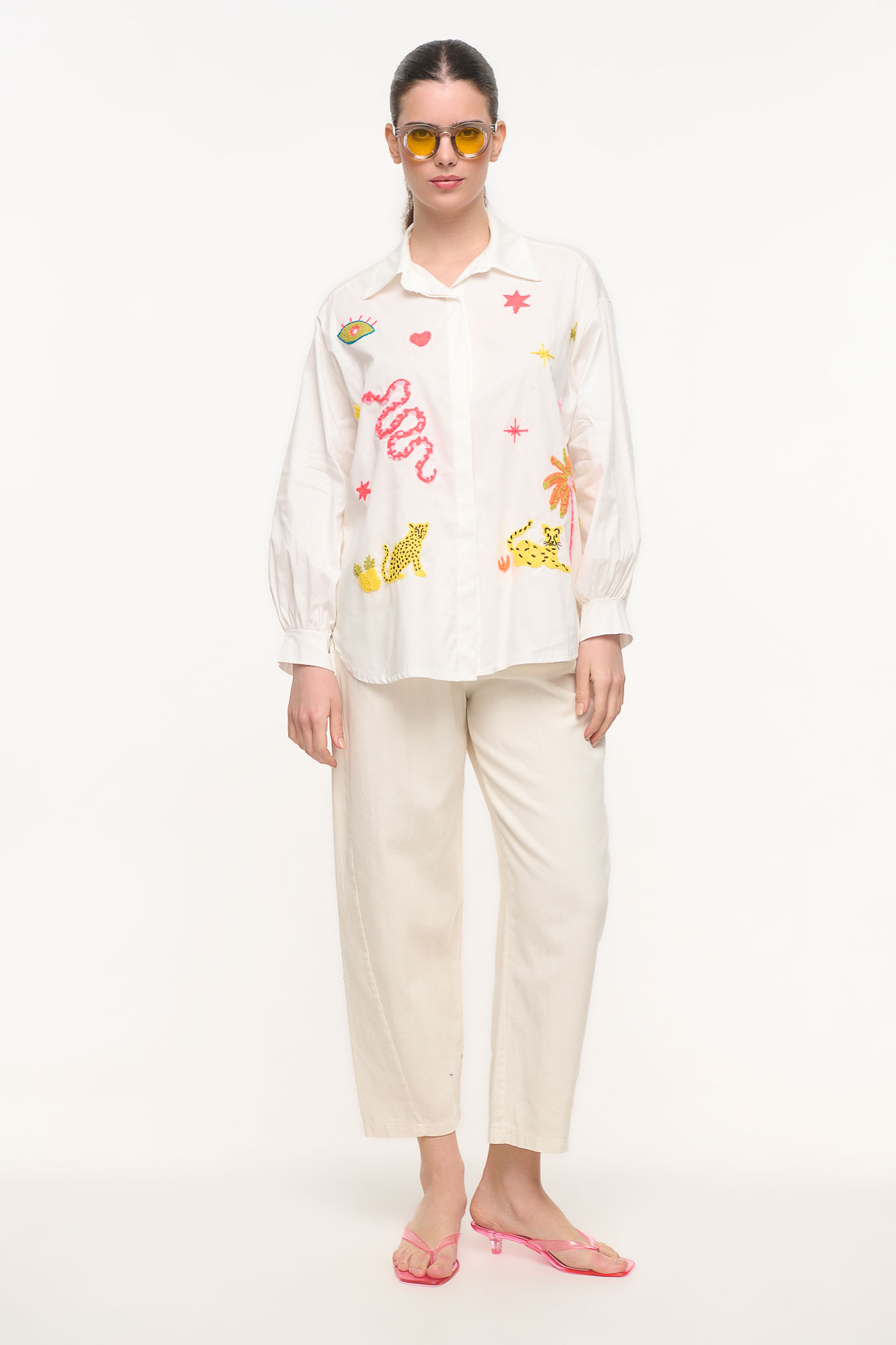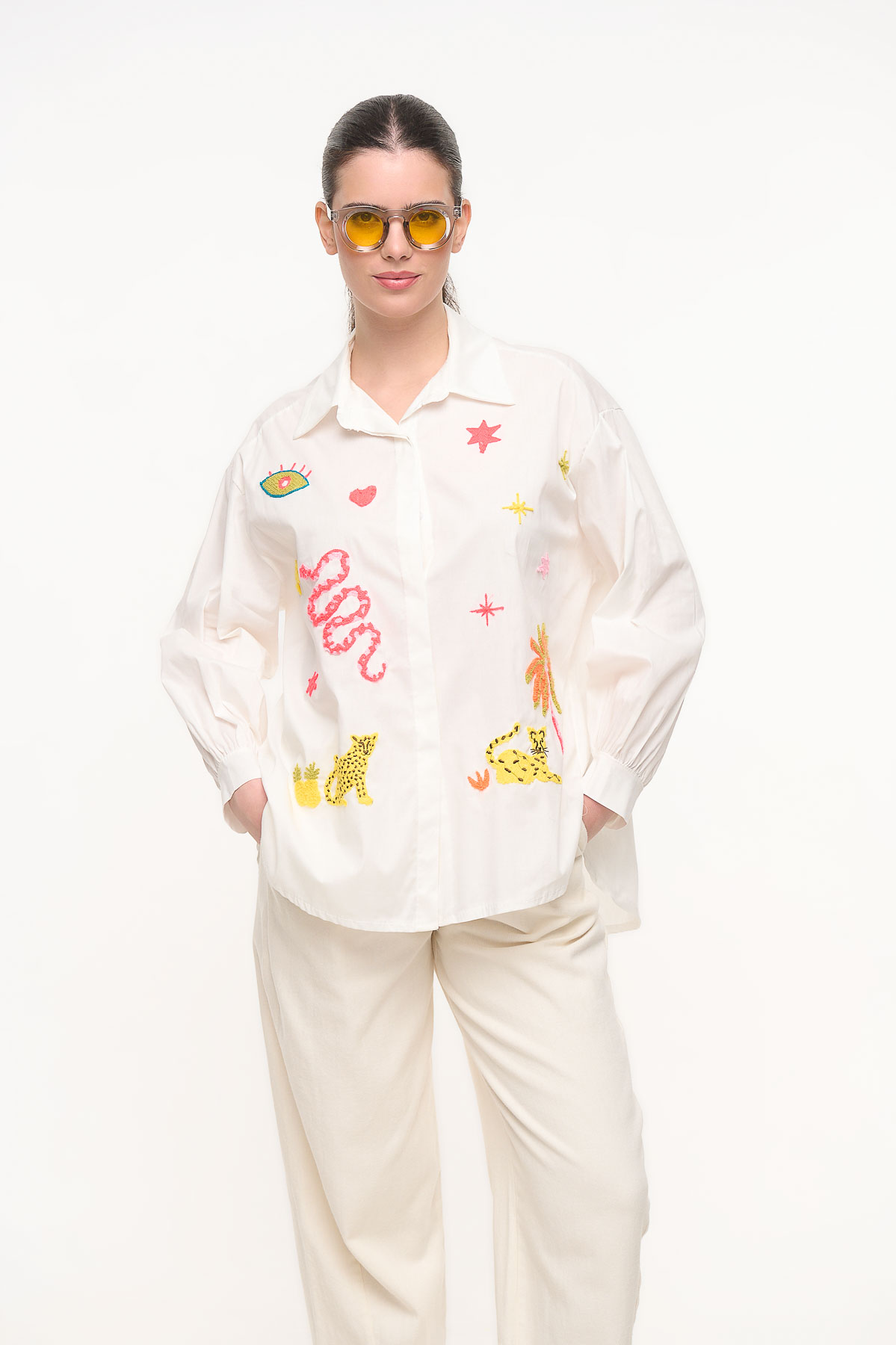 Εντυπωσιακό βαμβακερό πουκάμισο με ιδιαίτερα fluo κεντήματα που δίνουν μια playful και μοντέρνα διάθεση στο look. Τα τρισδιάστατα κεντήματα με φωτεινές fluo κλωστές δημιουργούν μοναδικά μοτίβα που ξεχωρίζουν και χαρίζουν χαρακτήρα στο ρούχο.