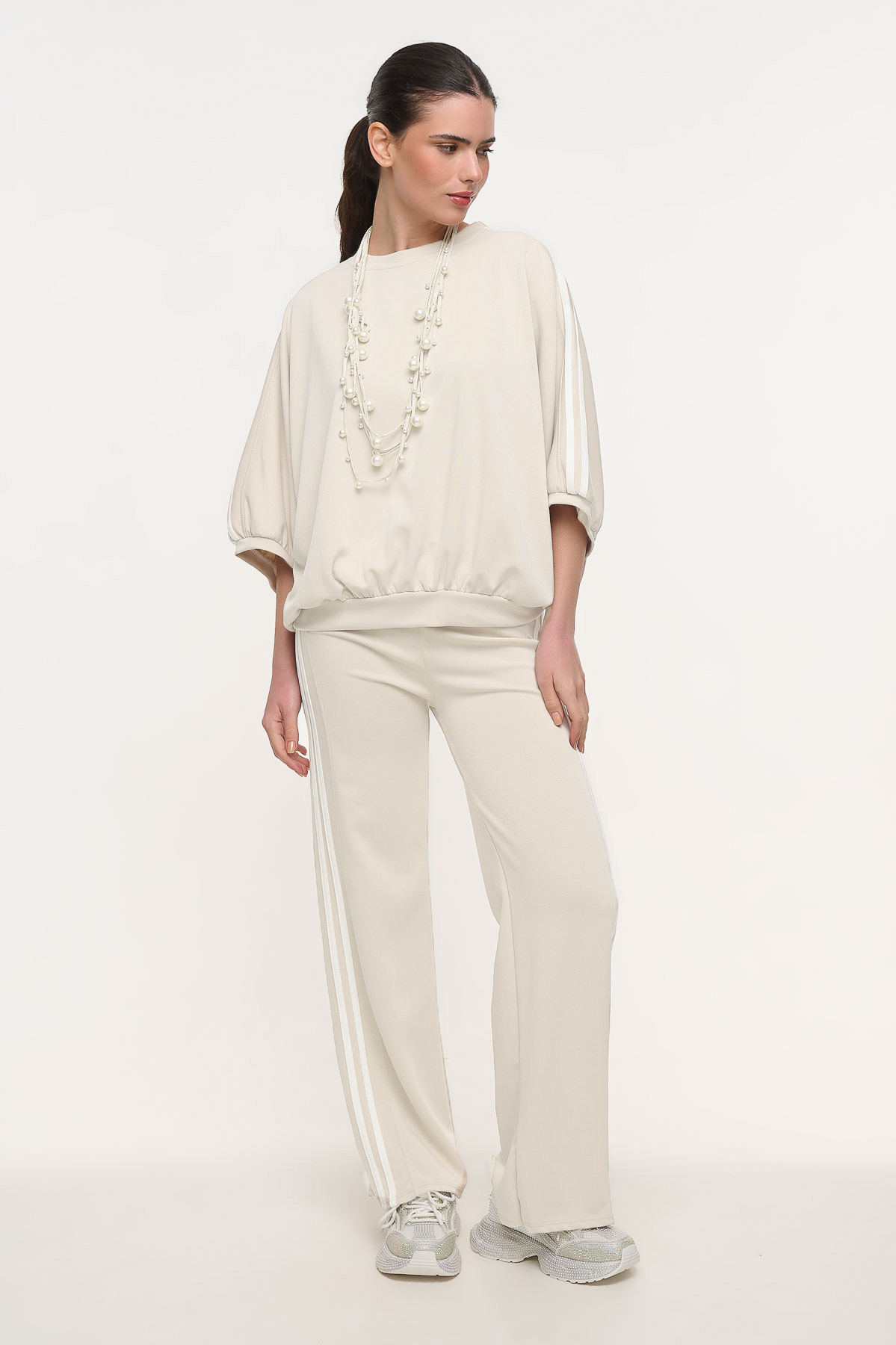Άνετο και σύγχρονο σετ φόρμας που αποτελείται από μπλούζα και παντελόνι, ιδανικό για καθημερινά looks με sporty αλλά και κομψή αισθητική. Η μπλούζα έχει oversized γραμμή με μανίκι νυχτερίδα και φάσα στο τελείωμα, προσφέροντας χαλαρή εφαρμογή και ιδιαίτερο στυλ. Το παντελόνι διαθέτει λάστιχο στη μέση με ρυθμιζόμενα κορδόνια για άνετη εφαρμογή, ενώ οι πλαϊνές ρίγες δίνουν μοντέρνο χαρακτήρα στο σύνολο.