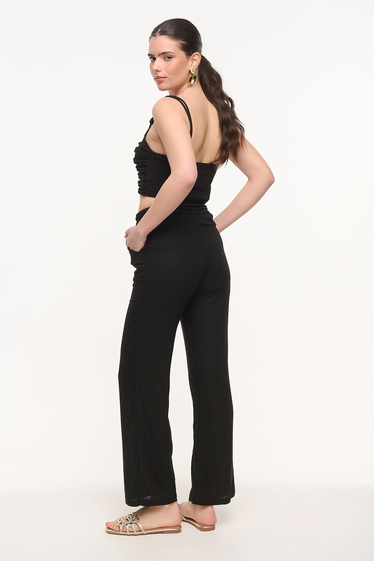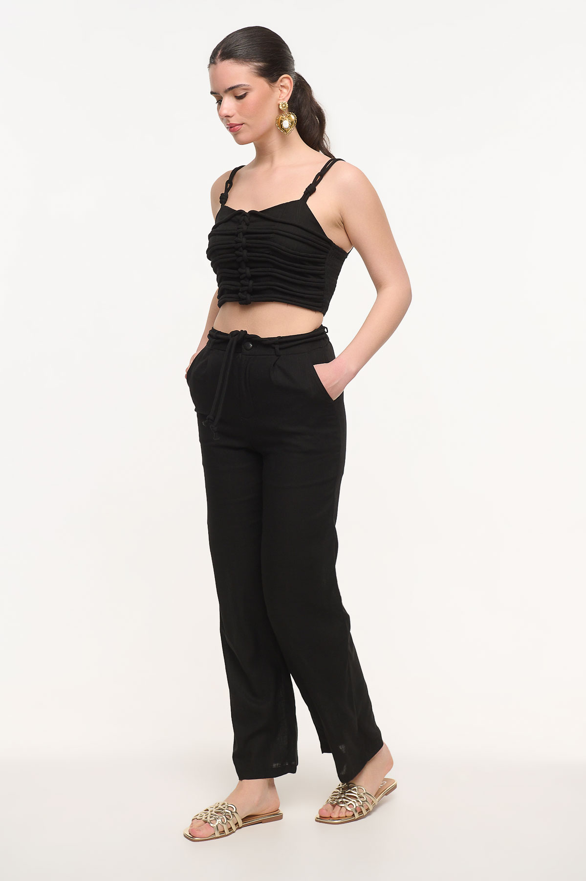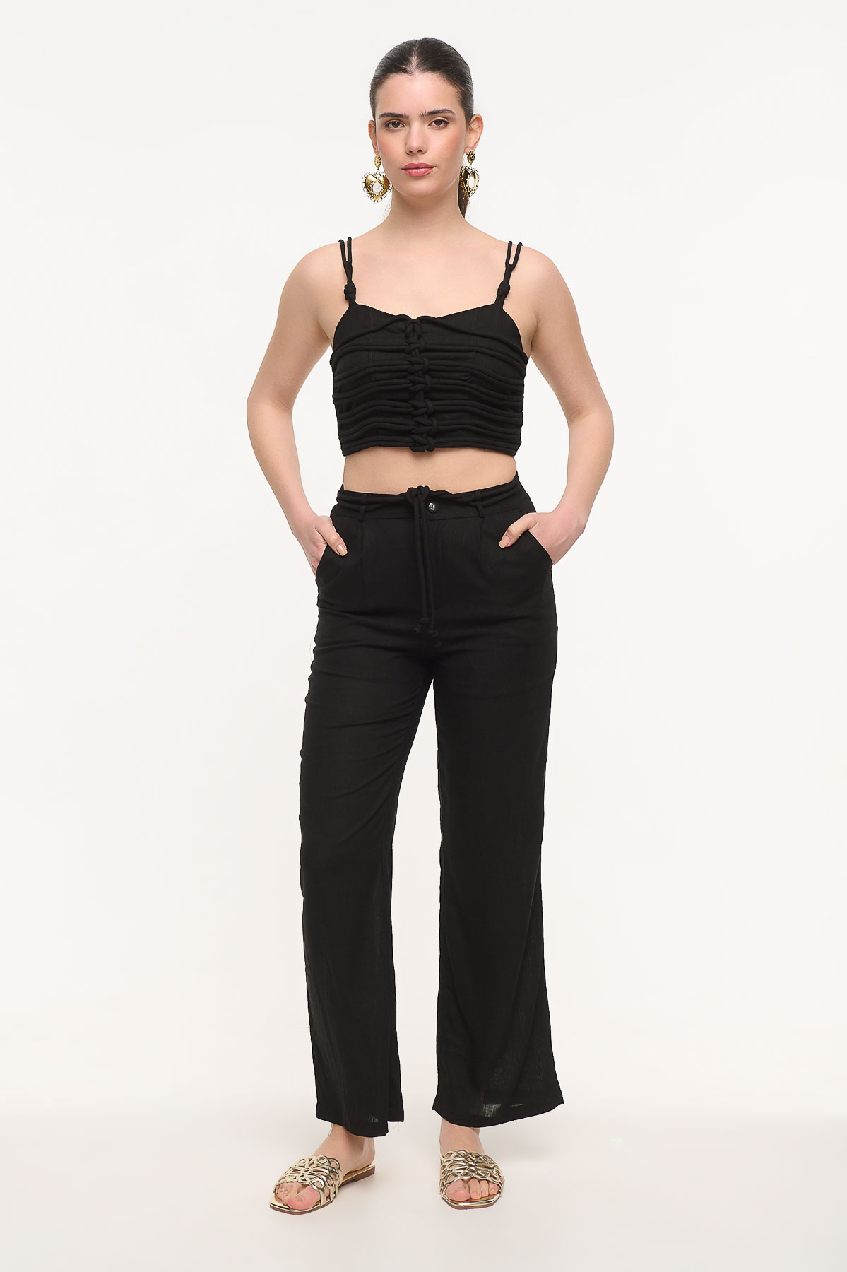 Minimal και κομψό λινό σετ που συνδυάζει άνεση και μοντέρνο στυλ, ιδανικό για καλοκαιρινές εμφανίσεις από το πρωί μέχρι το βράδυ. Το crop top διαθέτει τιράντες με κορδόνια και ελαστική σφηκοφωλιά στην πλάτη, προσφέροντας σταθερή αλλά και άνετη εφαρμογή στο σώμα.