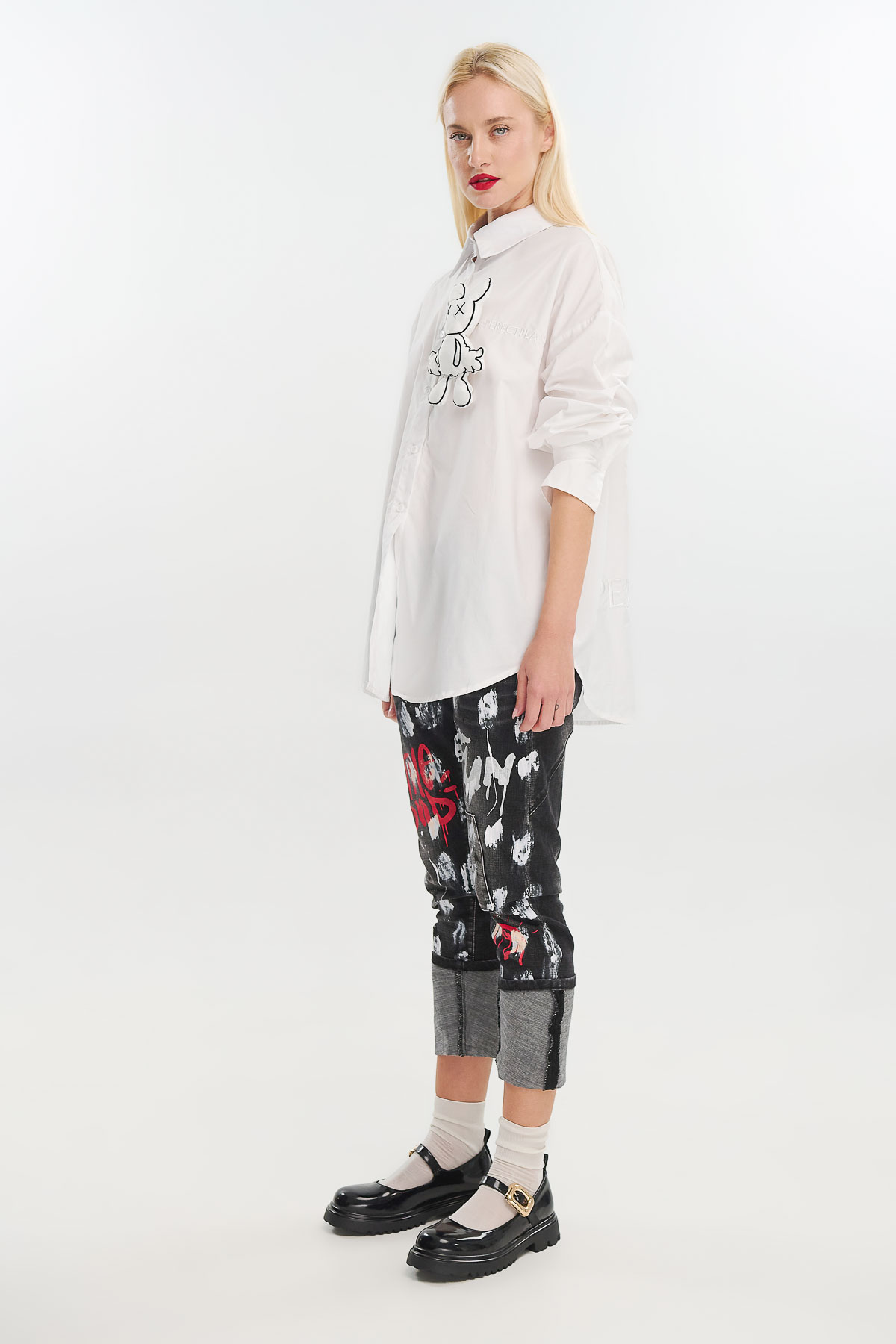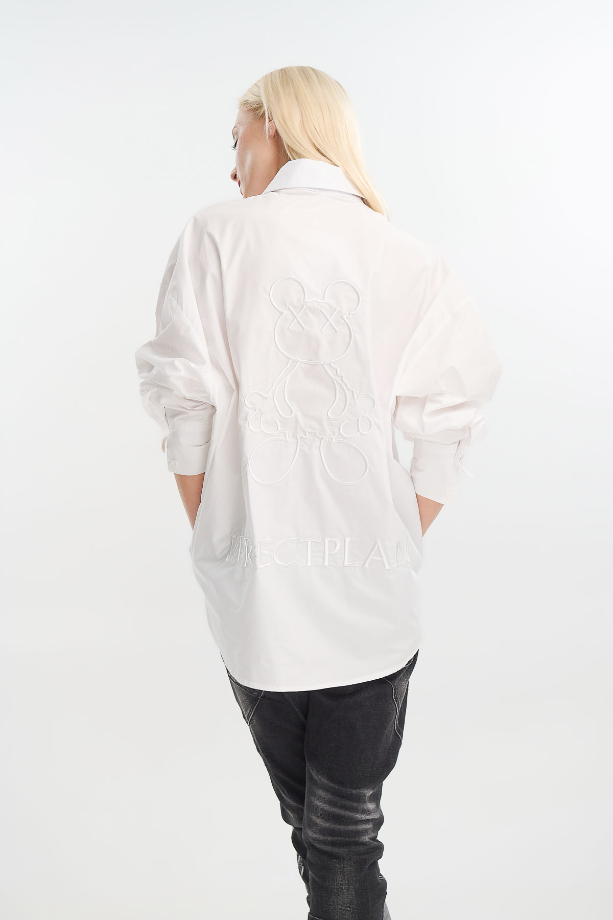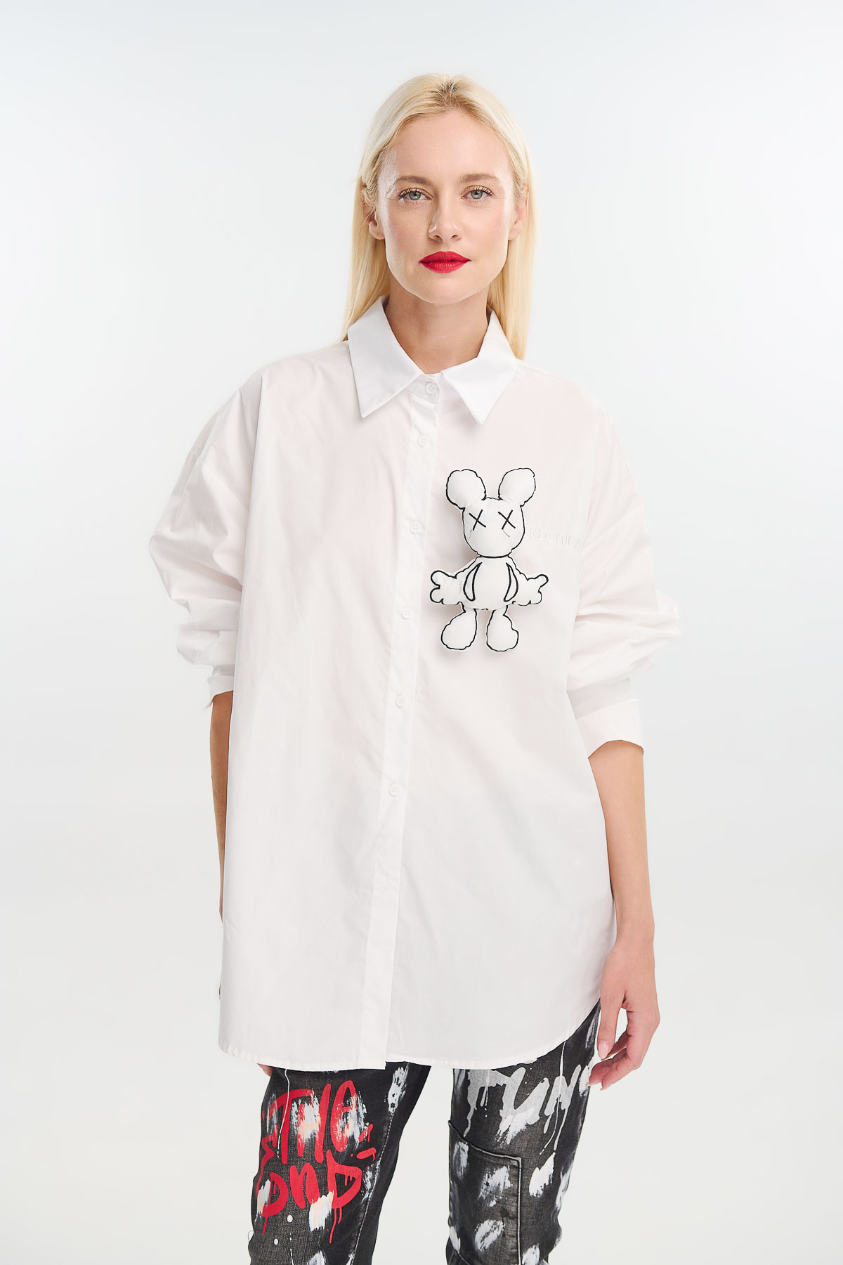 Μακρύ πουκάμισο από 100% βαμβάκι με εντυπωσιακή 3D καρφίτσα bunny στο μπροστινό μέρος. Το παιχνιδιάρικο μοτίβο συνδυάζεται με τον καθαρό, minimal σχεδιασμό του πουκαμίσου, δημιουργώντας ένα αποτέλεσμα που ισορροπεί ανάμεσα στο casual και το artistic.
