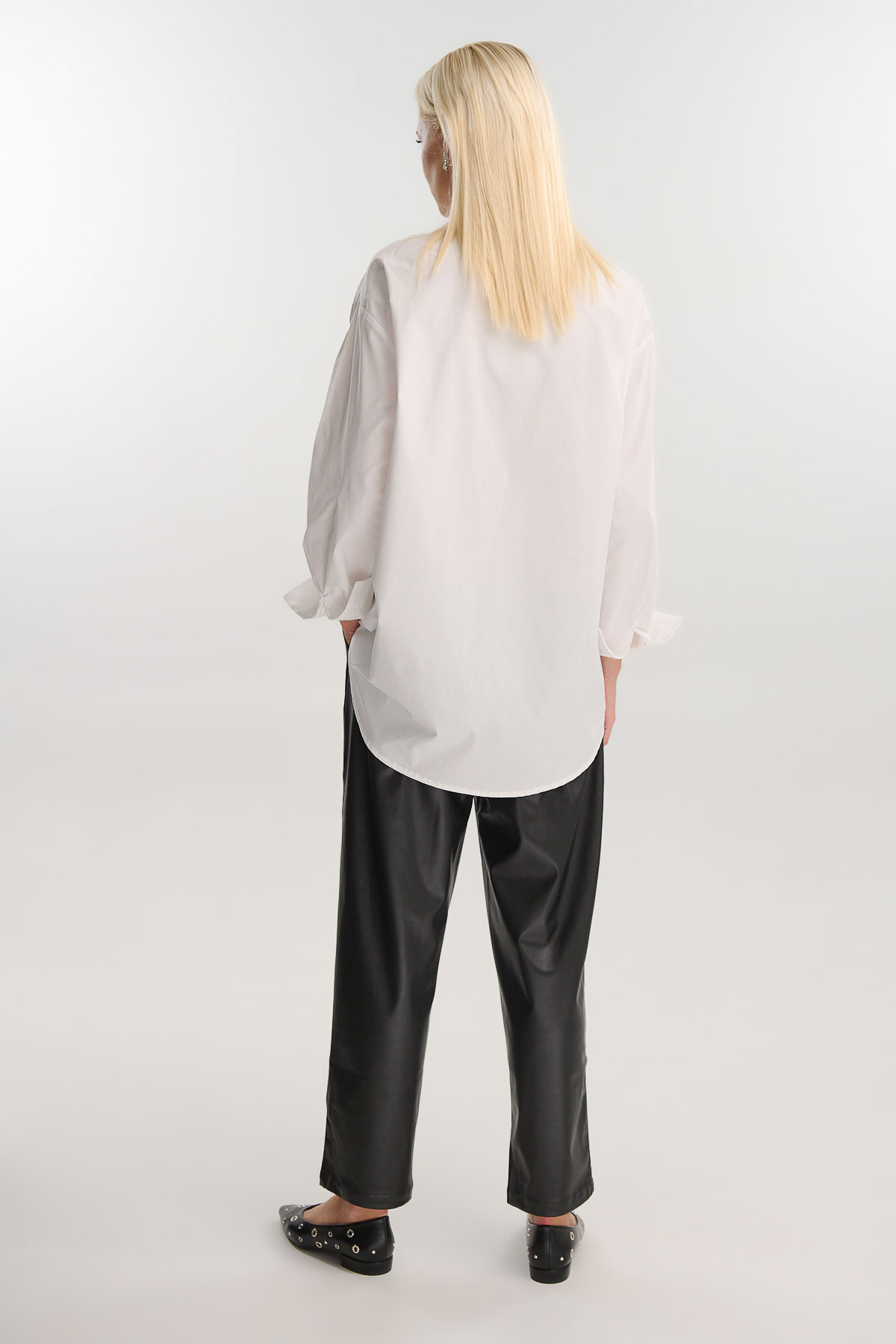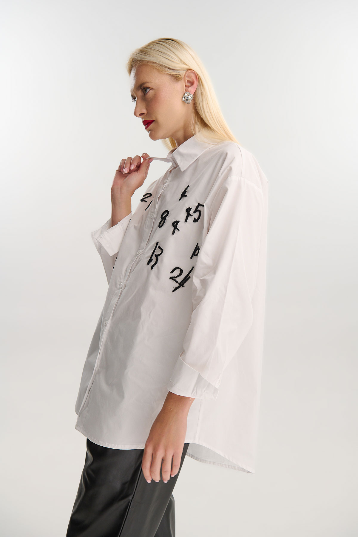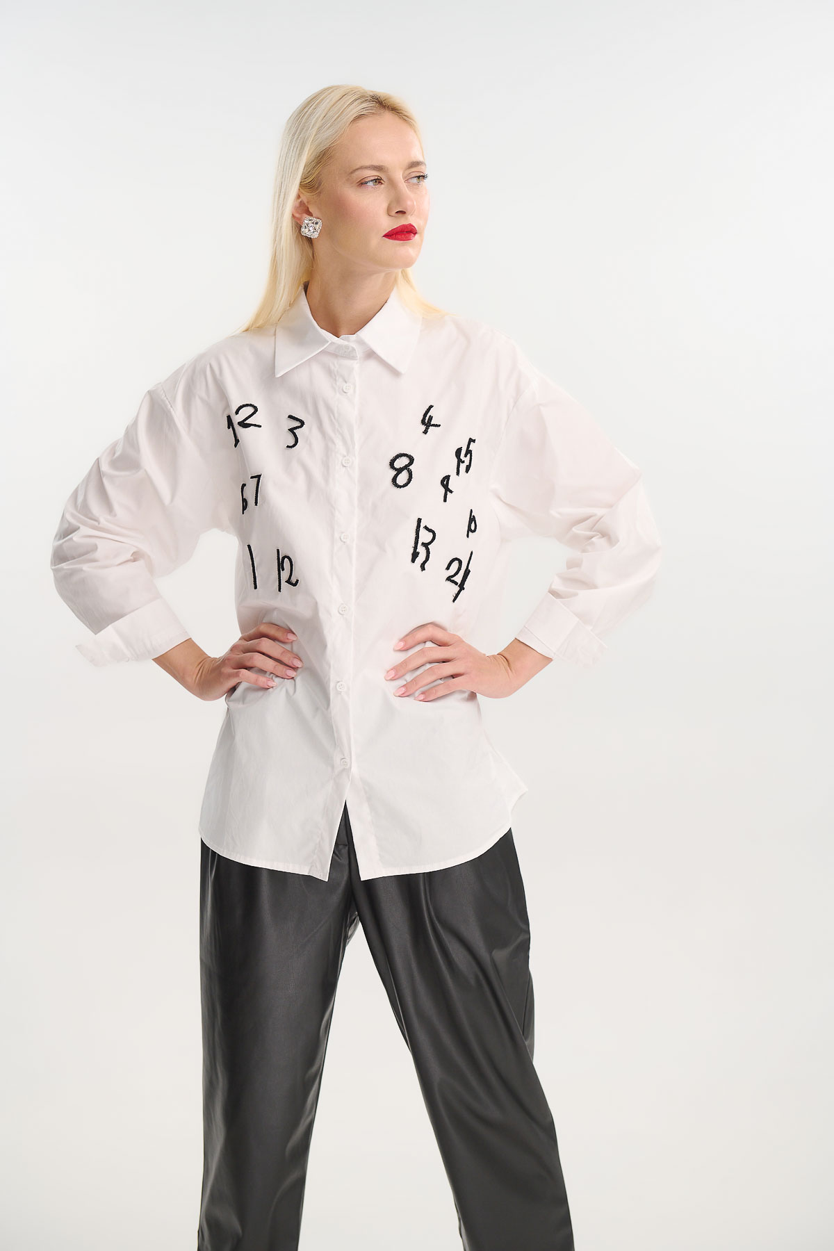 Λευκό πουκάμισο από μαλακό βαμβάκι με πρωτότυπα 3D κεντήματα αριθμών στο μπροστινό μέρος. Ο σχεδιασμός του συνδυάζει μίνιμαλ αισθητική με παιχνιδιάρικη διάθεση, προσδίδοντας στο σύνολο μια καλλιτεχνική πινελιά.