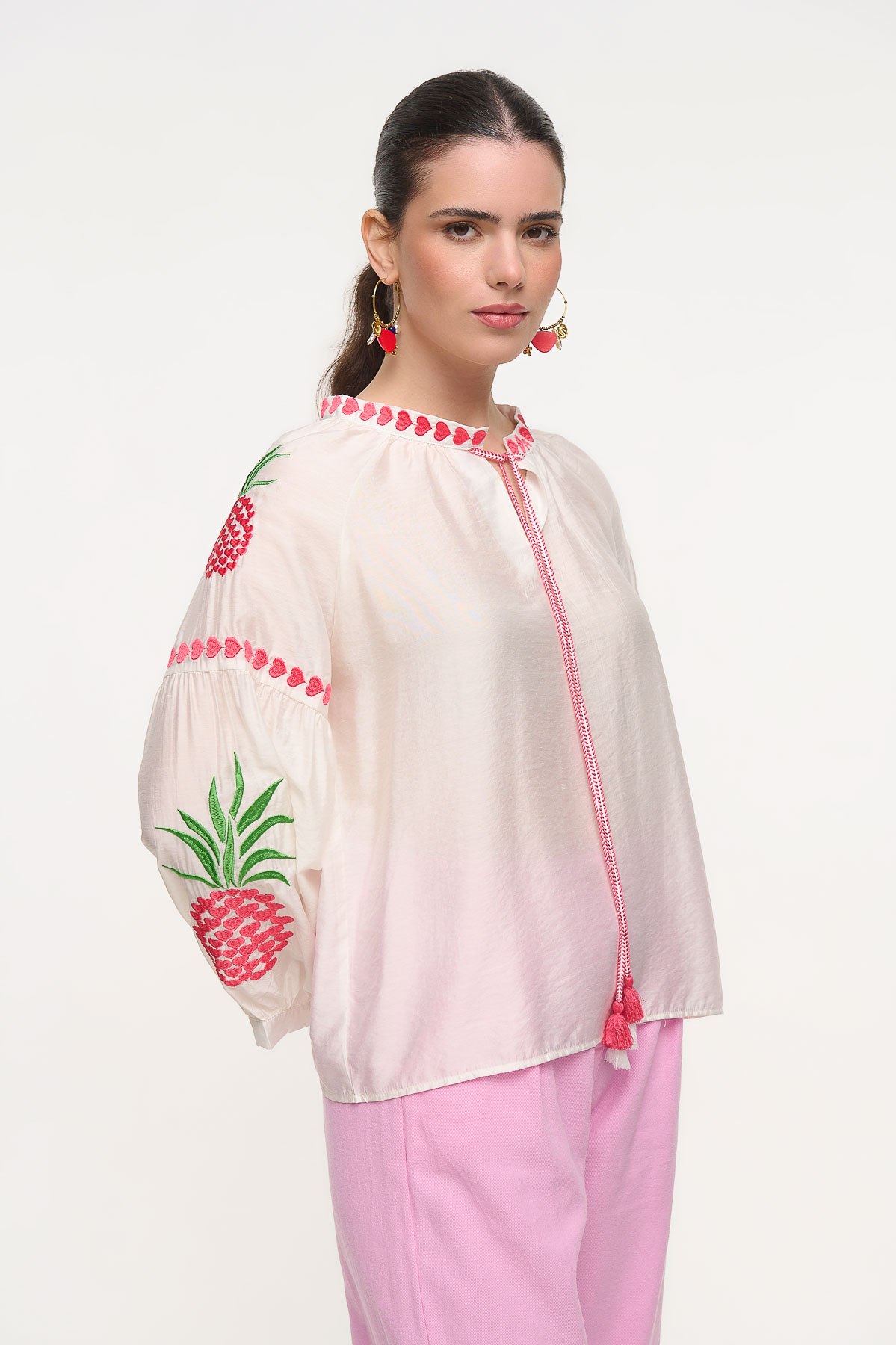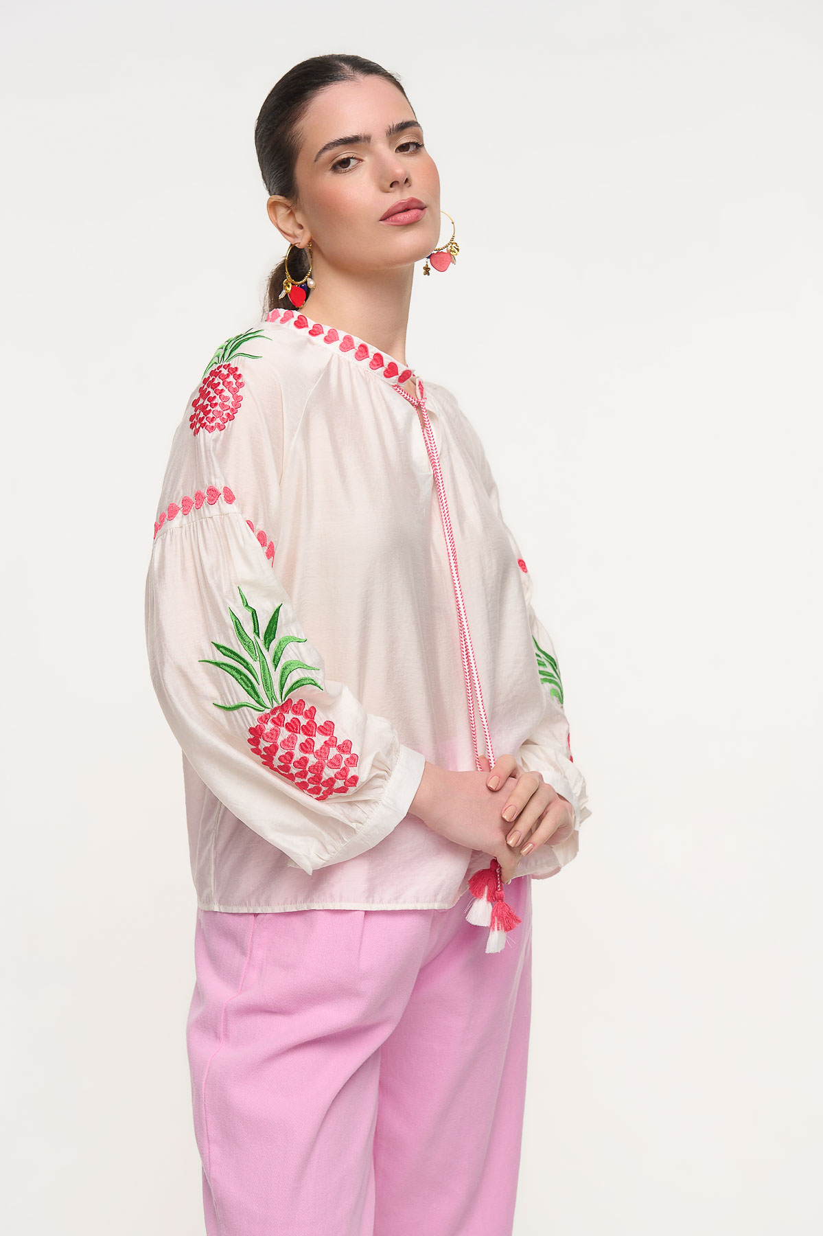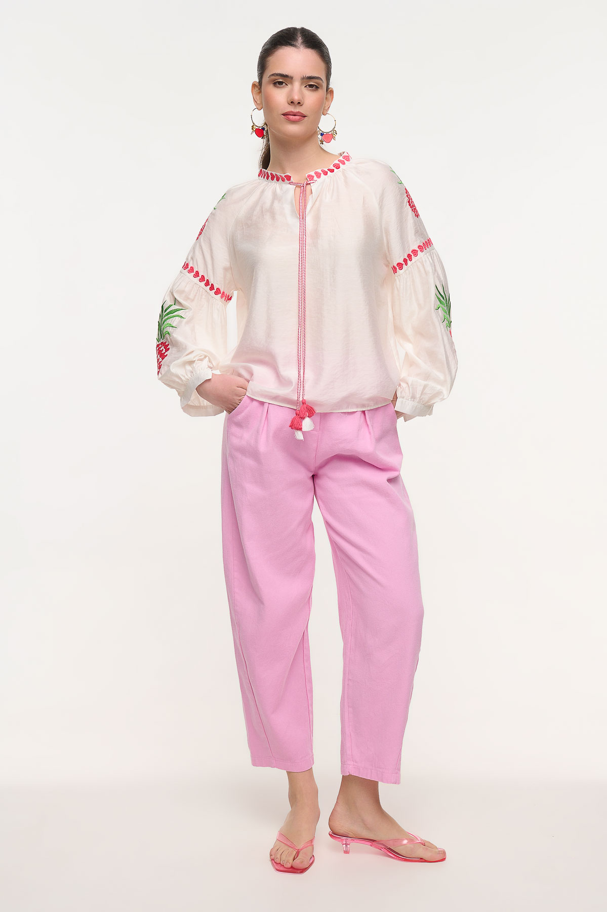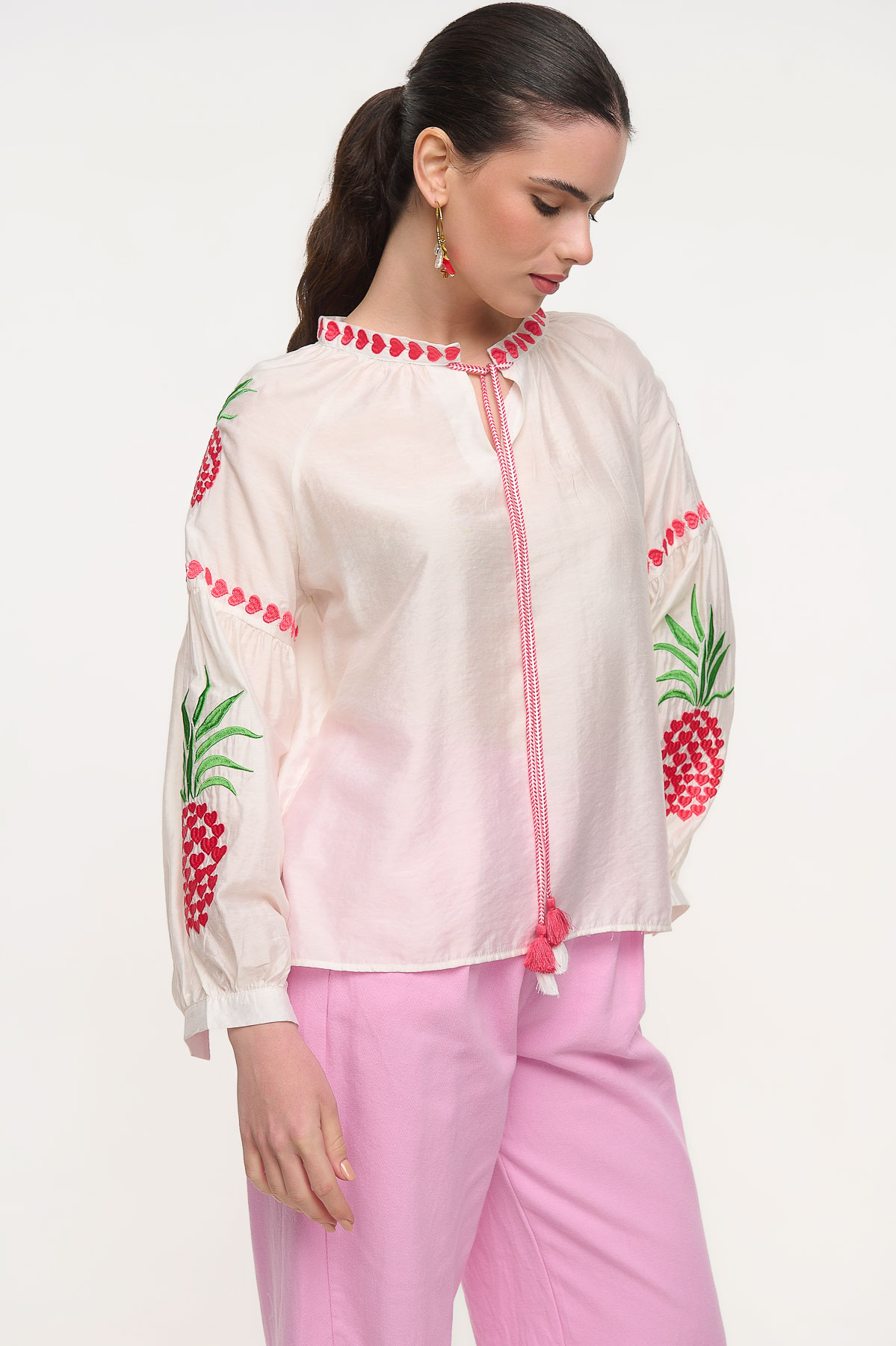 Αέρινο πουκάμισο με ιδιαίτερο κέντημα και εντυπωσιακές fluo λεπτομέρειες που χαρίζουν μια φρέσκια και παιχνιδιάρικη αισθητική. Ξεχωρίζει για τα διακοσμητικά κεντήματα στα μανίκια με μοτίβο ανανά και τις έντονες ροζ ραφές στον λαιμό και στο δέσιμο μπροστά, που δημιουργούν ένα μοναδικό boho αποτέλεσμα. Η άνετη γραμμή και το ελαφρύ ύφασμα το καθιστούν ιδανικό για καθημερινά καλοκαιρινά looks. • Καλύπτει περίμετρο στήθους έως 110 cm