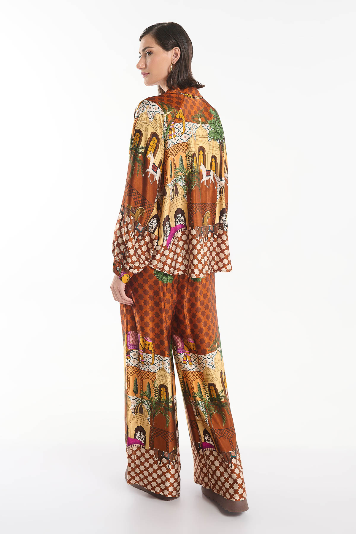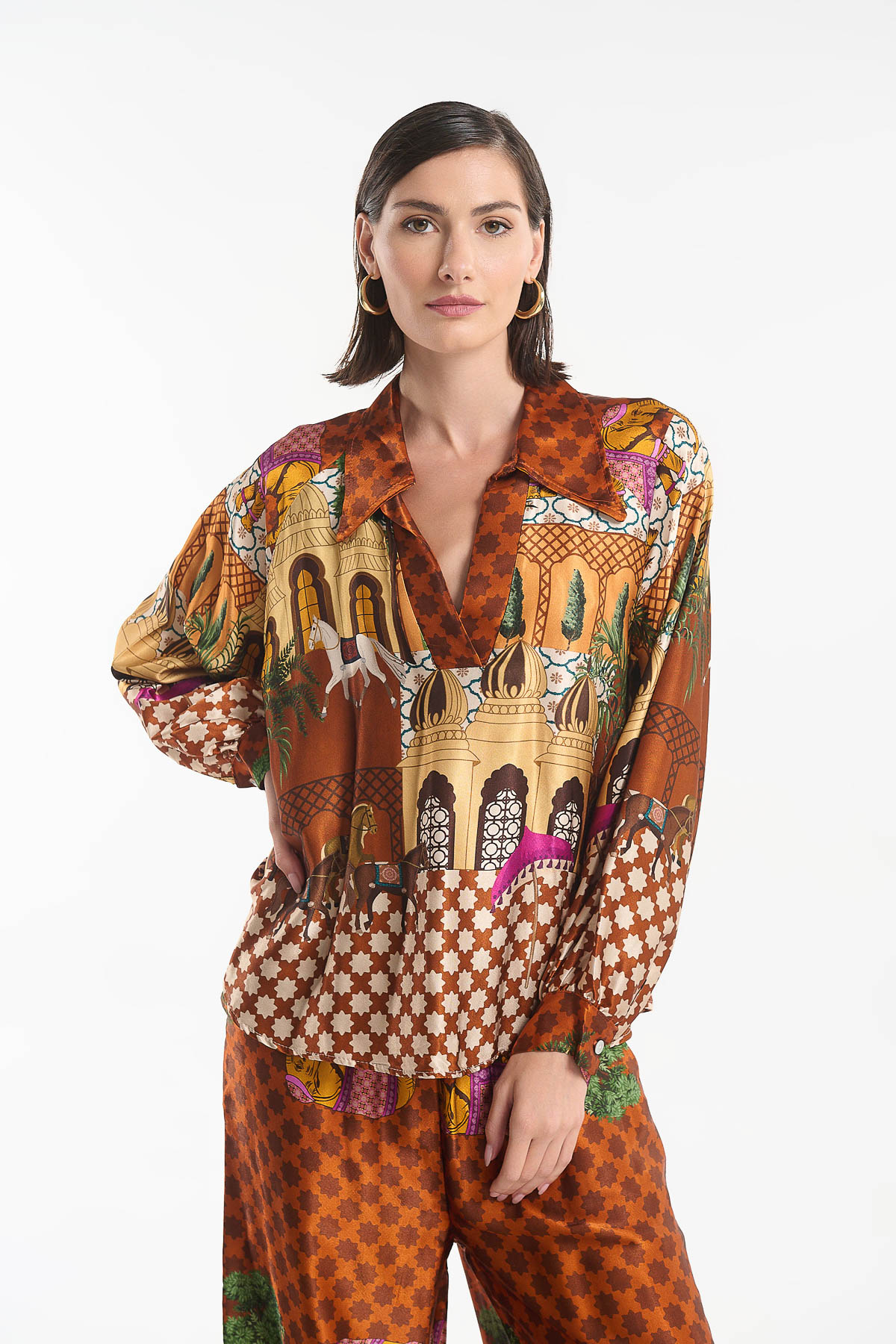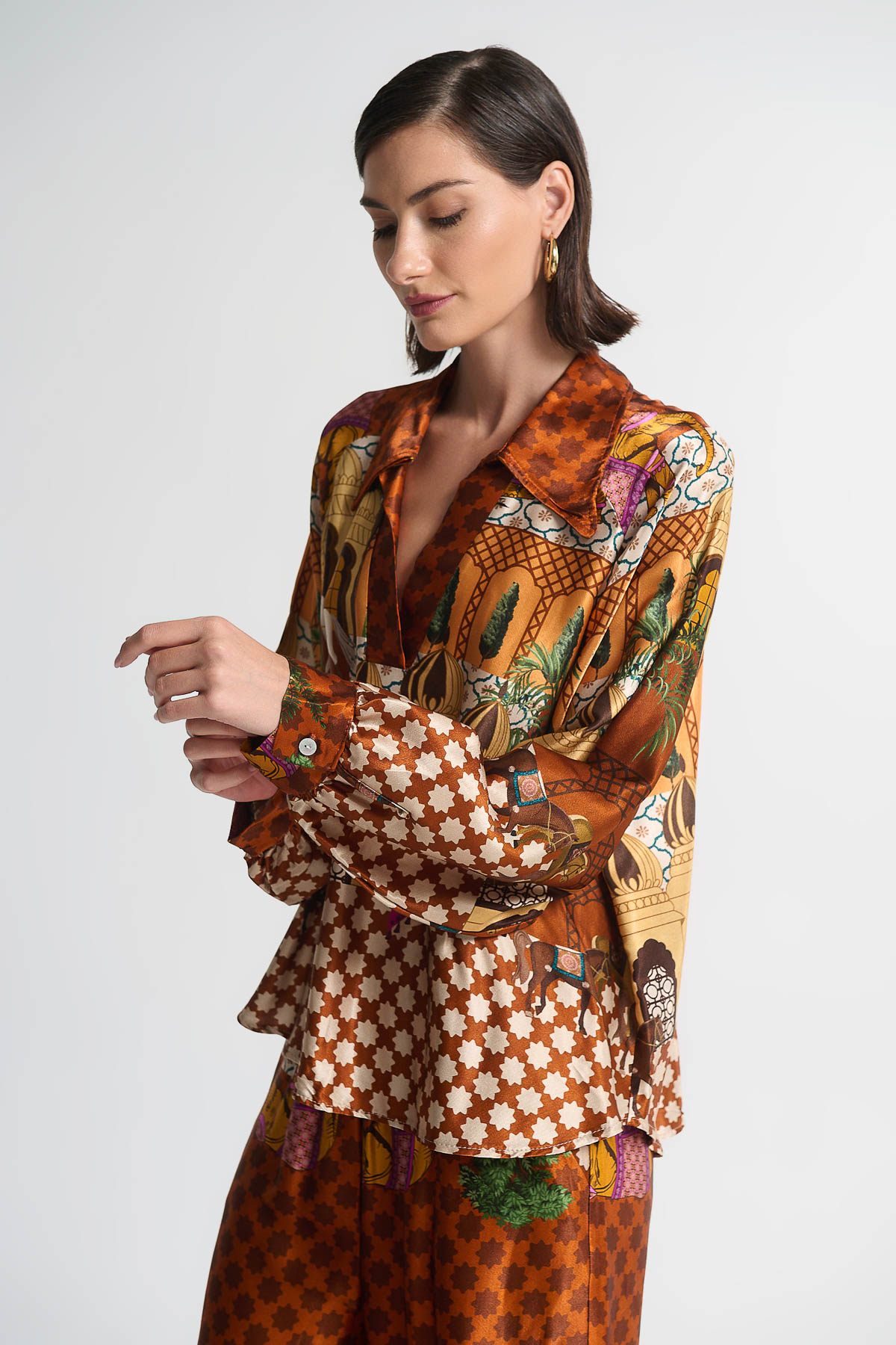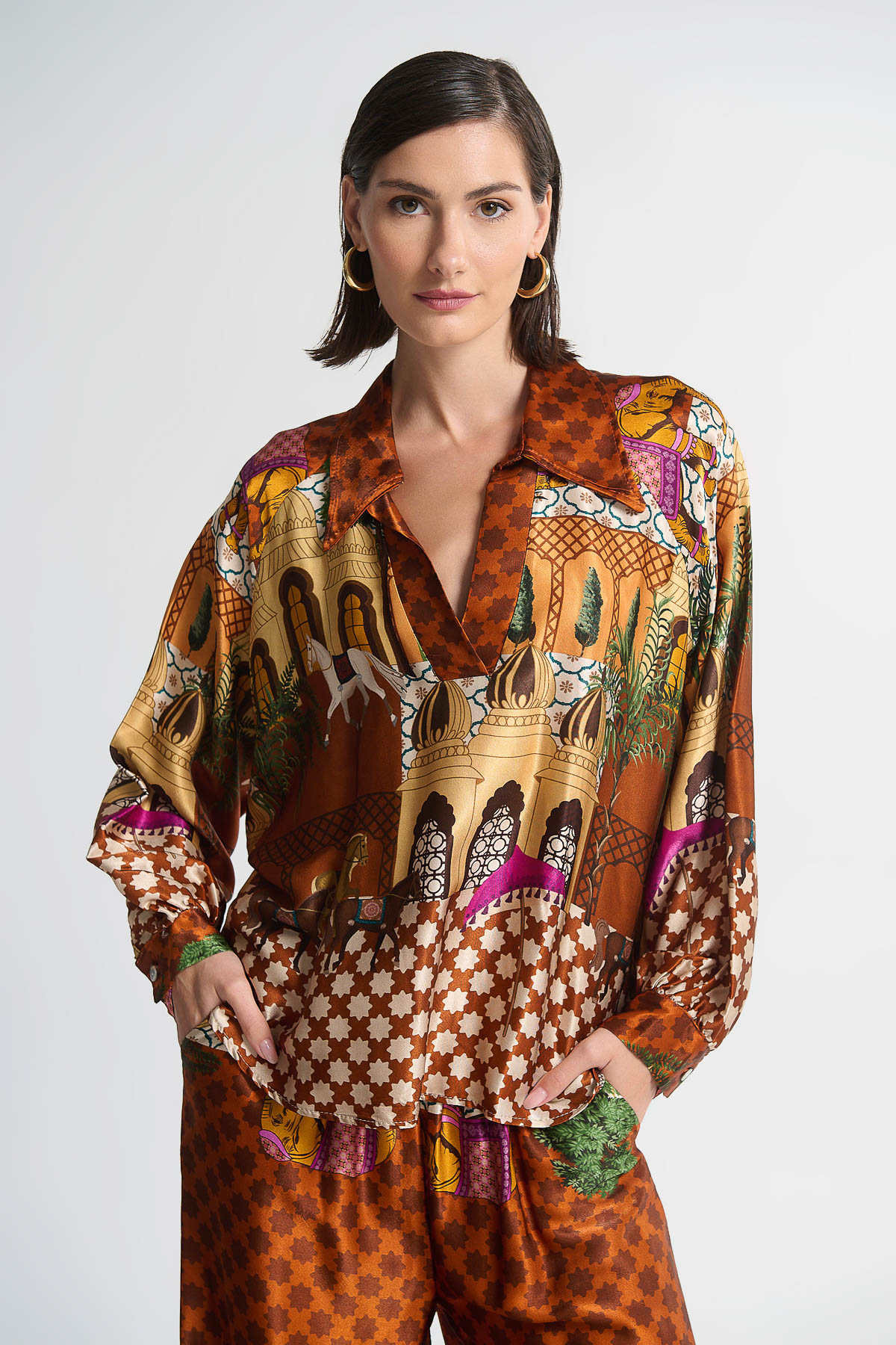 Αναδείξτε το στυλ σας με το Shirt Silk Marroco, ένα κομμάτι που συνδυάζει την πολυτέλεια του μεταξιού με το εκλεπτυσμένο design. Το ιδιαίτερο print του, εμπνευσμένο από μαροκινά μοτίβα και έντονα χρώματα, προσφέρει έναν αέρα εξωτικής κομψότητας.
