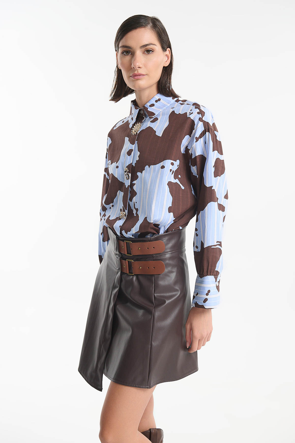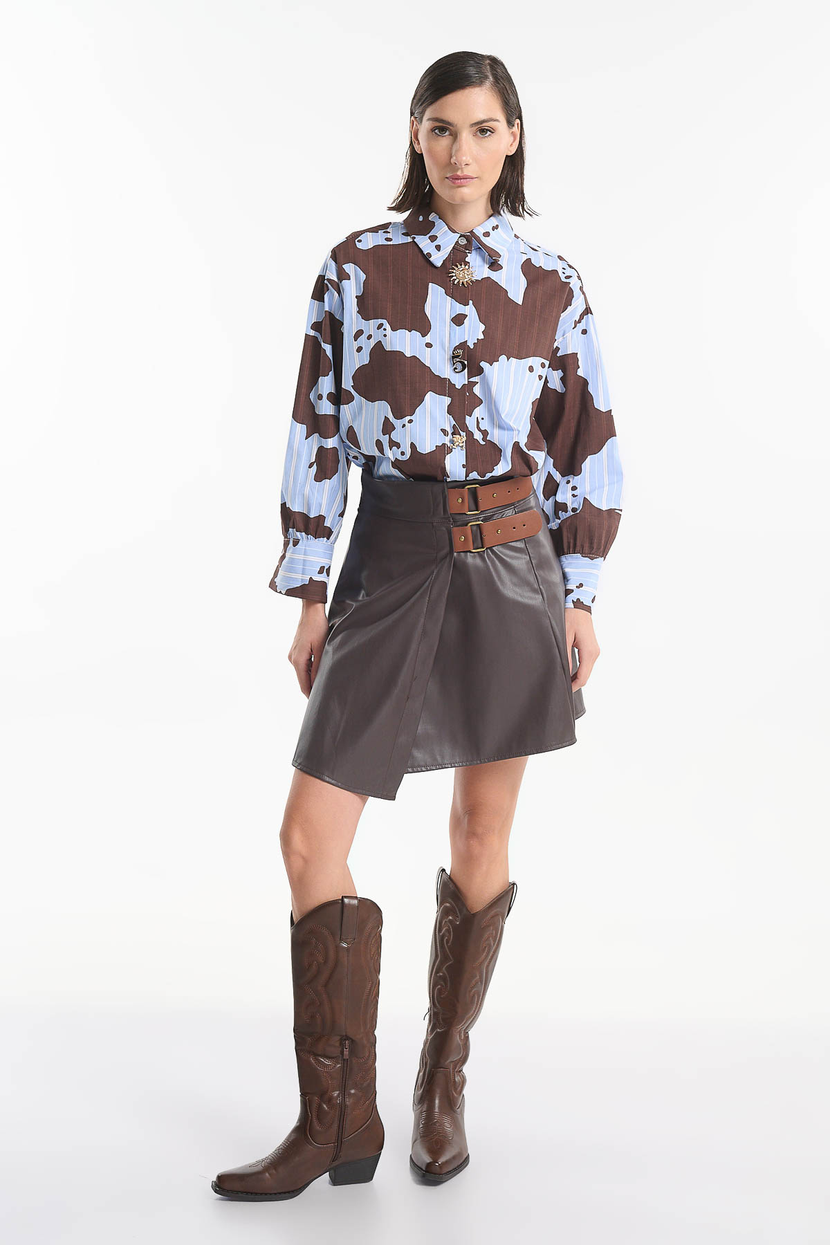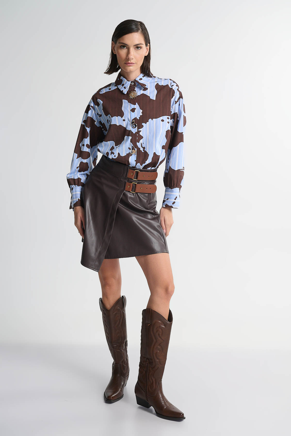Αναδείξτε το στυλ σας με αυτό το statement πουκάμισο, που συνδυάζει ρίγες και μοναδικό cow print μοτίβο. Διαθέτει κλασικό γιακά και εντυπωσιακά κουμπιά, ενώ η oversized γραμμή του προσφέρει άνεση και στυλ. Ιδανικό για τολμηρές εμφανίσεις που ξεχωρίζουν, ταιριάζει απόλυτα με δερμάτινες φούστες ή παντελόνια για ένα μοντέρνο western-chic look. Σύνθεση: 100% βαμβάκι . Μήκος : 76 cm μπροστά – 80 cm πίσω .