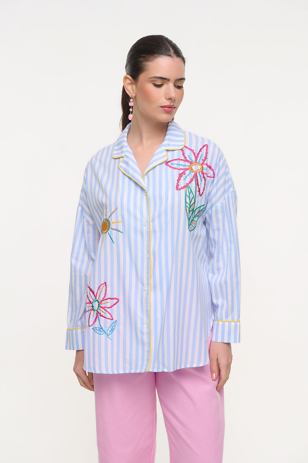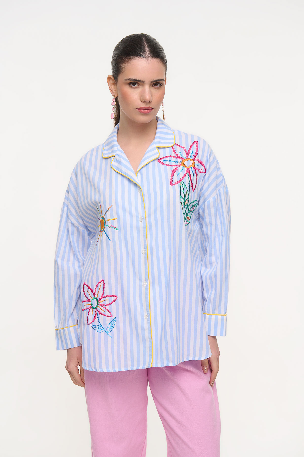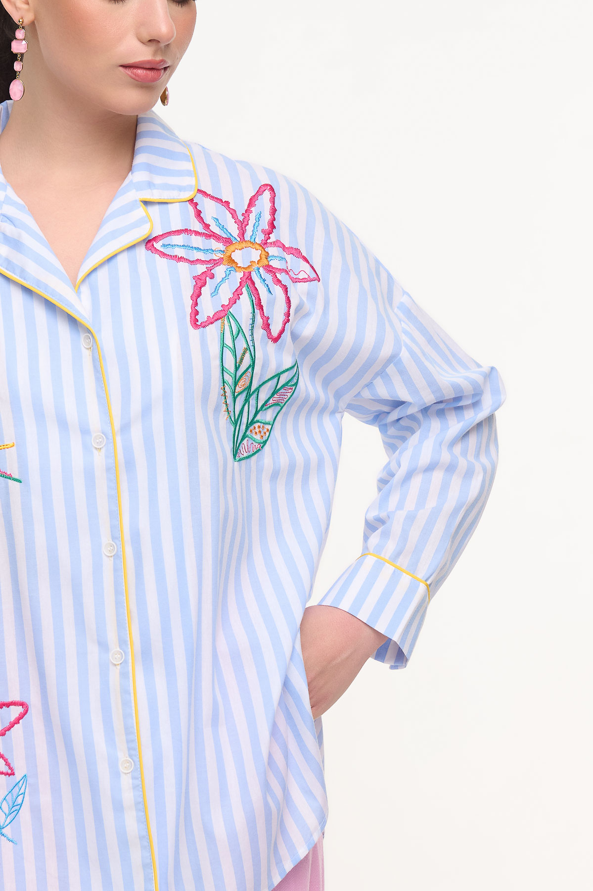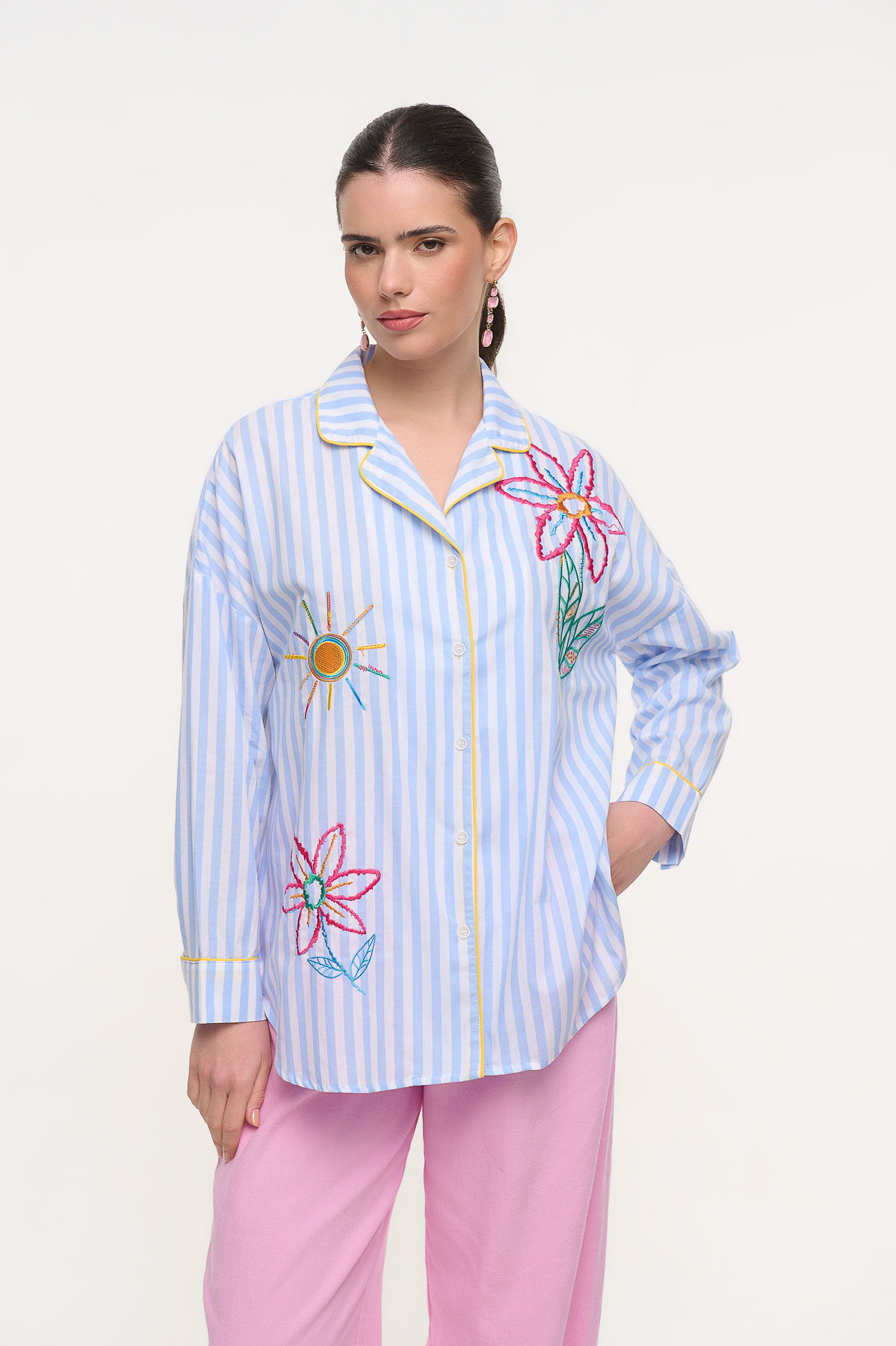 Ιδιαίτερο ριγέ πουκάμισο από 100% βαμβάκι με εντυπωσιακά πολύχρωμα κεντήματα που χαρίζουν έναν playful και καλλιτεχνικό χαρακτήρα. Τα κεντήματα με λουλούδια και ήλιο δημιουργούν μια φρέσκια, καλοκαιρινή αισθητική, ενώ οι λεπτομέρειες με κίτρινο ρέλι στο γιακά και στο κούμπωμα προσθέτουν μια κομψή αντίθεση. Η άνετη γραμμή του προσφέρει ευκολία στην κίνηση και το καθιστά ιδανικό για καθημερινά αλλά και πιο ιδιαίτερα looks.• Καλύπτει περίμετρο στήθους έως 128 cm