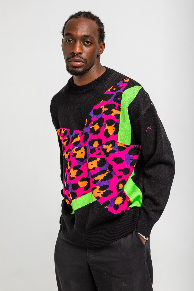 Πλεκτό oversize σε μαύρη βάση με εντυπωσιακό σχέδιο αστέρι σε έντονες neon αποχρώσεις — φούξια, πορτοκαλί, πράσινο και μωβ.