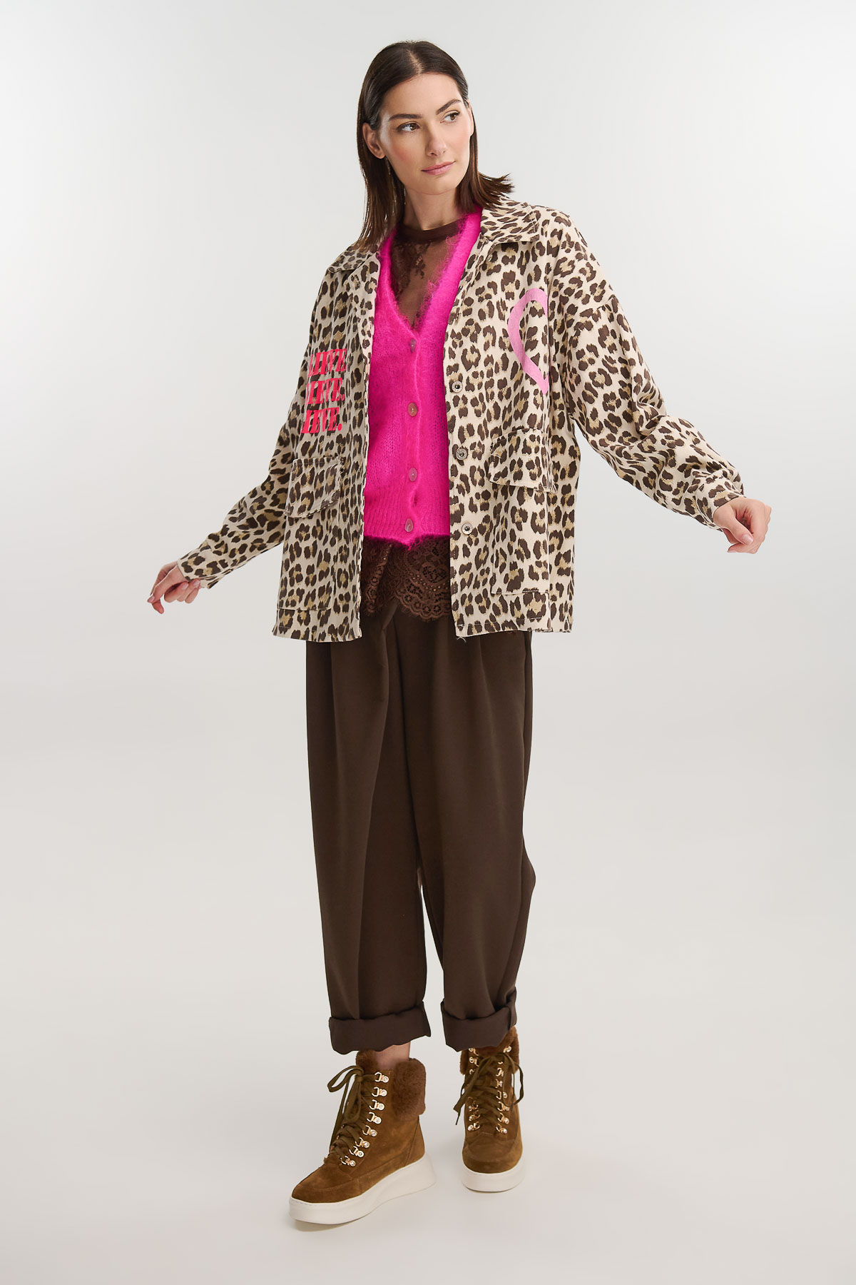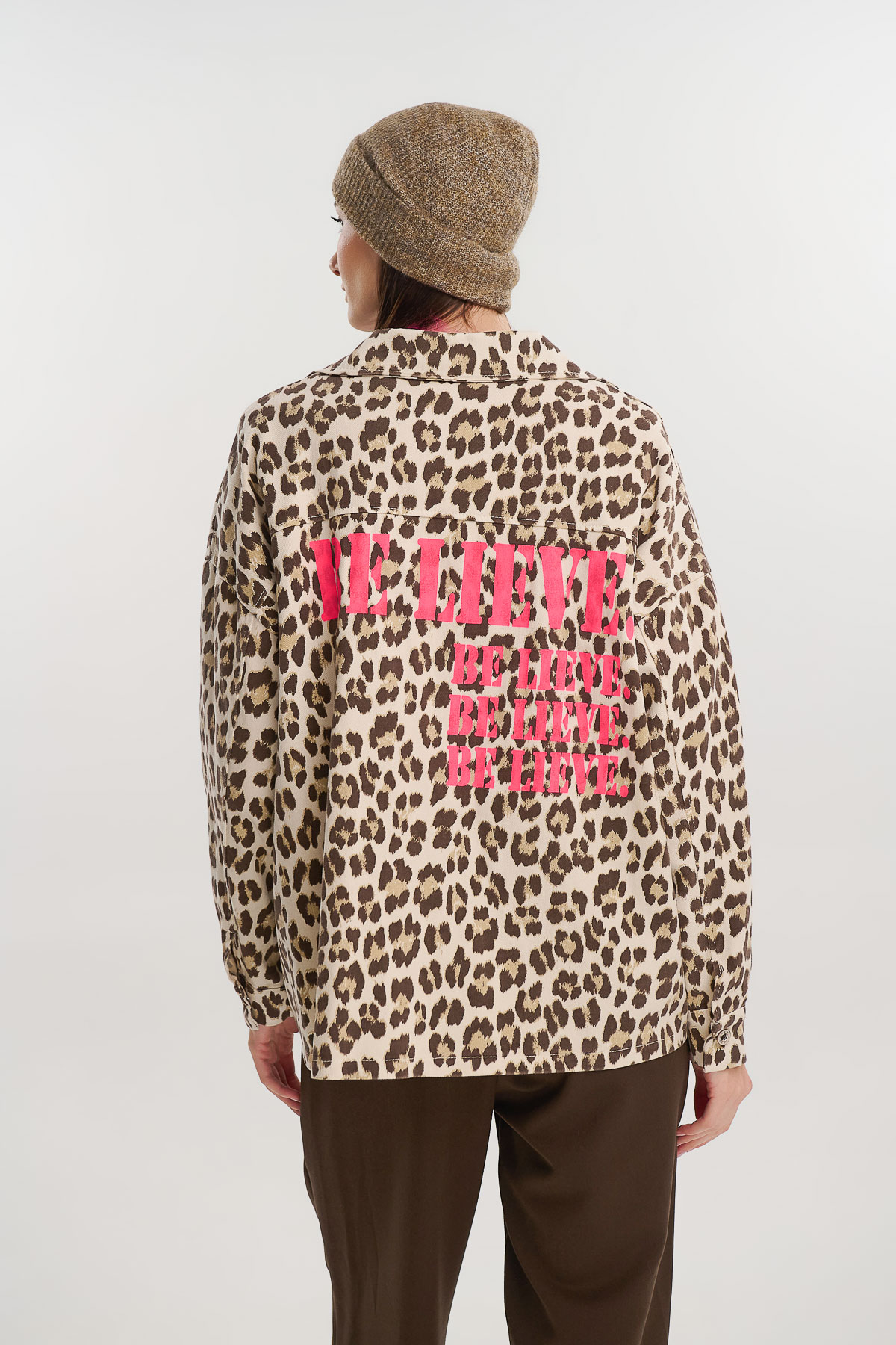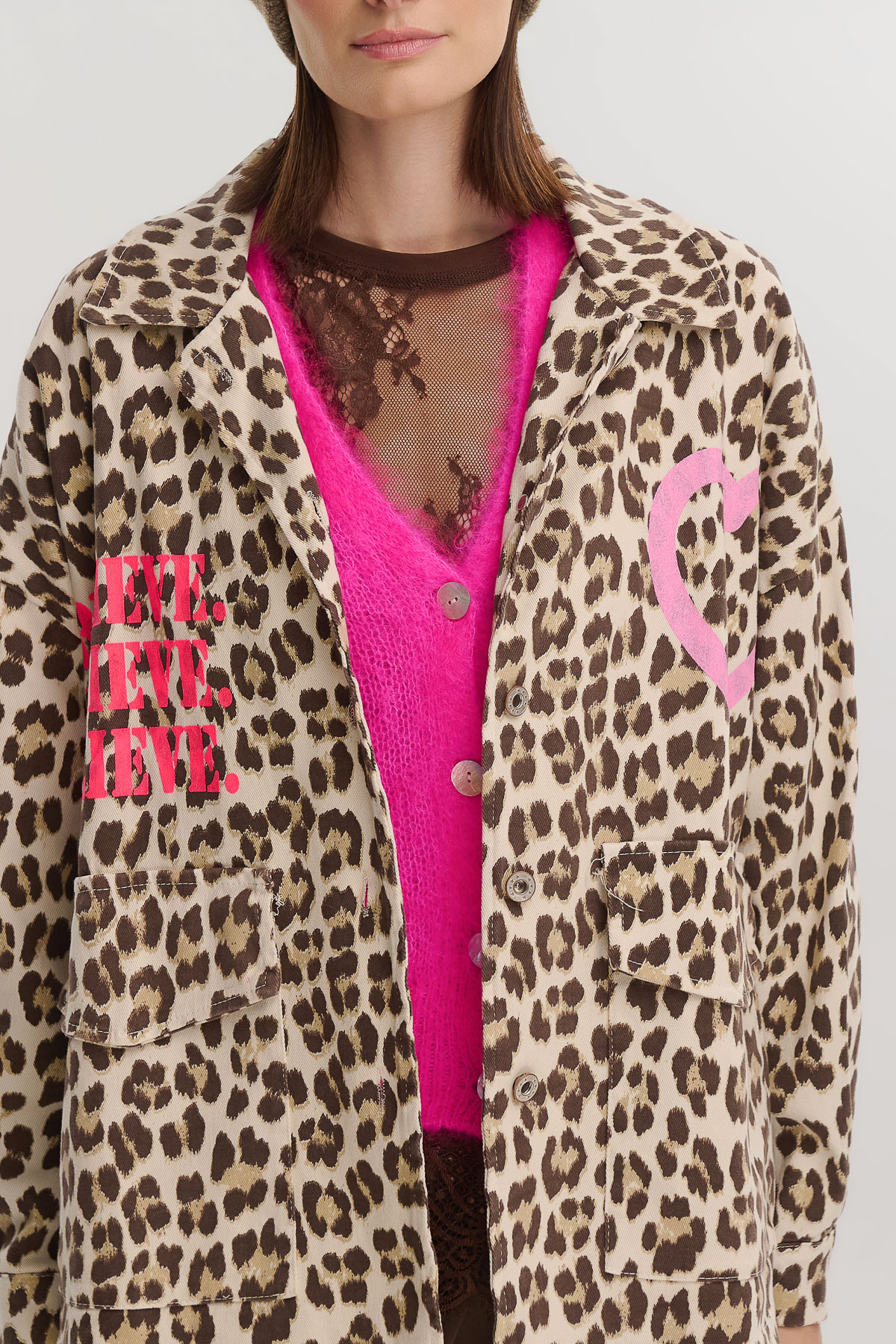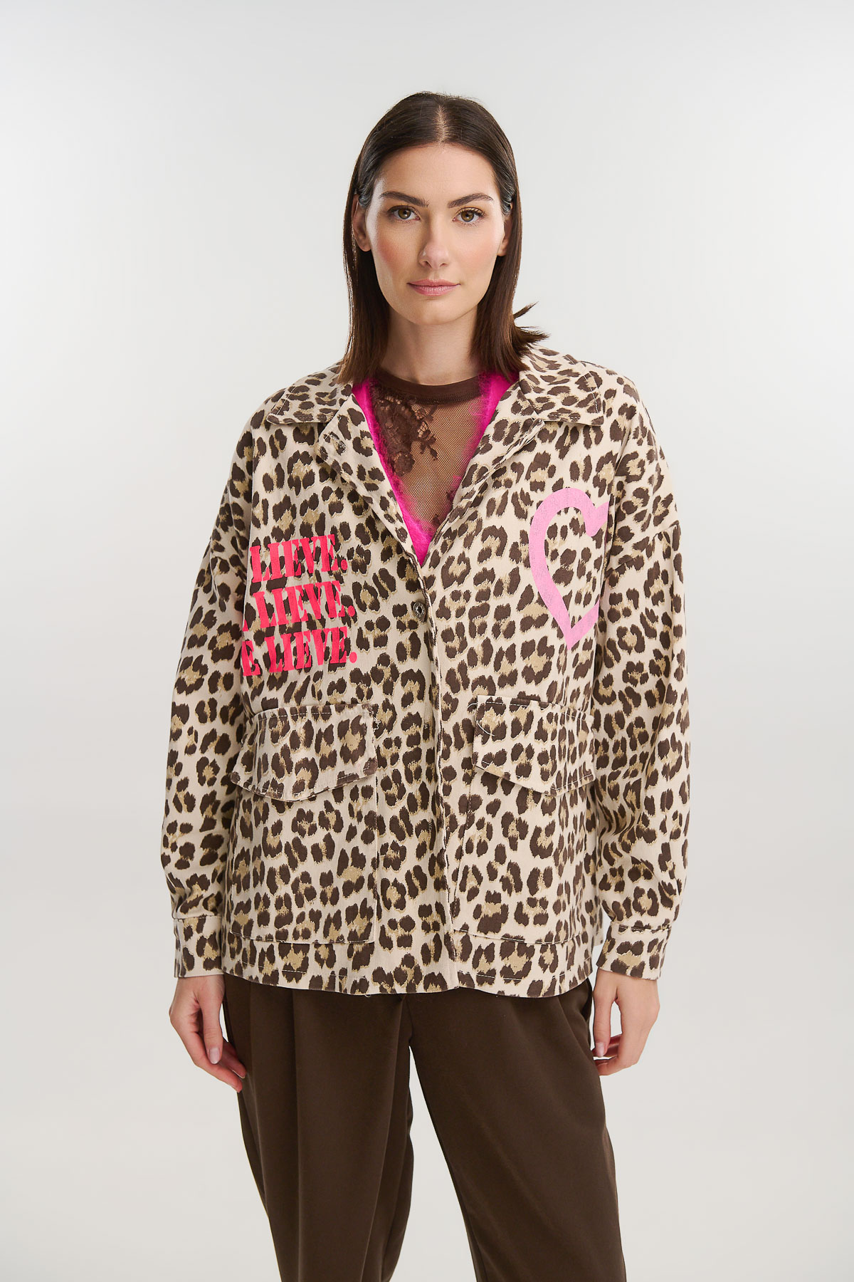 Jacket με leopard μοτίβο και έντονα φούξια prints “Believe”, που χαρίζει δυναμισμό και αισιοδοξία σε κάθε εμφάνιση. Το σχέδιο διαθέτει φαρδιά γραμμή, μπροστινές τσέπες με καπάκι και κλείσιμο με κουμπιά, για ένα stylish αλλά άνετο αποτέλεσμα.