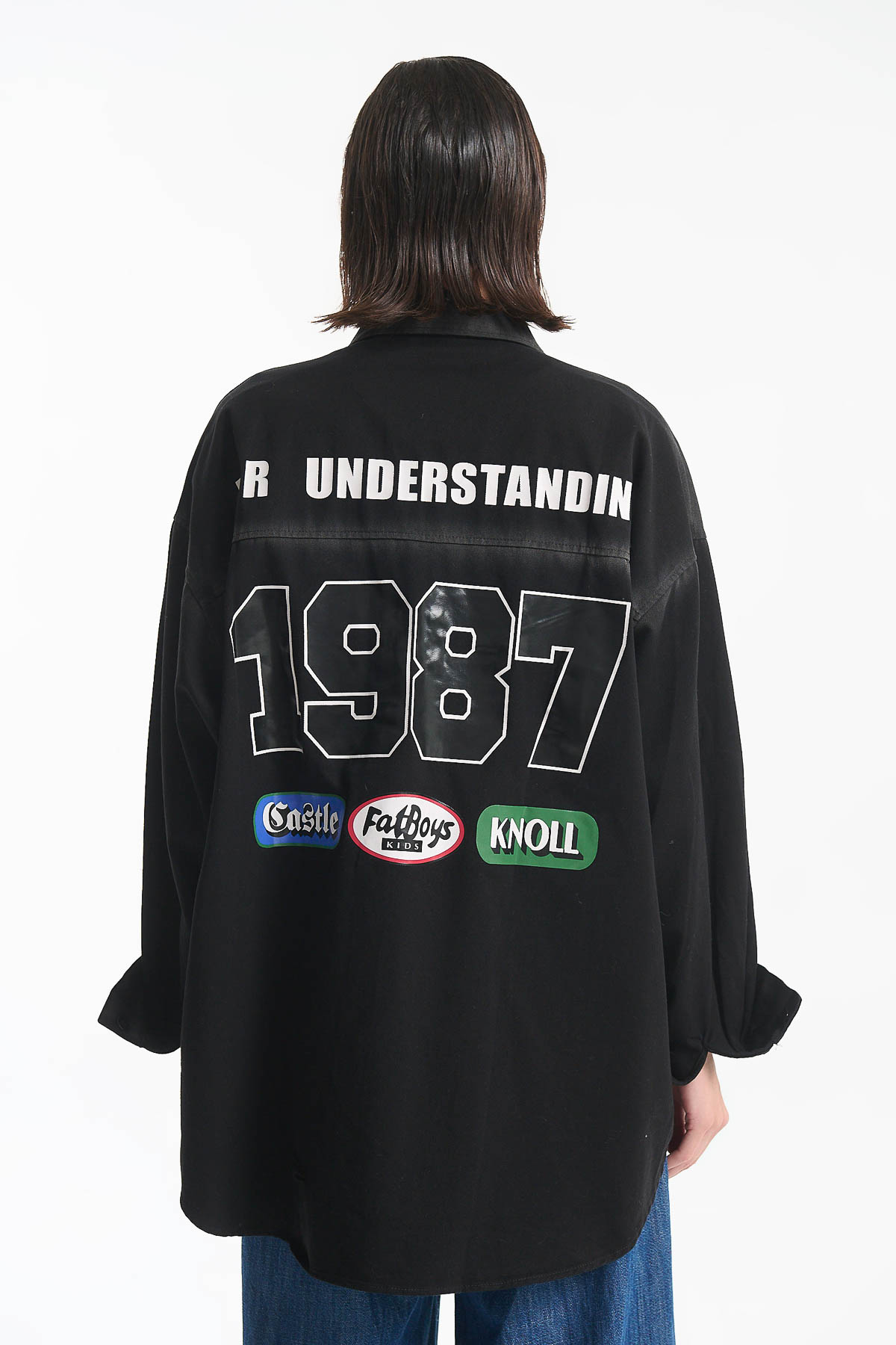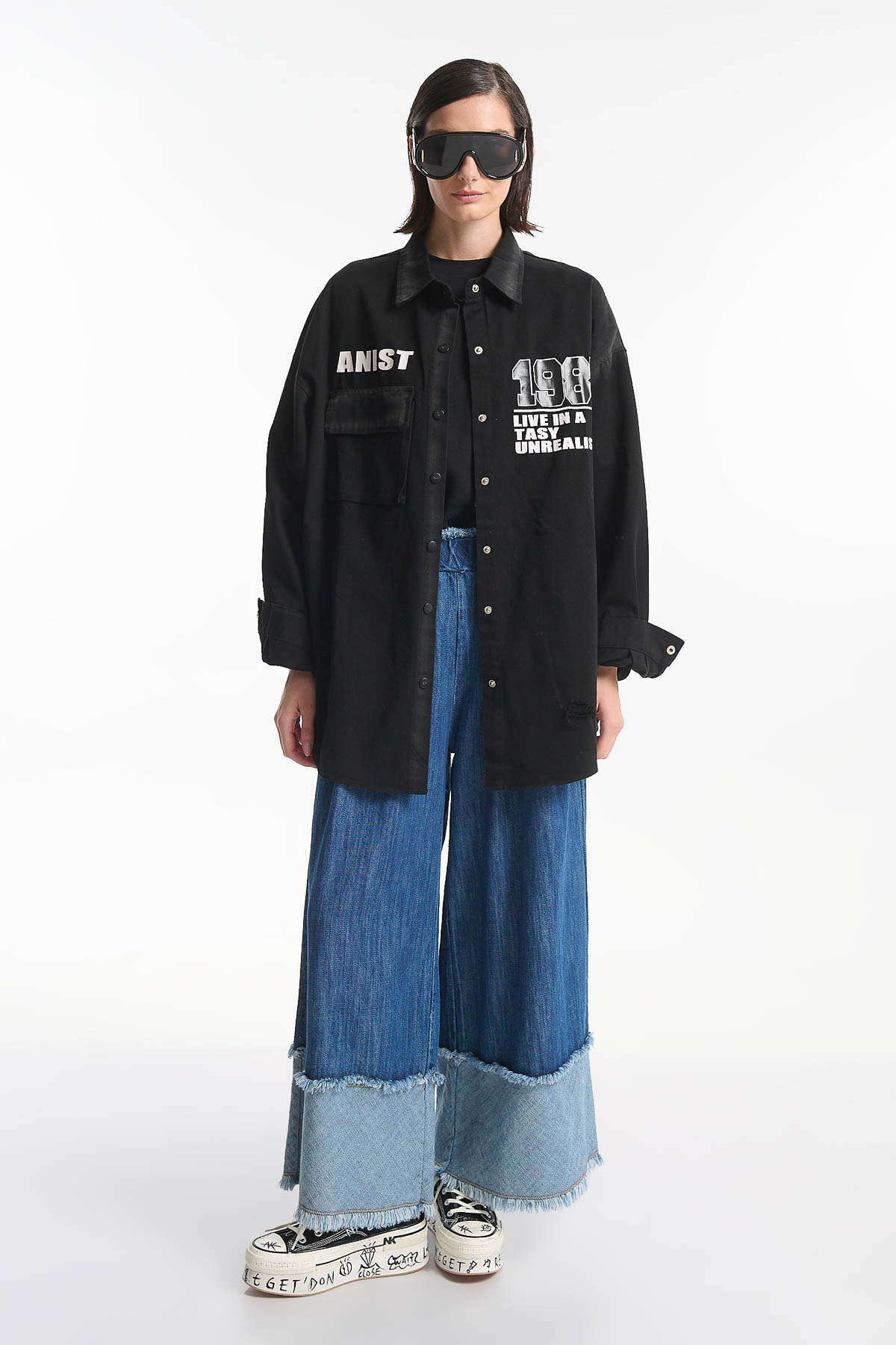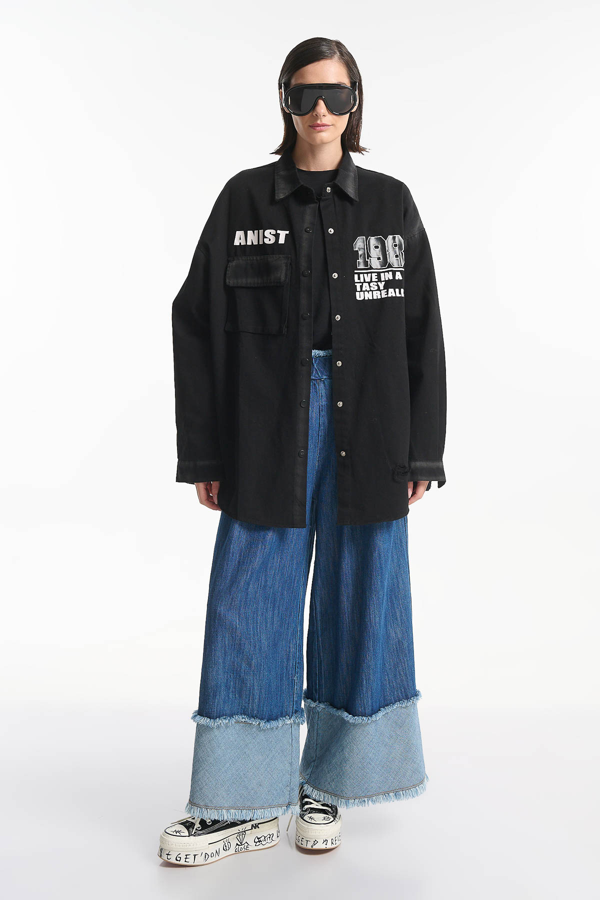 Jacket denim oversized σε μαύρο χρώμα, με statement τυπώματα σε λευκό και πολύχρωμα patches μπροστά και πίσω. Διαθέτει γιακά, κουμπιά κατά μήκος και μεγάλο τσεπάκι στο στήθος, προσδίδοντας streetwear χαρακτήρα. Το σχέδιο είναι ιδανικό για layering, προσφέροντας άνεση και στιλ για casual, καθημερινές εμφανίσεις με urban αισθητική. Μήκος : 85 cm . Καλύπτει στήθος έως 144 cm . Σύνθεση : 85% Cotton – 15% Polyester.