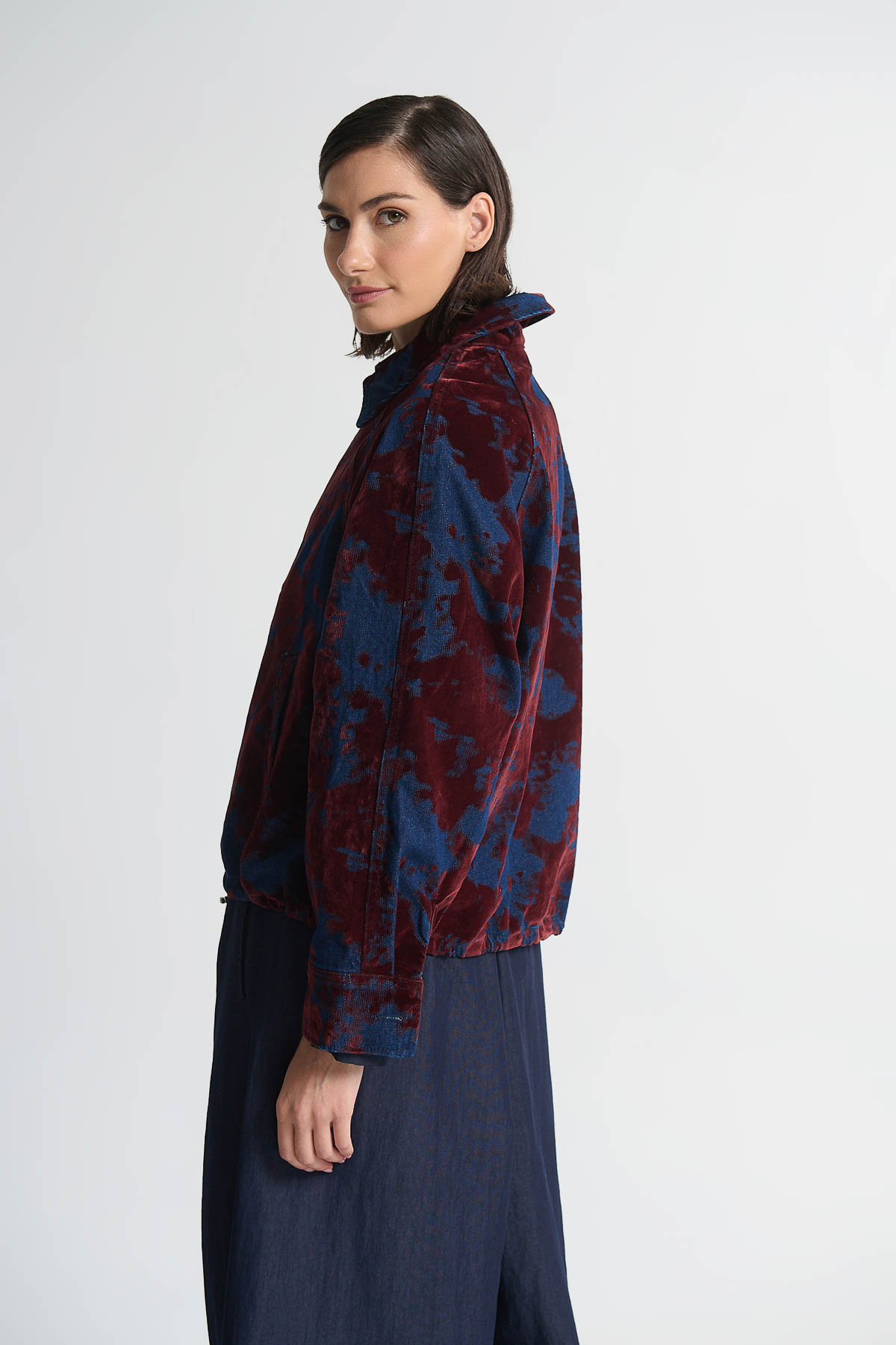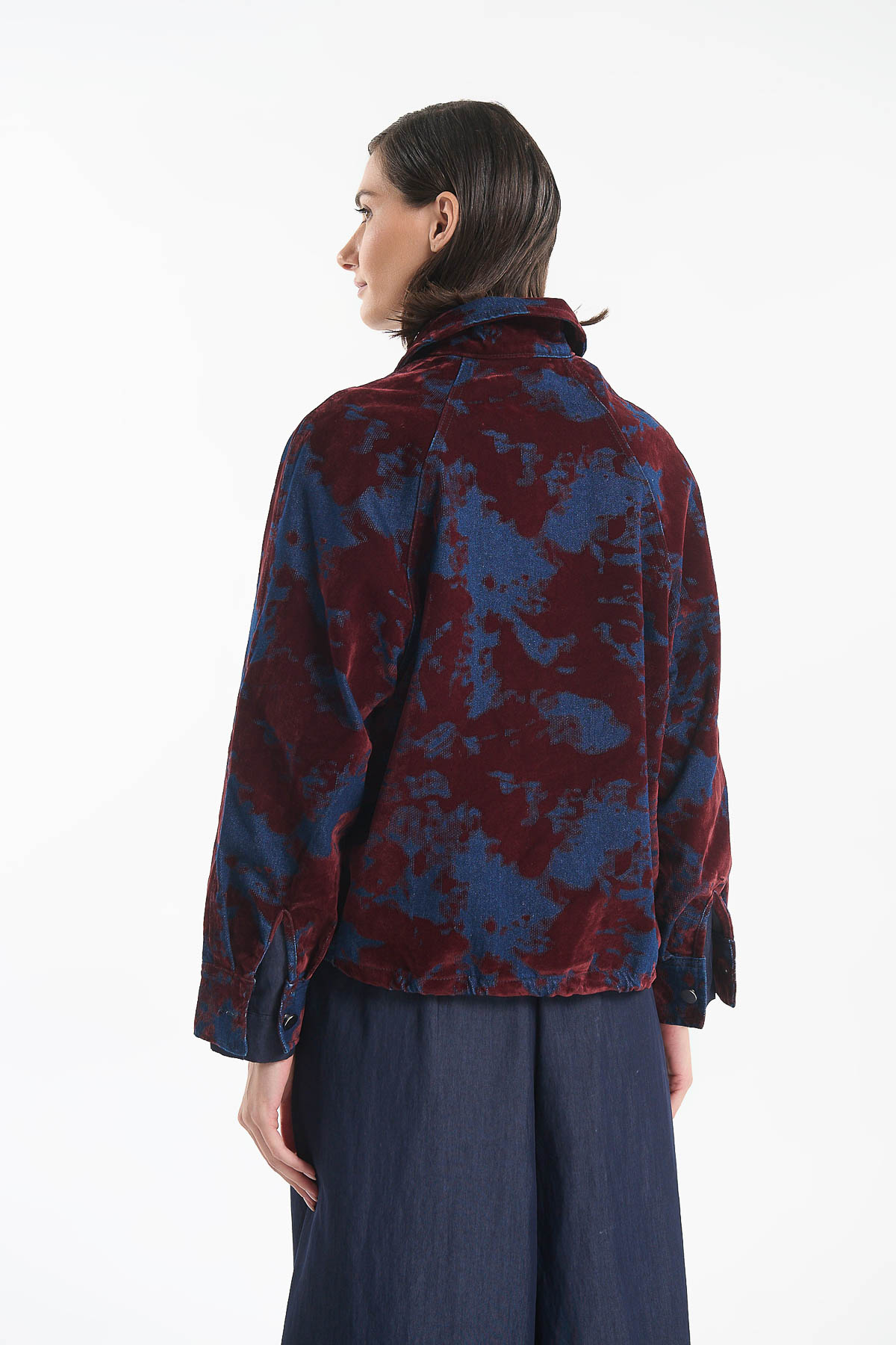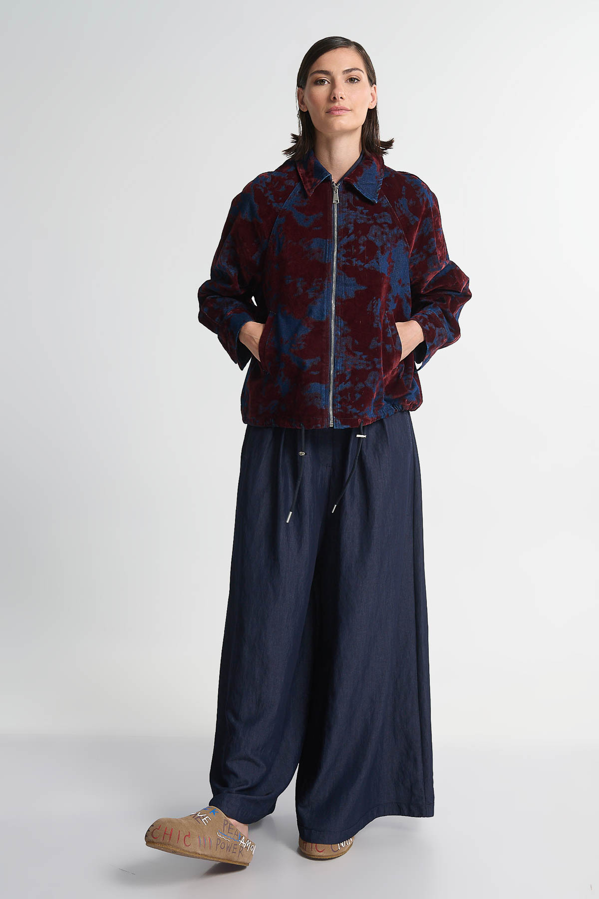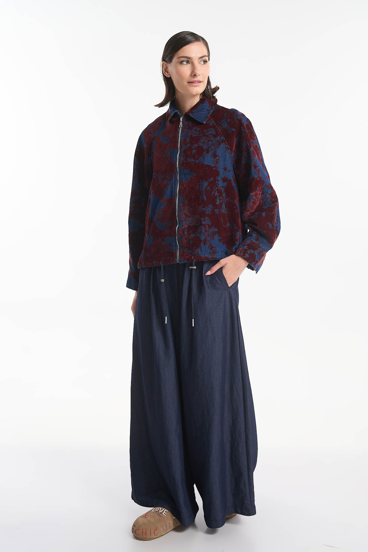 Αυτό το μοναδικό jacket συνδυάζει την αυθεντικότητα του denim με την πολυτέλεια του velvet. Η ιδιαίτερη διχρωμία σε βαθύ μπορντό και μπλε δημιουργεί ένα εντυπωσιακό μοτίβο, προσθέτοντας ένταση και στυλ σε κάθε σας εμφάνιση.Διαθέτει φερμουάρ στο κέντρο για πρακτικότητα, κλασικό γιακά και τσέπες στο πλάι, ενώ η χαλαρή γραμμή του προσφέρει άνεση και ευκολία στην κίνηση. Ιδανικό για layered outfits, συνδυάζεται τέλεια με παντελόνες ή τζιν για ένα κομψό, σύγχρονο urban look. Διαθέτει εσωτερική επένδυση φόδρας . Μήκος : 62 cm . Καλύπτει στήθος έως 108 cm . Σύνθεση : 90% Cotton – 10% Polyester.