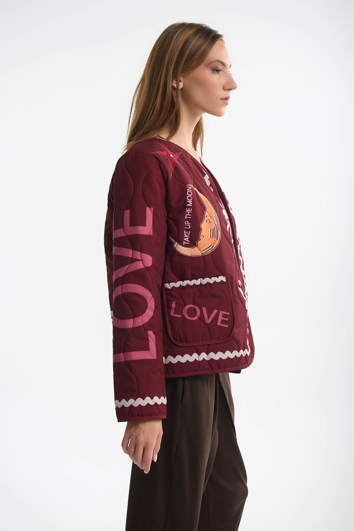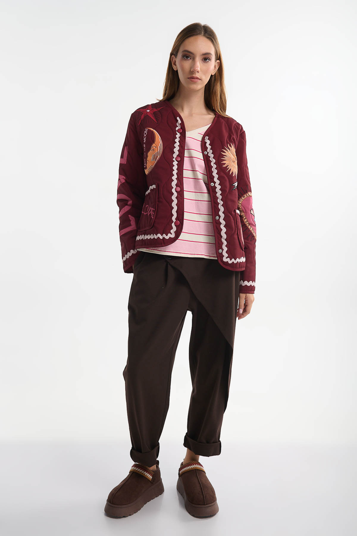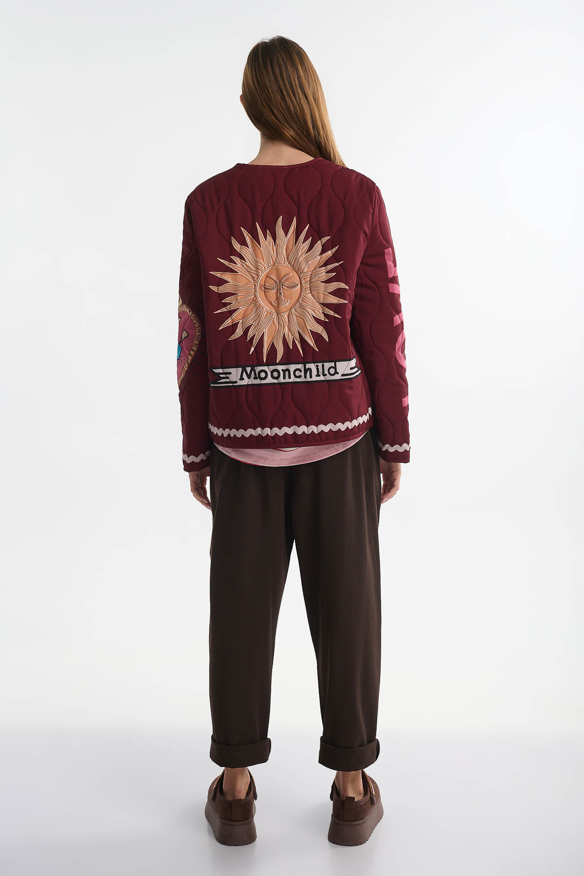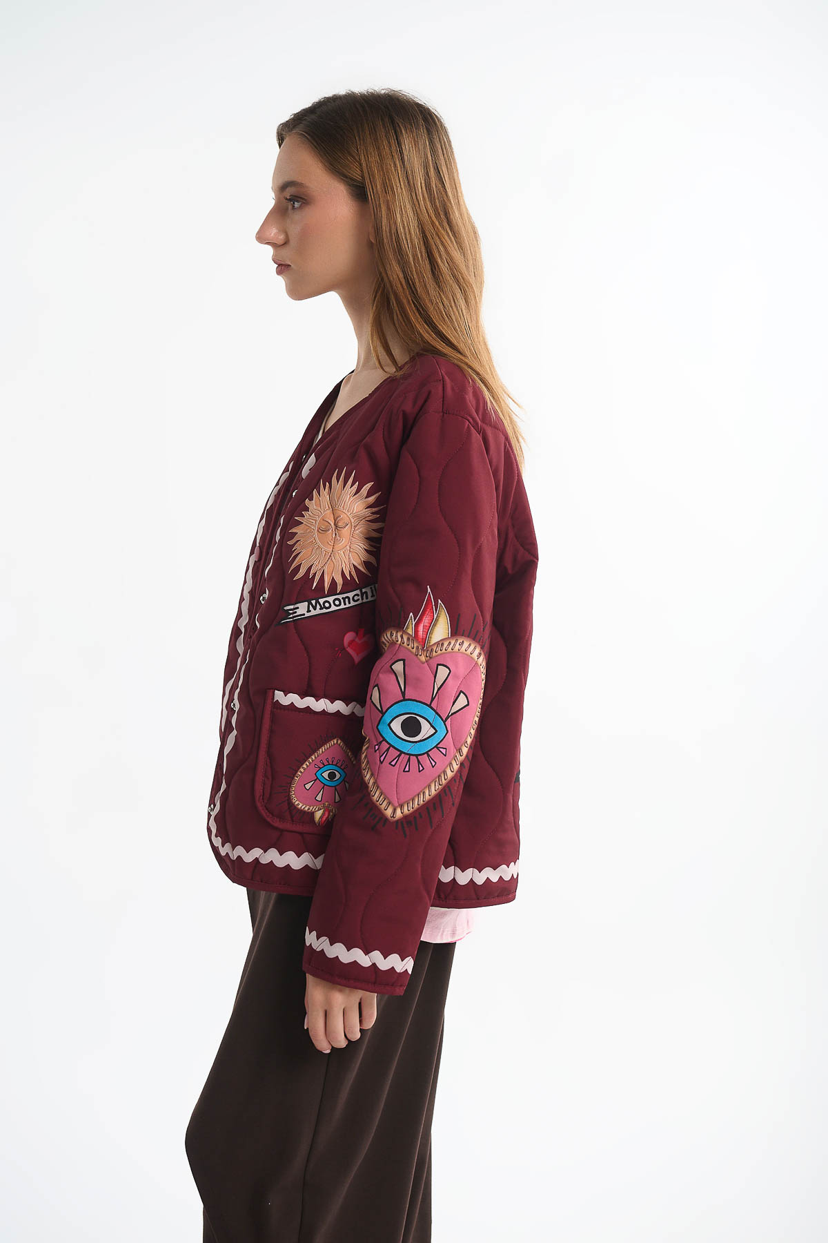 Αναβαθμίστε το στιλ σας με το καπιτονέ jacket “Moonchild”, ένα statement κομμάτι που συνδυάζει μοναδικό design και άνεση. Διακοσμημένο με print κεντήματα ηλίου, φεγγαριού και eye motifs, φέρνει μια παιχνιδιάρικη αλλά και πολυτελή αισθητική, ιδανική για τις μέρες που θέλετε να ξεχωρίσετε.Ιδανικό για: Casual day looks, street style εμφανίσεις, cozy βόλτες στην πόλη . Διαθέτει μεγάλες τσέπες μπροστά , κλείνει με κουμπιά clips . Μήκος : 62 cm . Καλύπτει στήθος έως 110 cm .