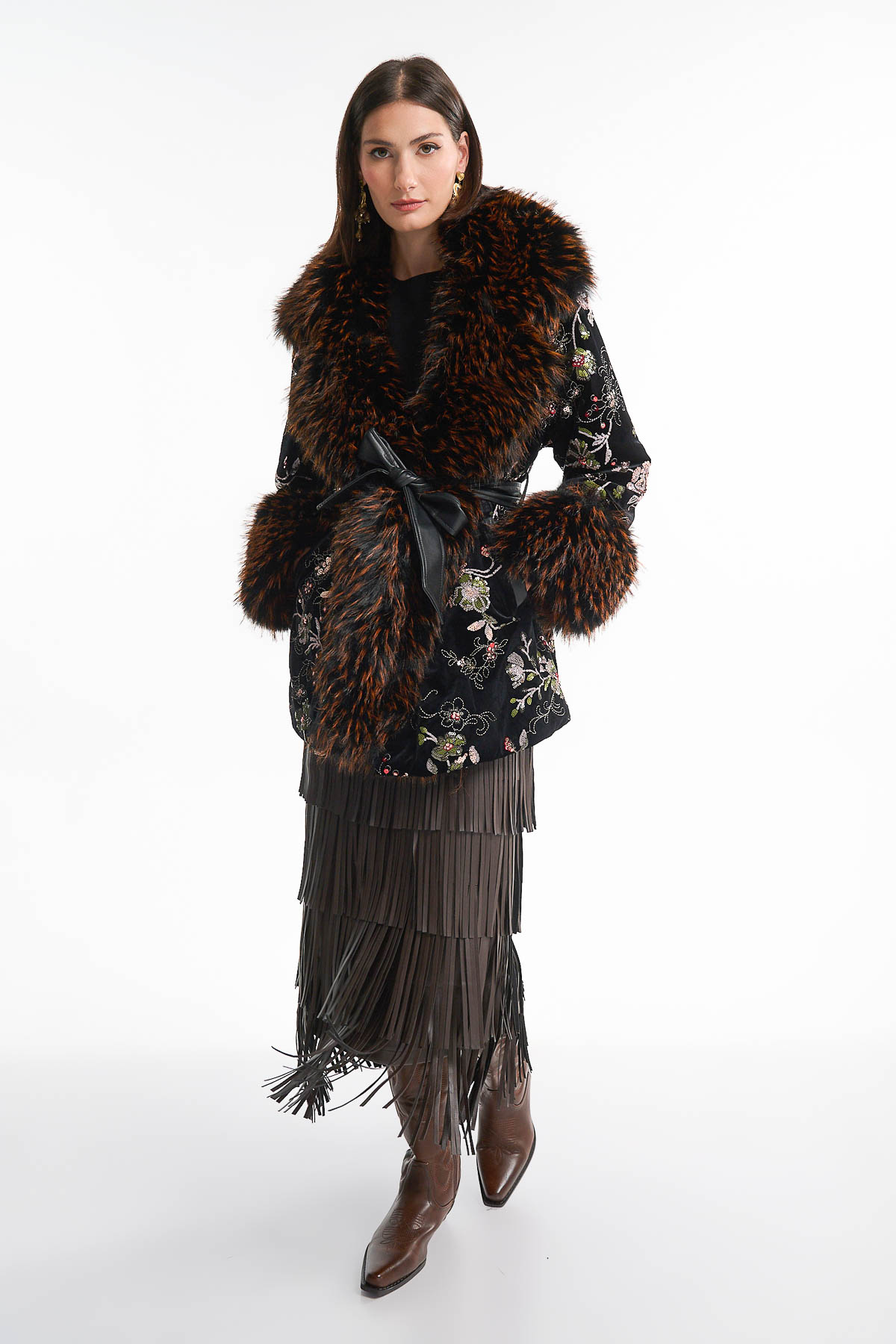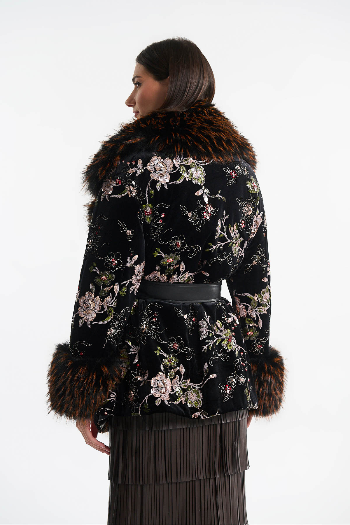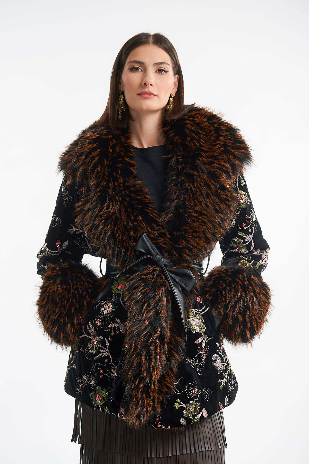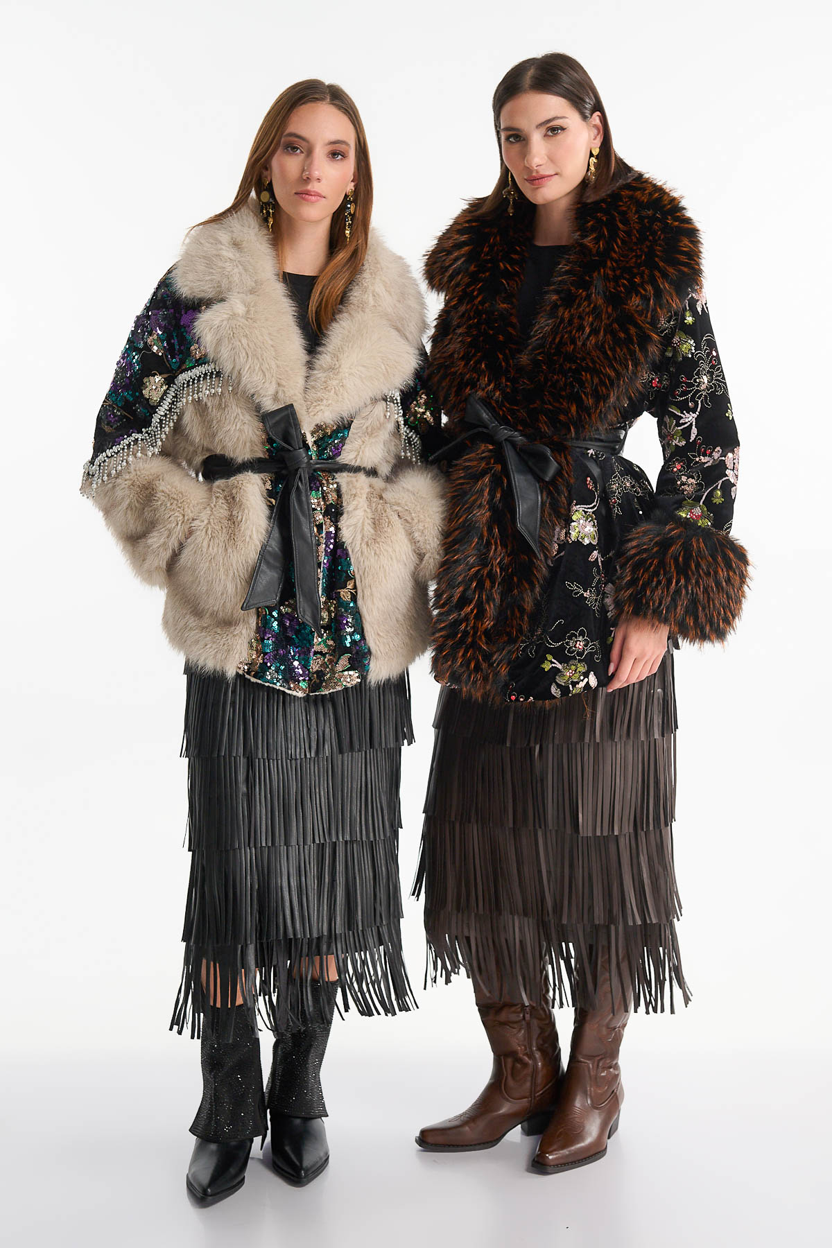 Το jacket Kimono Velvet Sequin συνδυάζει πολυτέλεια με εντυπωσιακό design. Από βελούδο με floral κεντήματα από παγιέτες, δημιουργεί ένα statement κομμάτι που ξεχωρίζει σε κάθε εμφάνιση. Η eco γούνα με τις πορτοκαλί λεπτομέρειες στο γιακά και στα μανίκια προσθέτει ένταση και θηλυκότητα, ενώ η εσωτερική φόδρα προσφέρει άνεση και ζεστασιά. Διαθέτει πλαϊνές τσέπες για πρακτικότητα και μπορεί να φορεθεί κλειστό ή ανοιχτό, ανάλογα με το styling που επιθυμείς. Μήκος : 90 cm . Σύνθεση : 95% Polyester – 5% Elasthan .
