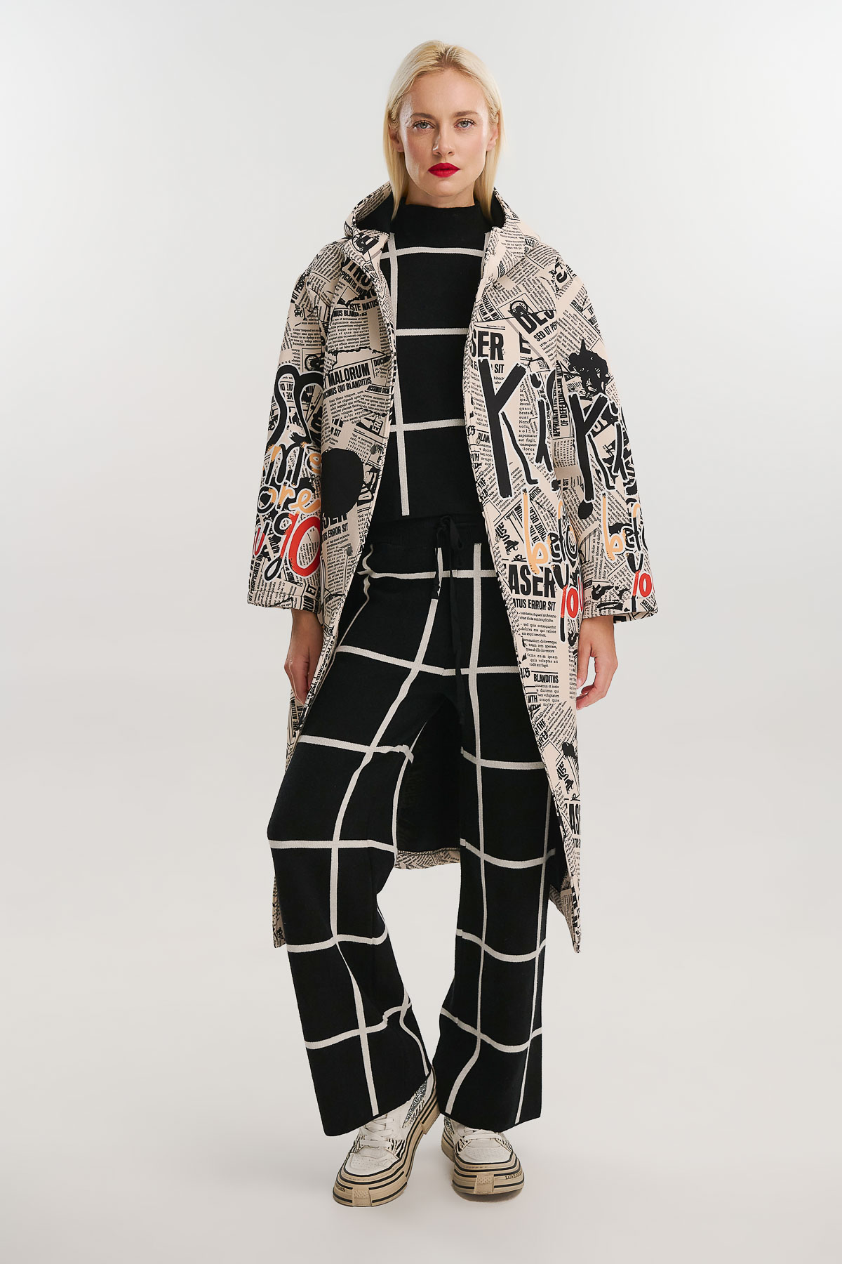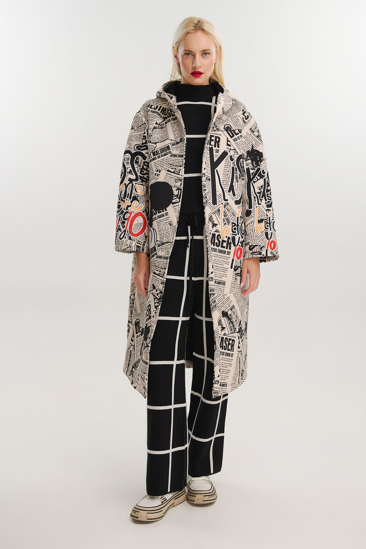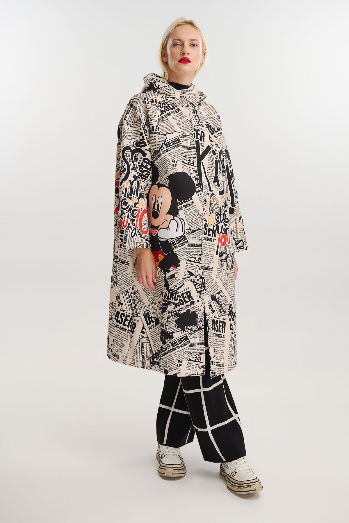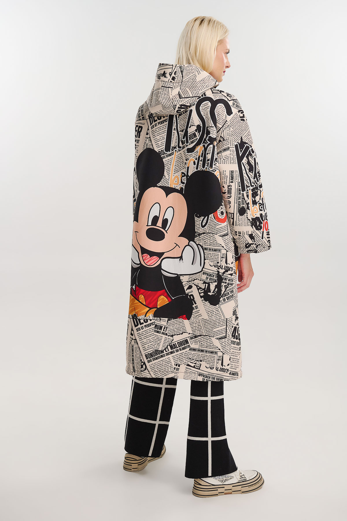 Μακρύ jacket από scuba ύφασμα με μοναδικό newspaper print και σχέδιο Mickey που προσθέτει παιχνιδιάρικη και καλλιτεχνική πινελιά. Η ιδιαίτερη εκτύπωση σε όλη την επιφάνεια δημιουργεί ένα statement κομμάτι που συνδυάζει street style και pop αισθητική.