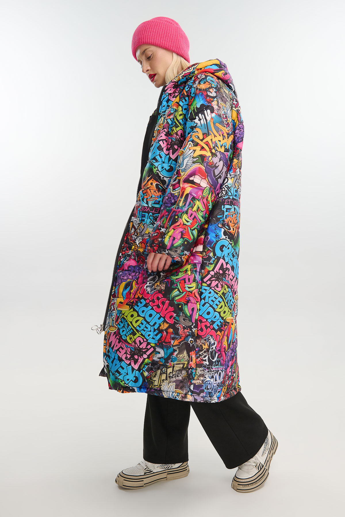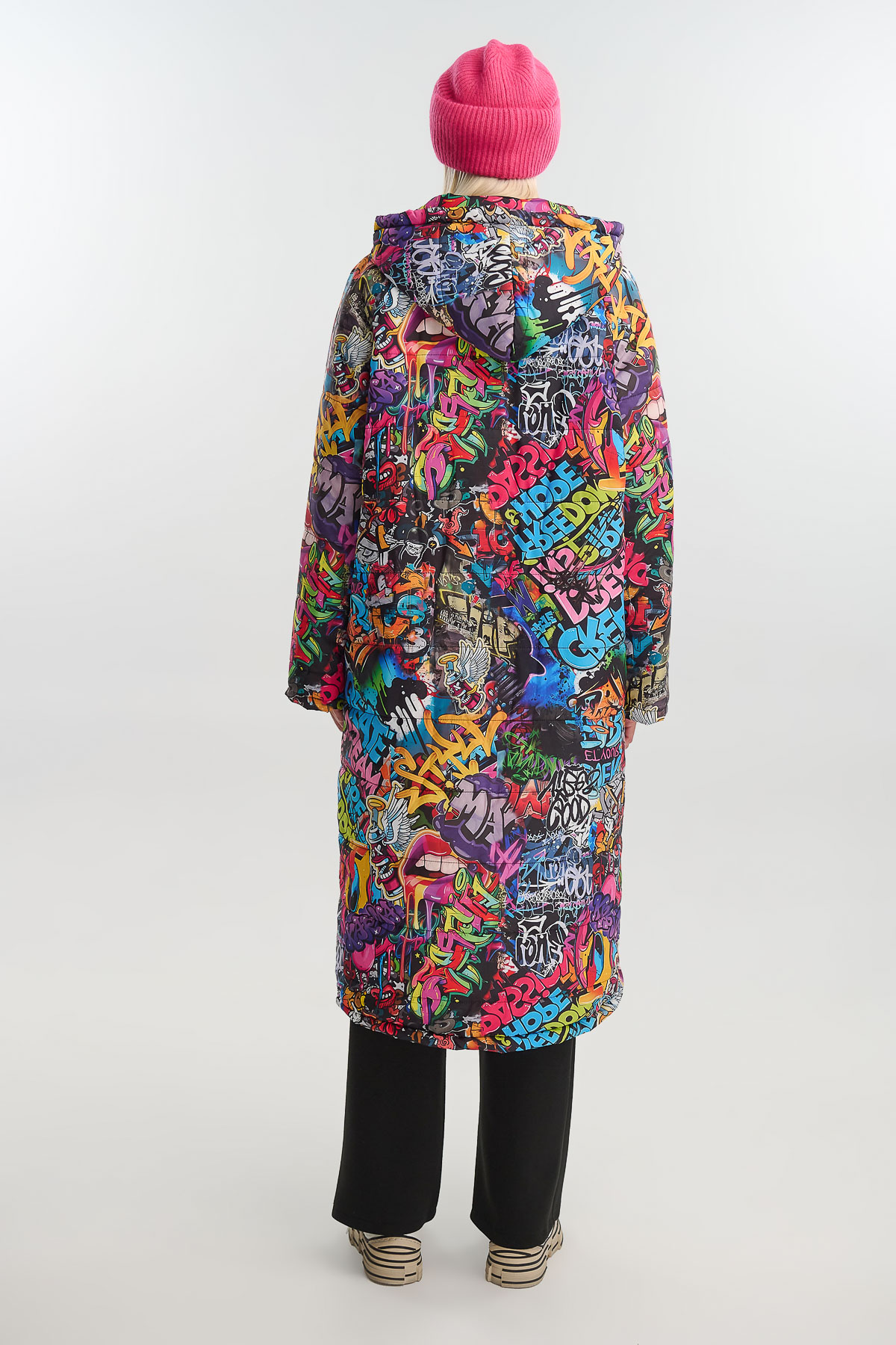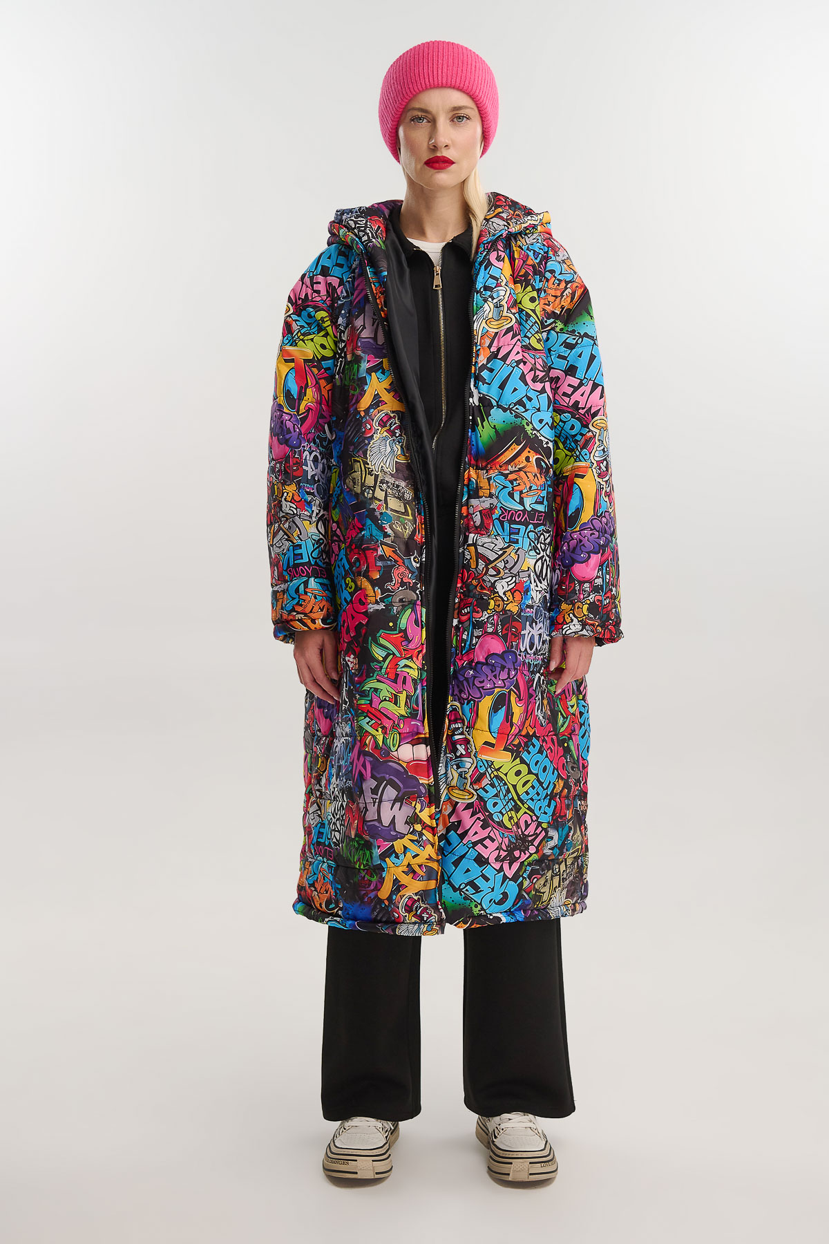 Μακρύ puffer jacket με graffiti print που ξεχωρίζει για τη ζωντάνια και την urban αισθητική του. Το σχέδιο εμπνευσμένο από την τέχνη του δρόμου συνδυάζει εκρηκτικά χρώματα, φράσεις και σύμβολα, δημιουργώντας μια μοναδική streetwear διάθεση.