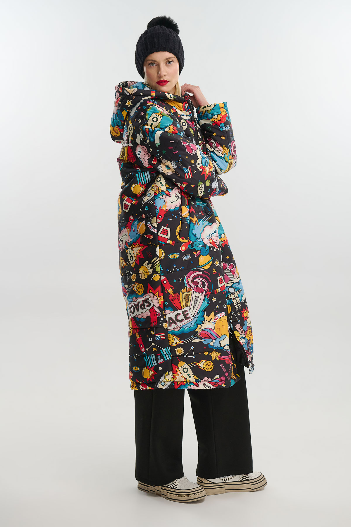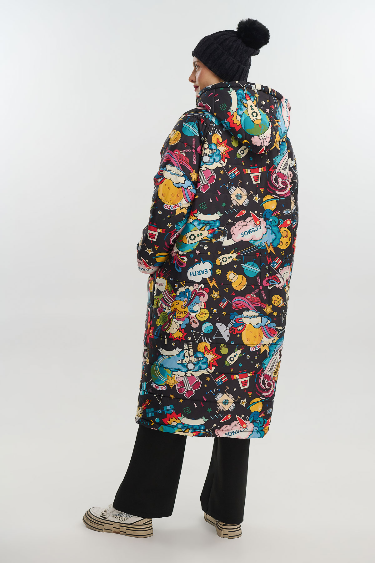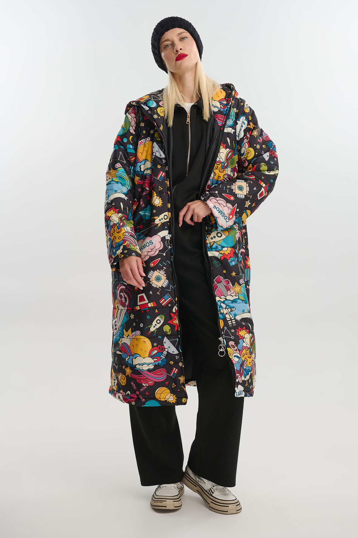 Μακρύ puffer jacket με παιχνιδιάρικο comic print εμπνευσμένο από το διάστημα. Οι πολύχρωμες φιγούρες, οι πλανήτες και τα σχέδια σε μαύρη βάση δημιουργούν ένα statement look με καλλιτεχνική διάθεση και pop αισθητική.