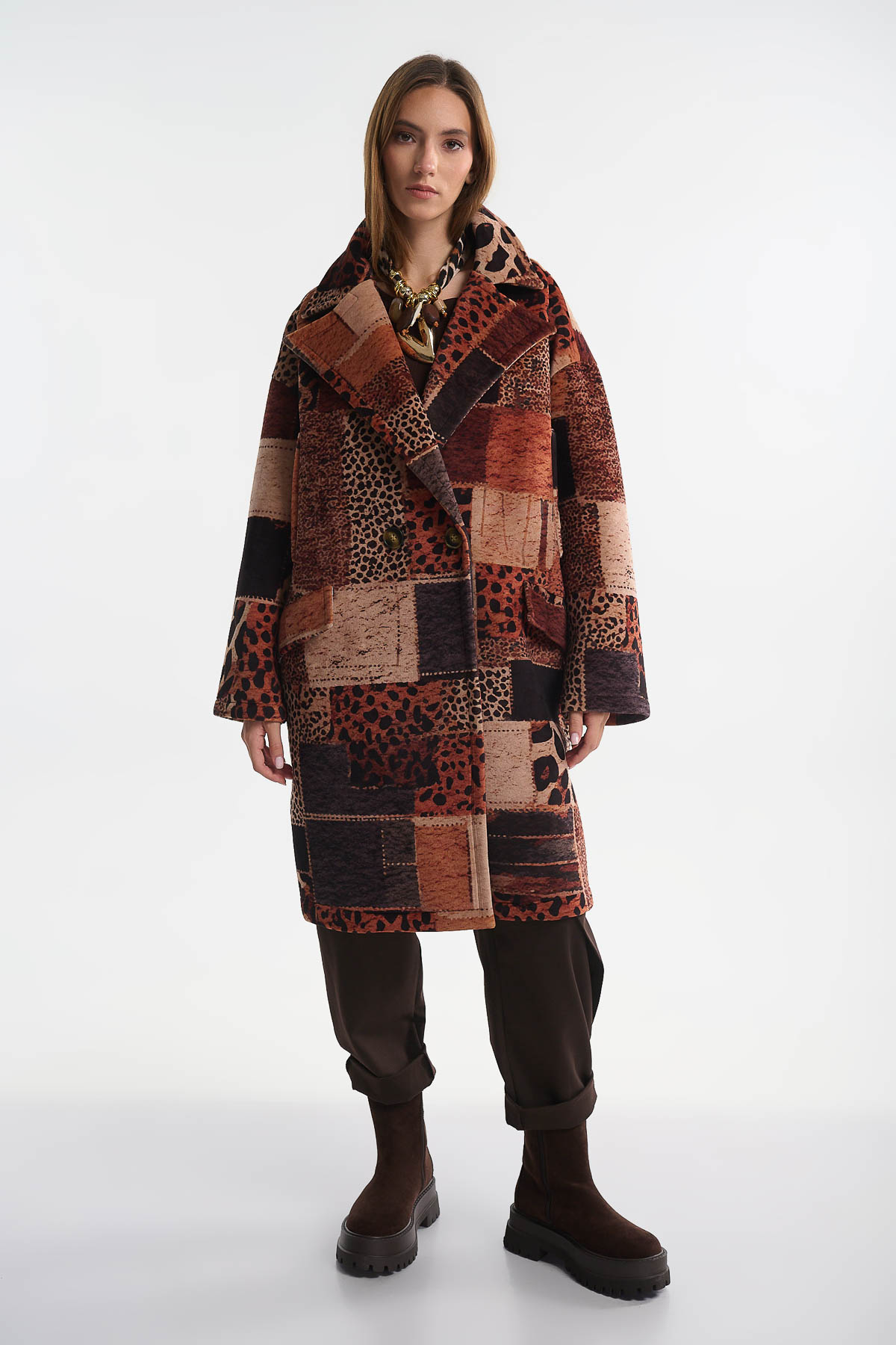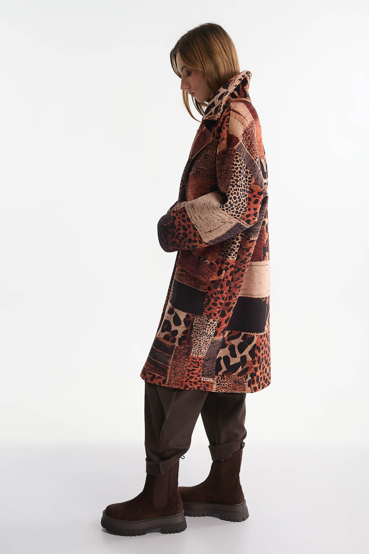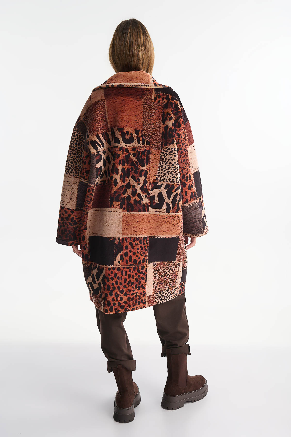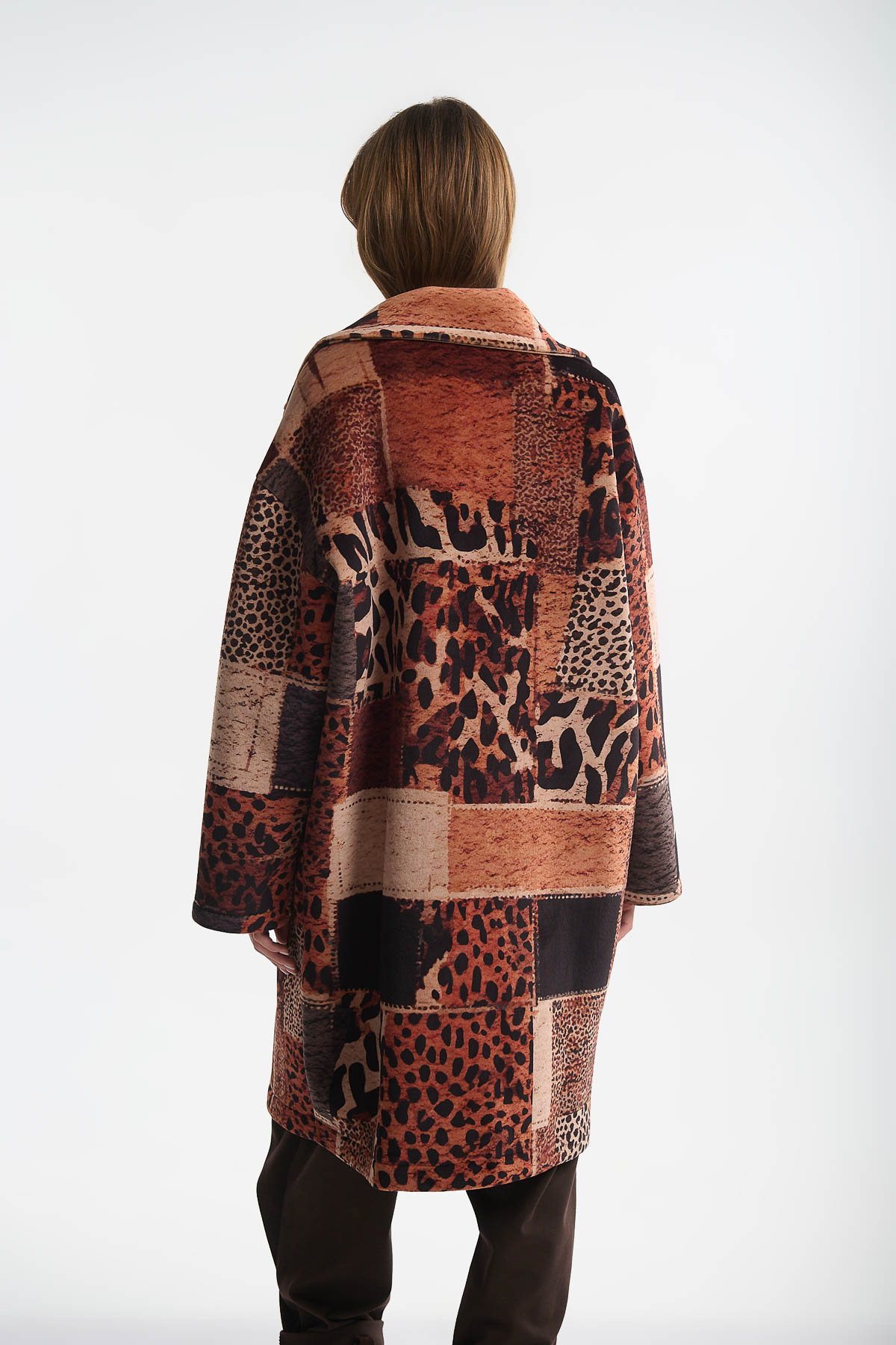Αναδείξτε το στιλ σας με αυτό το μοναδικό πανωφόρι σε patchwork design που συνδυάζει τολμηρά animal prints σε ζεστές γήινες αποχρώσεις. Κατασκευασμένο από scuba ύφασμα, προσφέρει άνεση και κομψότητα, ενώ η oversized γραμμή του το καθιστά ιδανικό για layering τις κρύες μέρες.Γραμμή: Oversized για μοντέρνο, urban look . Κλείσιμο: Διπλόκουμπο για extra στιλ . Συνδυάστε το με total black outfit και chunky boots για εντυπωσιακό street style look. Μήκος : 102 cm . Διαθέτει πλαϊνές τσέπες .
