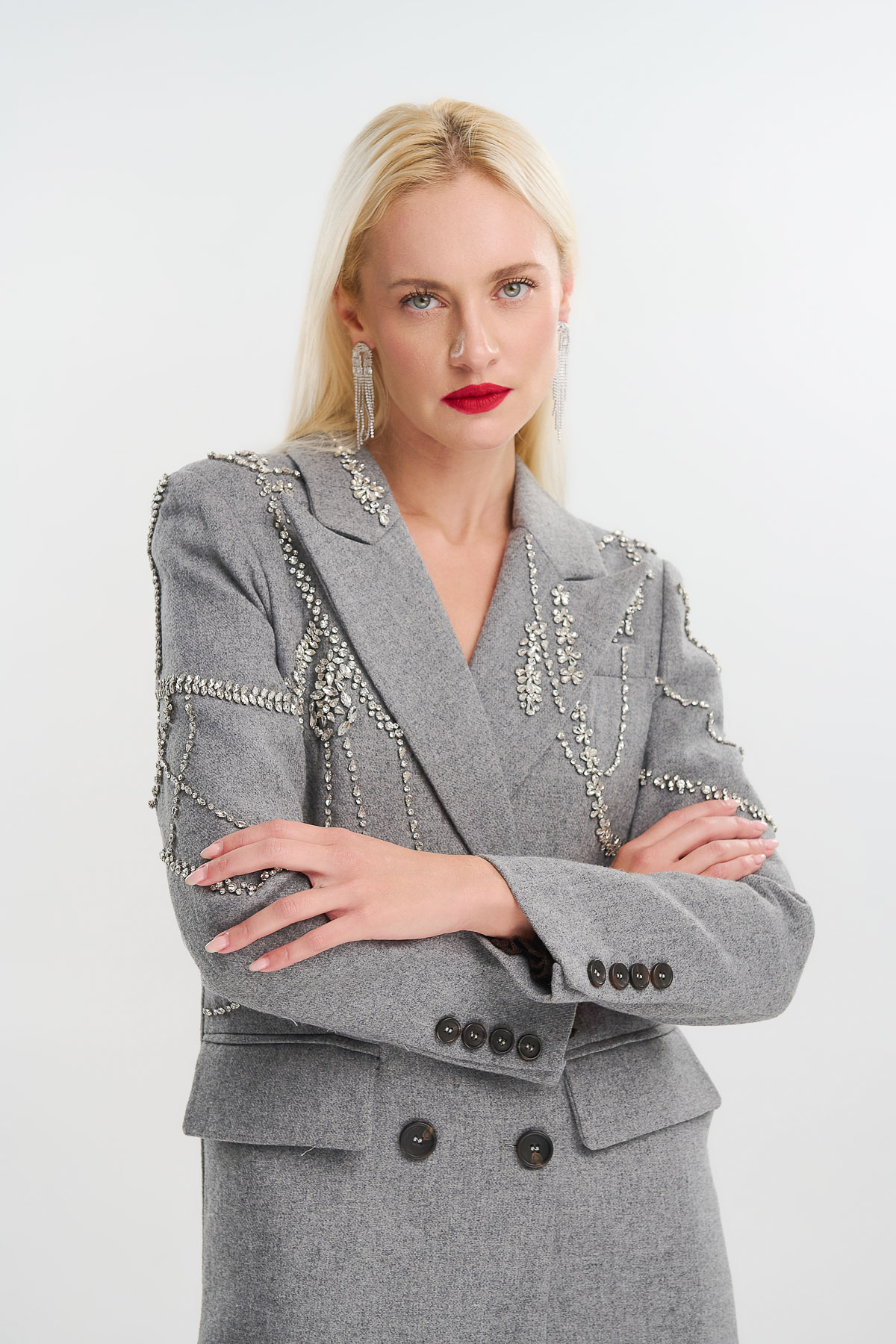 Ένα εντυπωσιακό σακάκι που συνδυάζει την πολυτέλεια με τη διαχρονική κομψότητα. Το μάλλινο ύφασμα με εσωτερική φόδρα προσφέρει δομημένη εφαρμογή και ζεστασιά, ενώ το περίτεχνο κέντημα με κρύσταλλα αναδεικνύει κάθε εμφάνιση, προσθέτοντας λάμψη και χαρακτήρα.